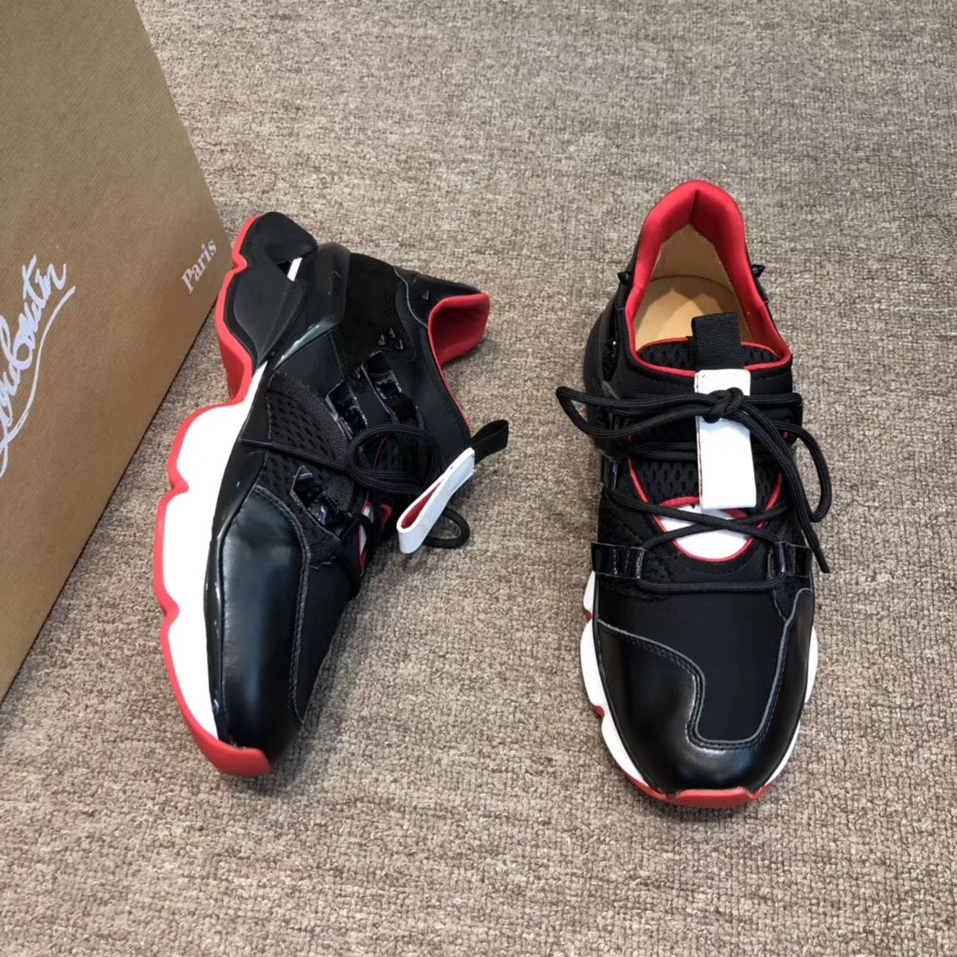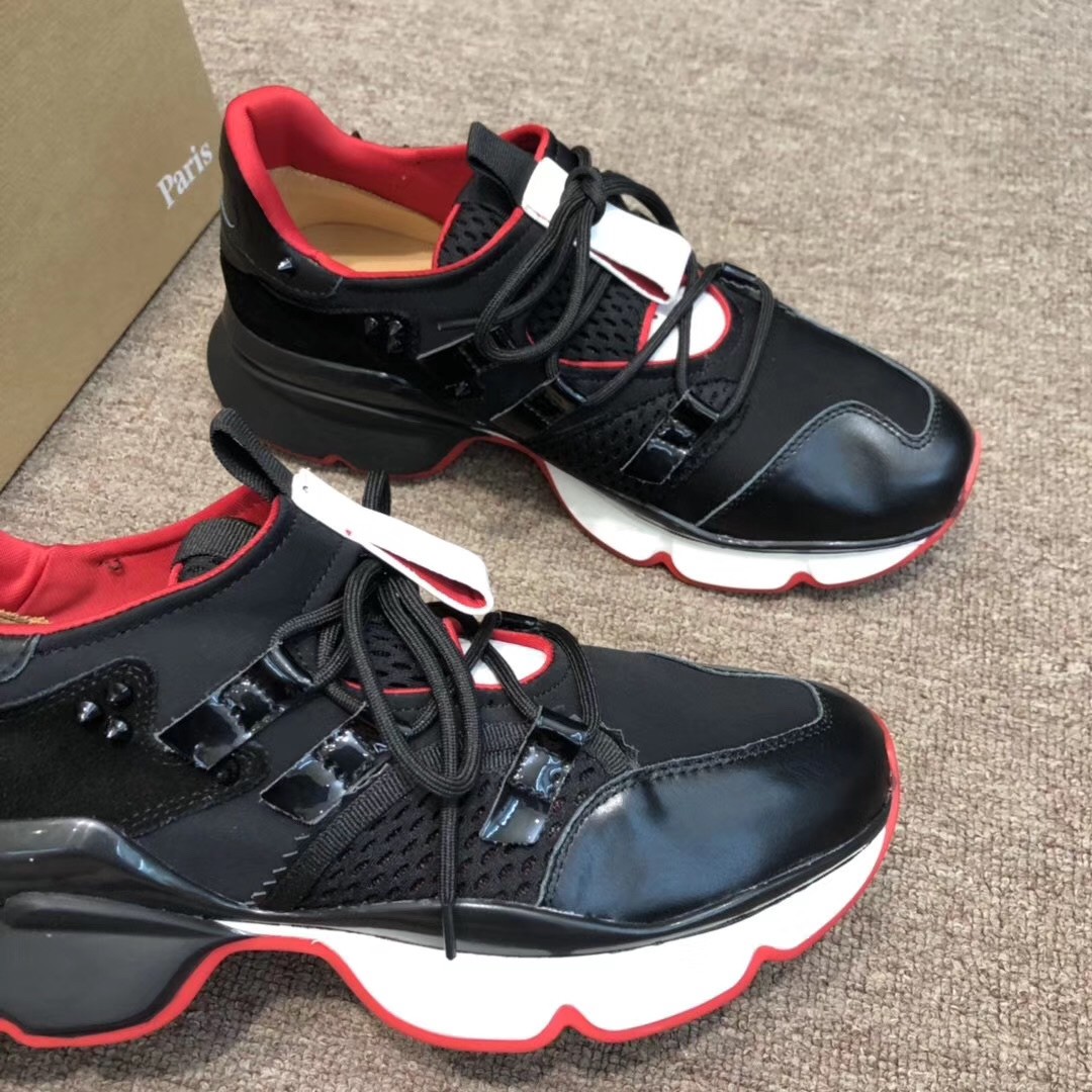 A couture model, the Runner Donna sneaker reveals the unique savoir-faire of the Maison Christian Louboutin. In black leather, mesh and Neoprene, it features an assembly of twenty panels on the upper and six on the sole. In a play on light and textures, it wears its silhouette with brilliance.