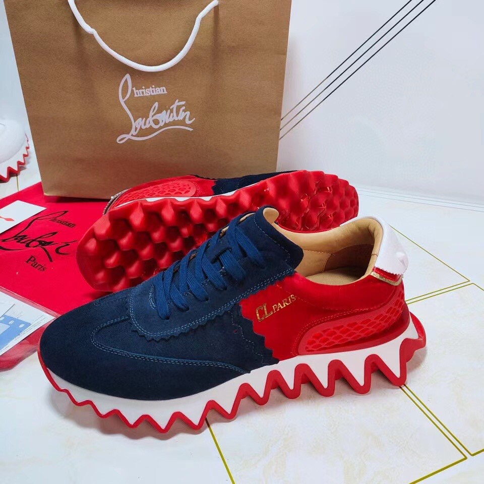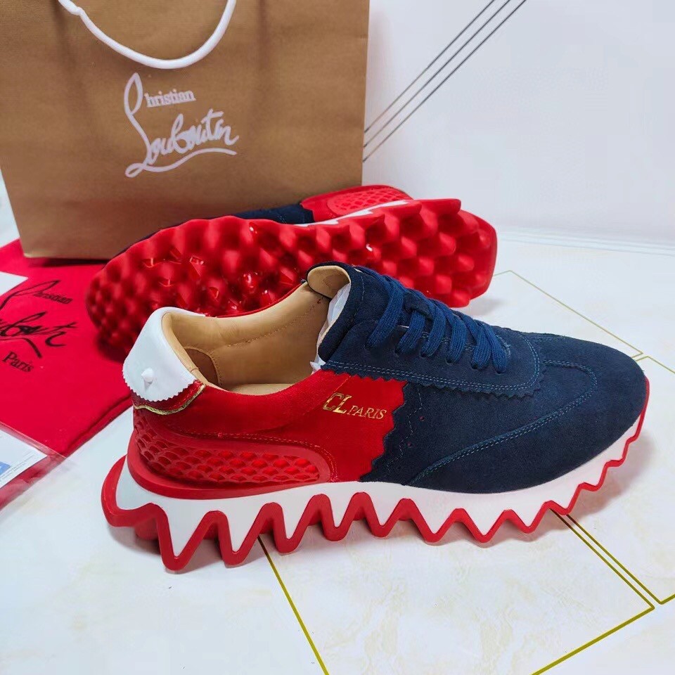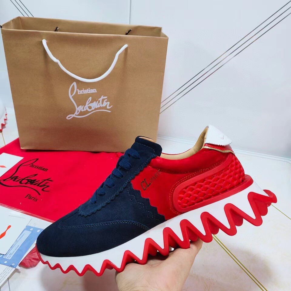 The Loubishark low sneaker comes with a serrated sole and stands out for its architectural design, drawing its inspiration from the world of running. Adorned with geometrically shaped borders, its two-colour upper made entirely of red and dark blue velvet calfskin is enhanced by an openwork heel cap and a border in lamé nappa leather.