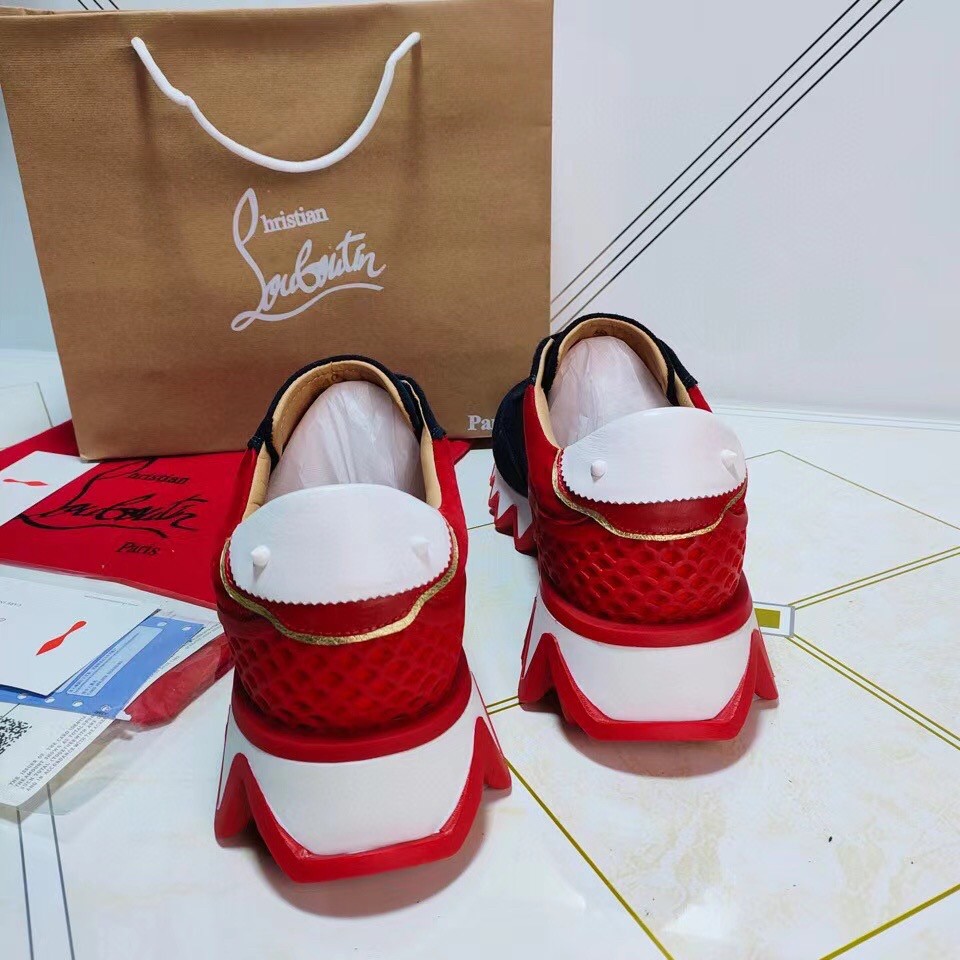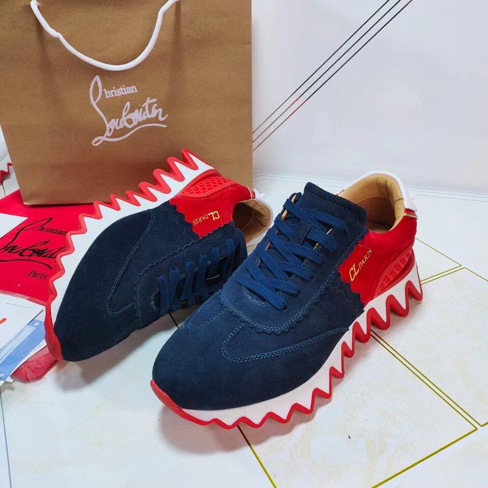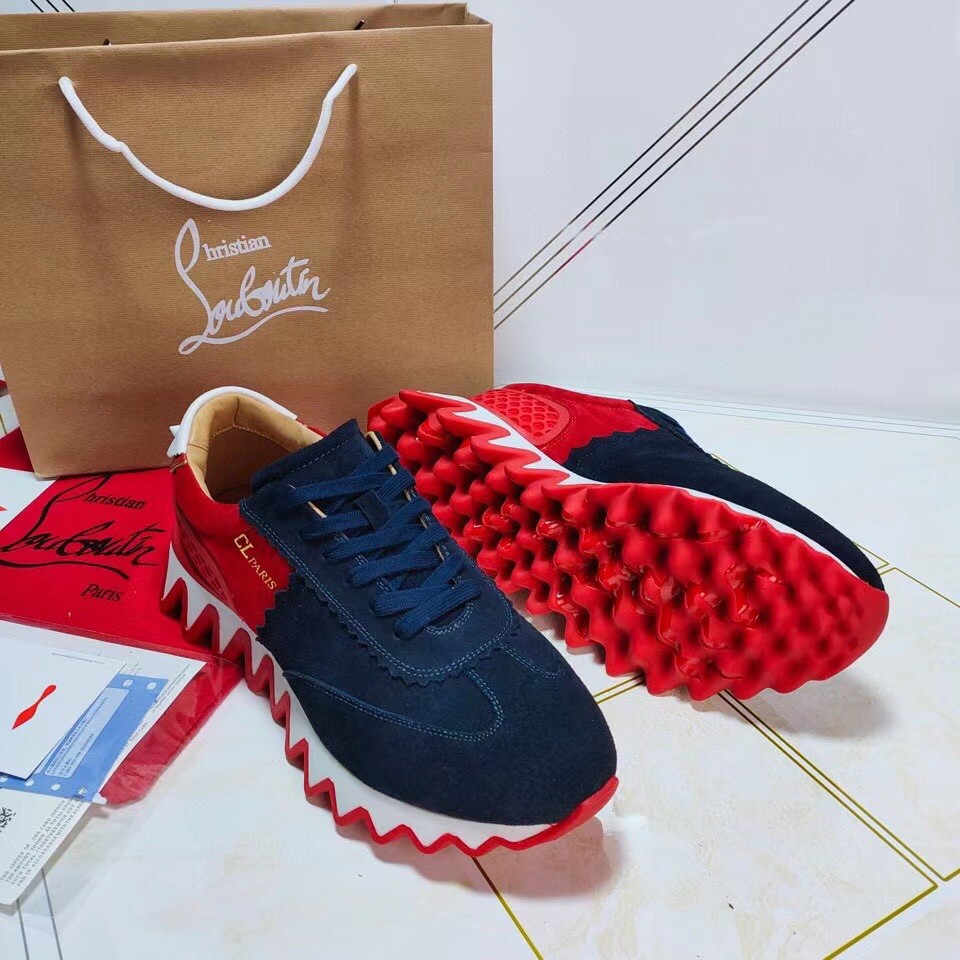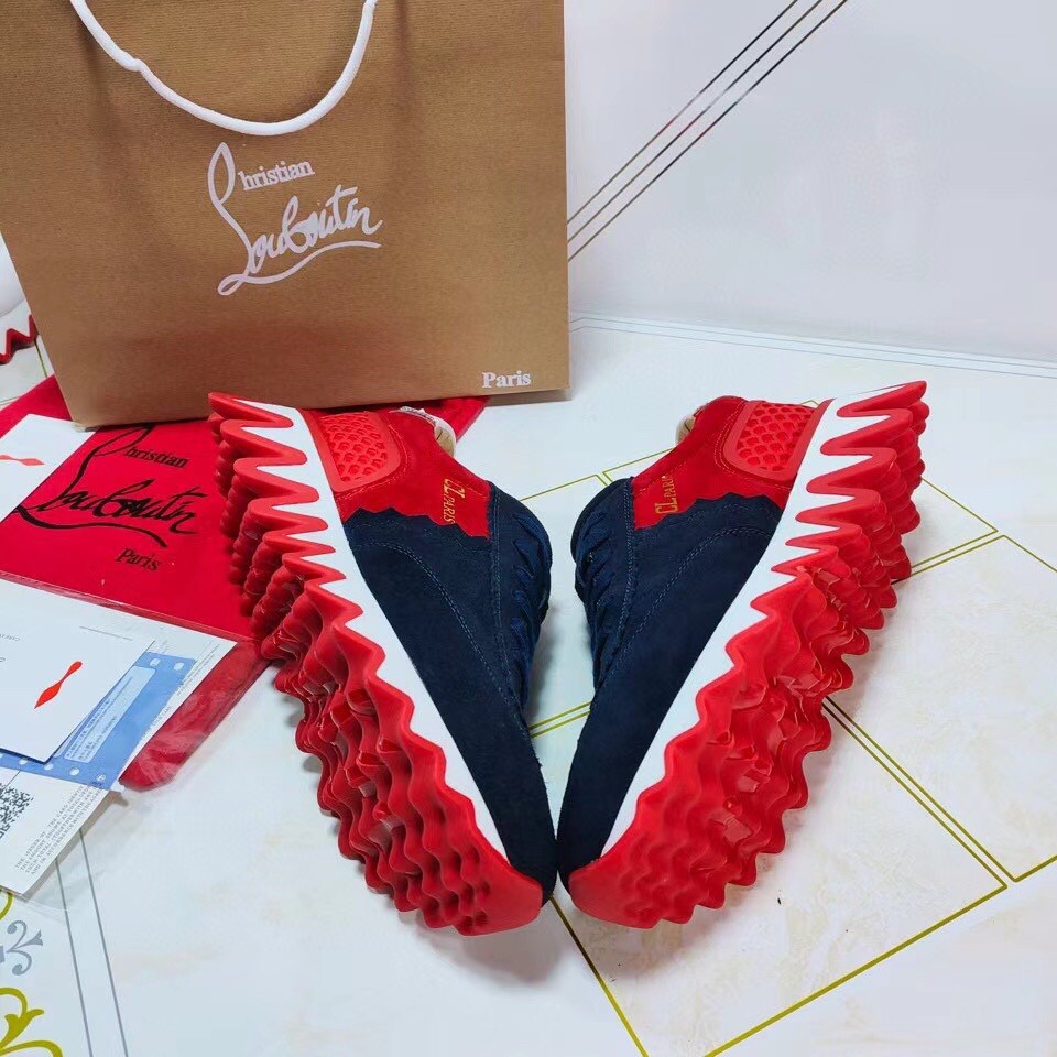 The Loubishark low sneaker comes with a serrated sole and stands out for its architectural design, drawing its inspiration from the world of running. Adorned with geometrically shaped borders, its two-colour upper made entirely of red and dark blue velvet calfskin is enhanced by an openwork heel cap and a border in lamé nappa leather.