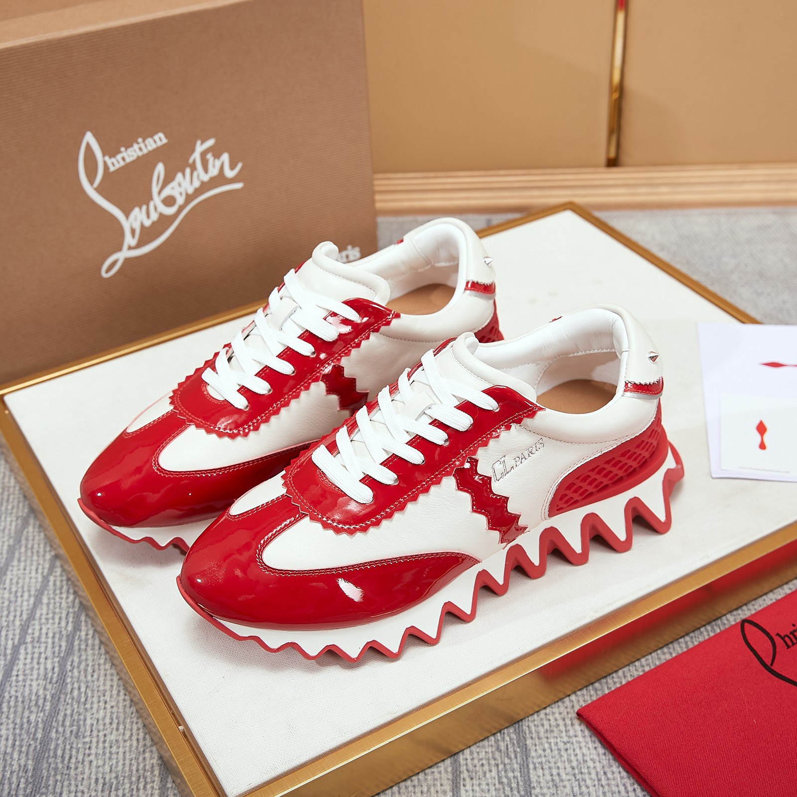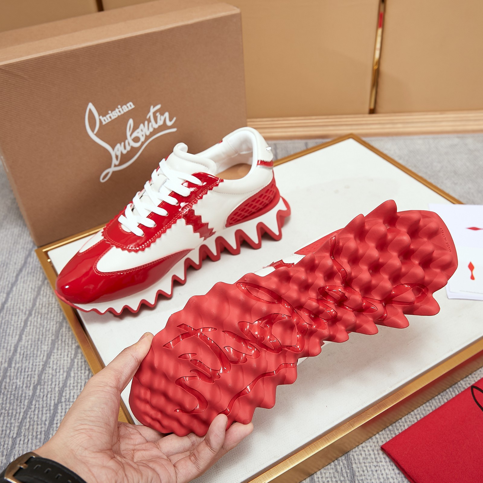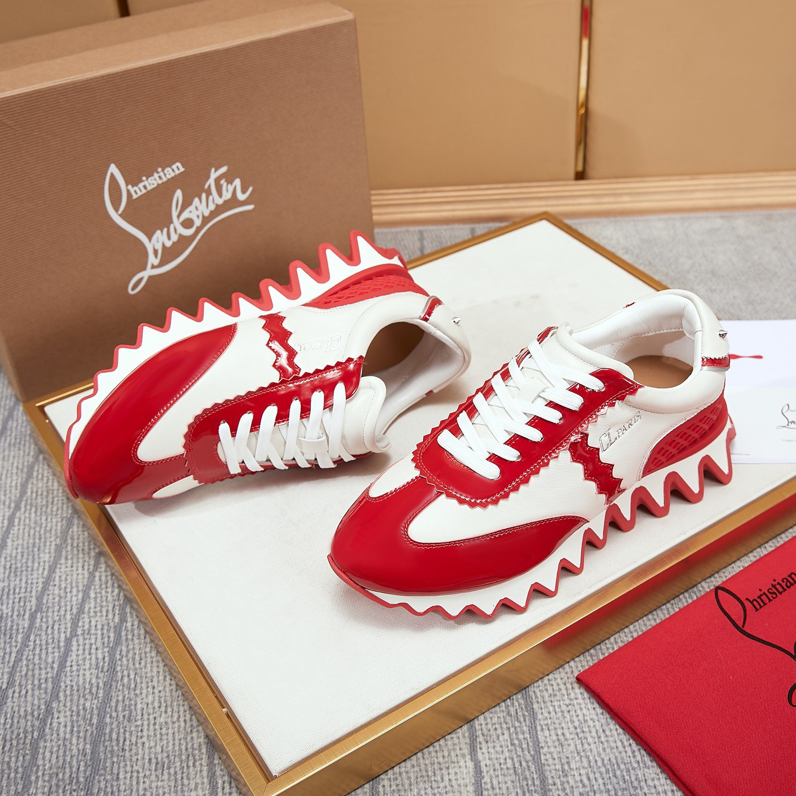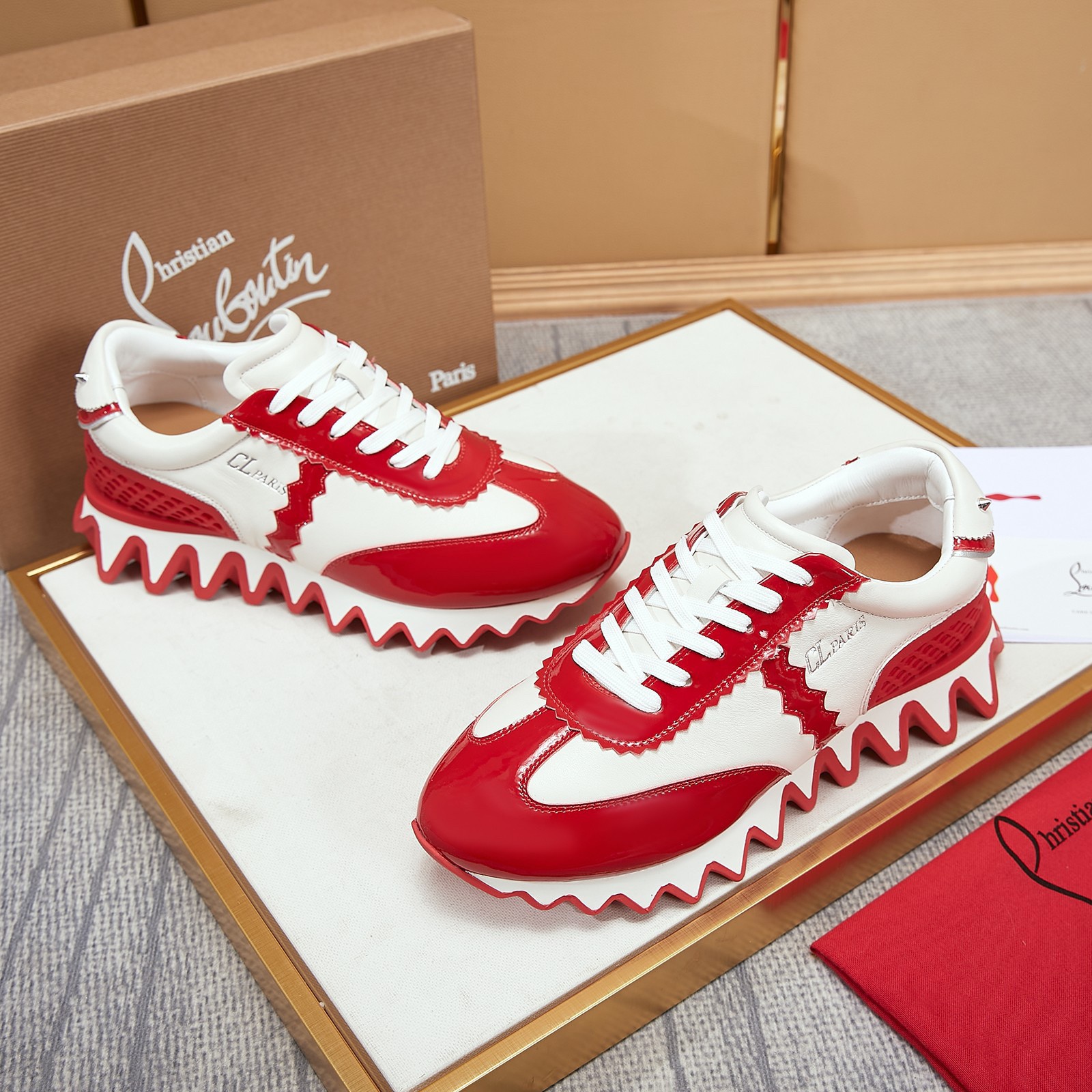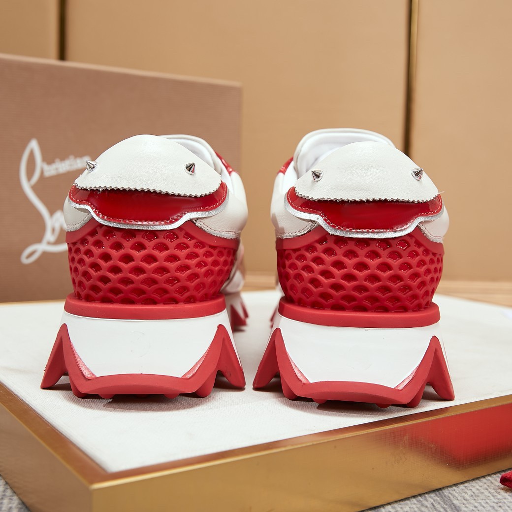 Showcasing Maison Christian Louboutin’s creativity, the Loubishark sneaker is highly original. This daring model sits on a red and white rubber sole reminiscent of shark teeth. Finished with notched edges, the panels combine red neoprene, white leather and Psychic Loubi red patent calf leather with an iridescent hue. Embellished with the initials CL, the back also features the signature metallic spikes.
