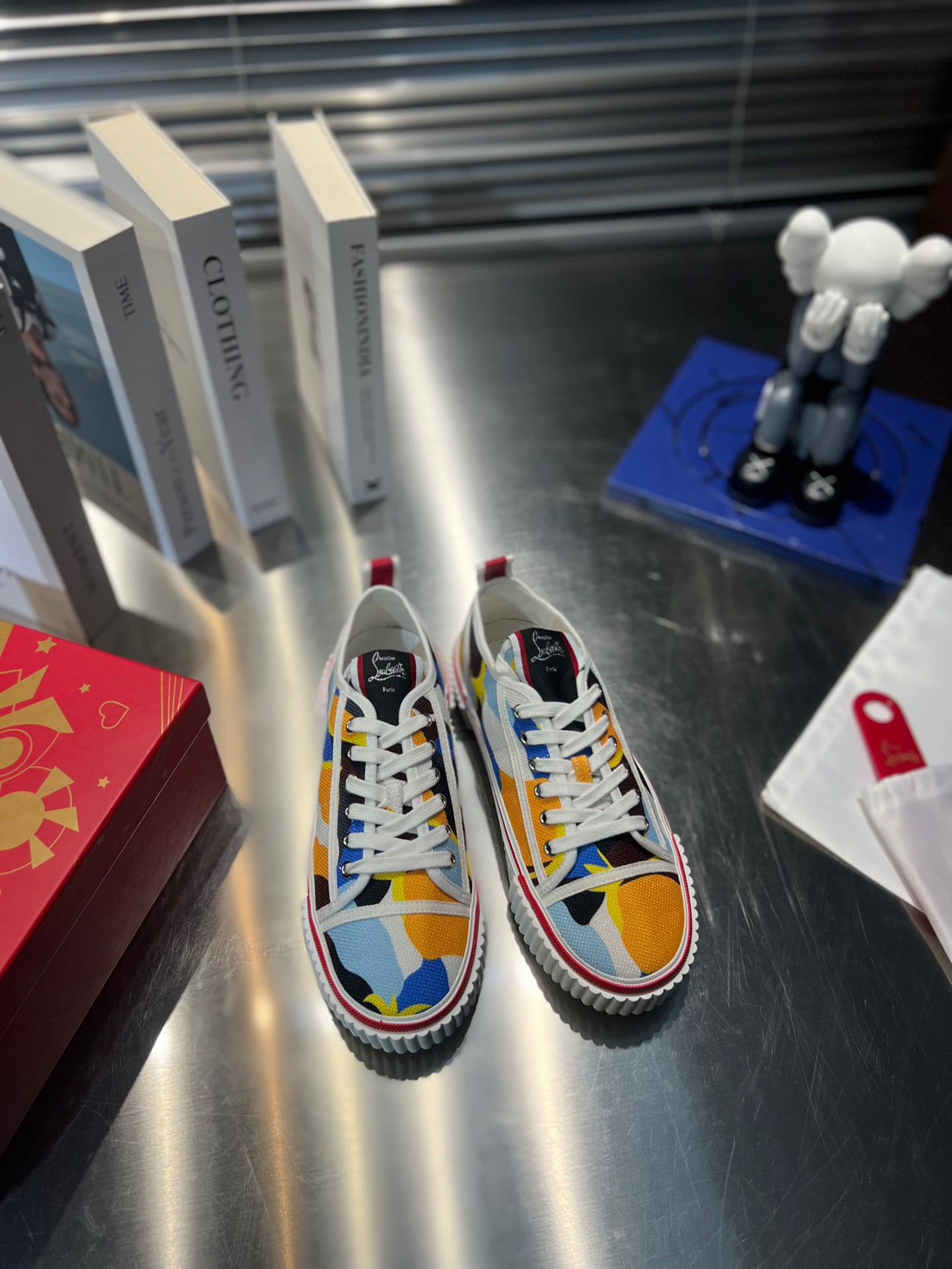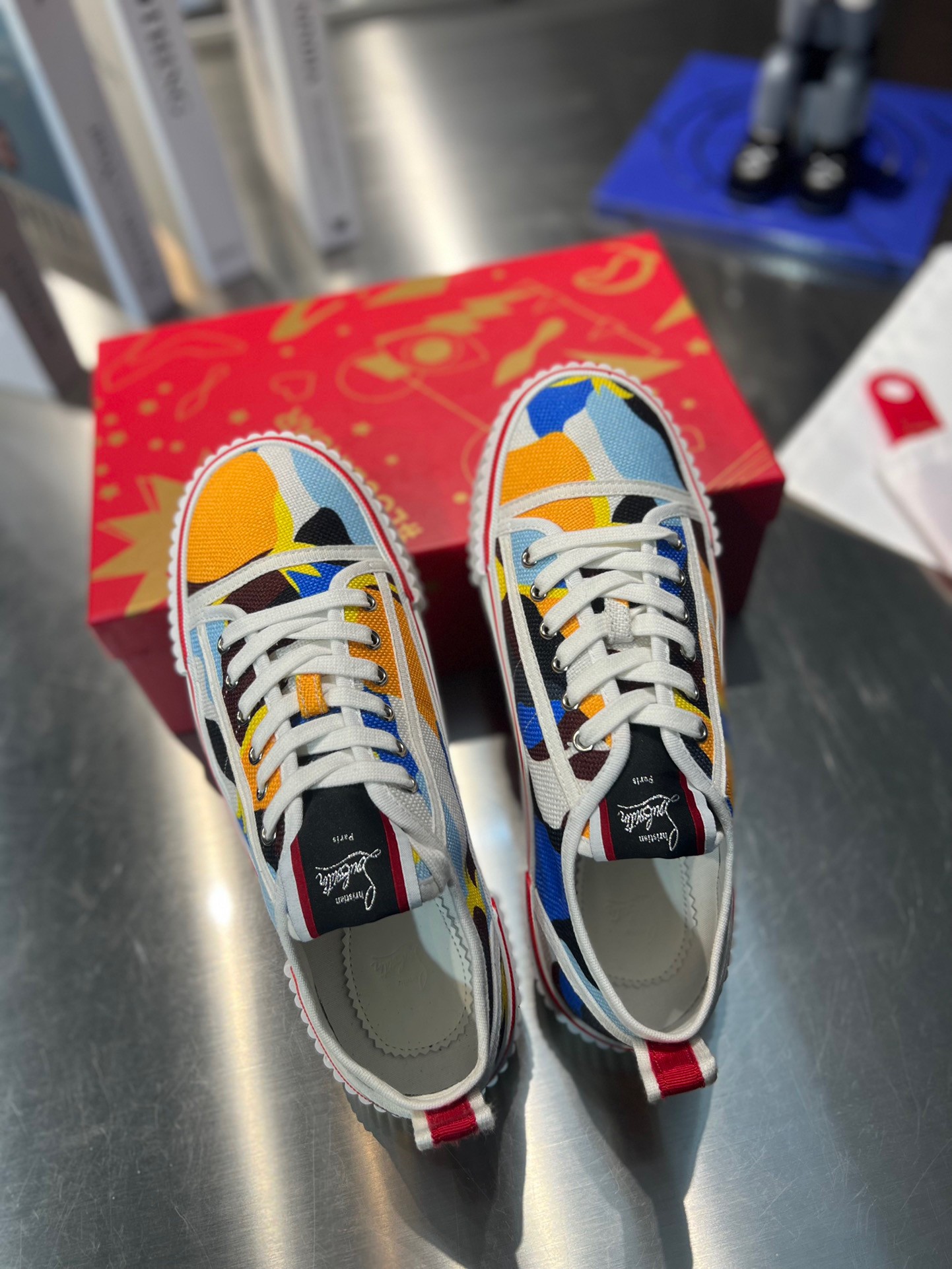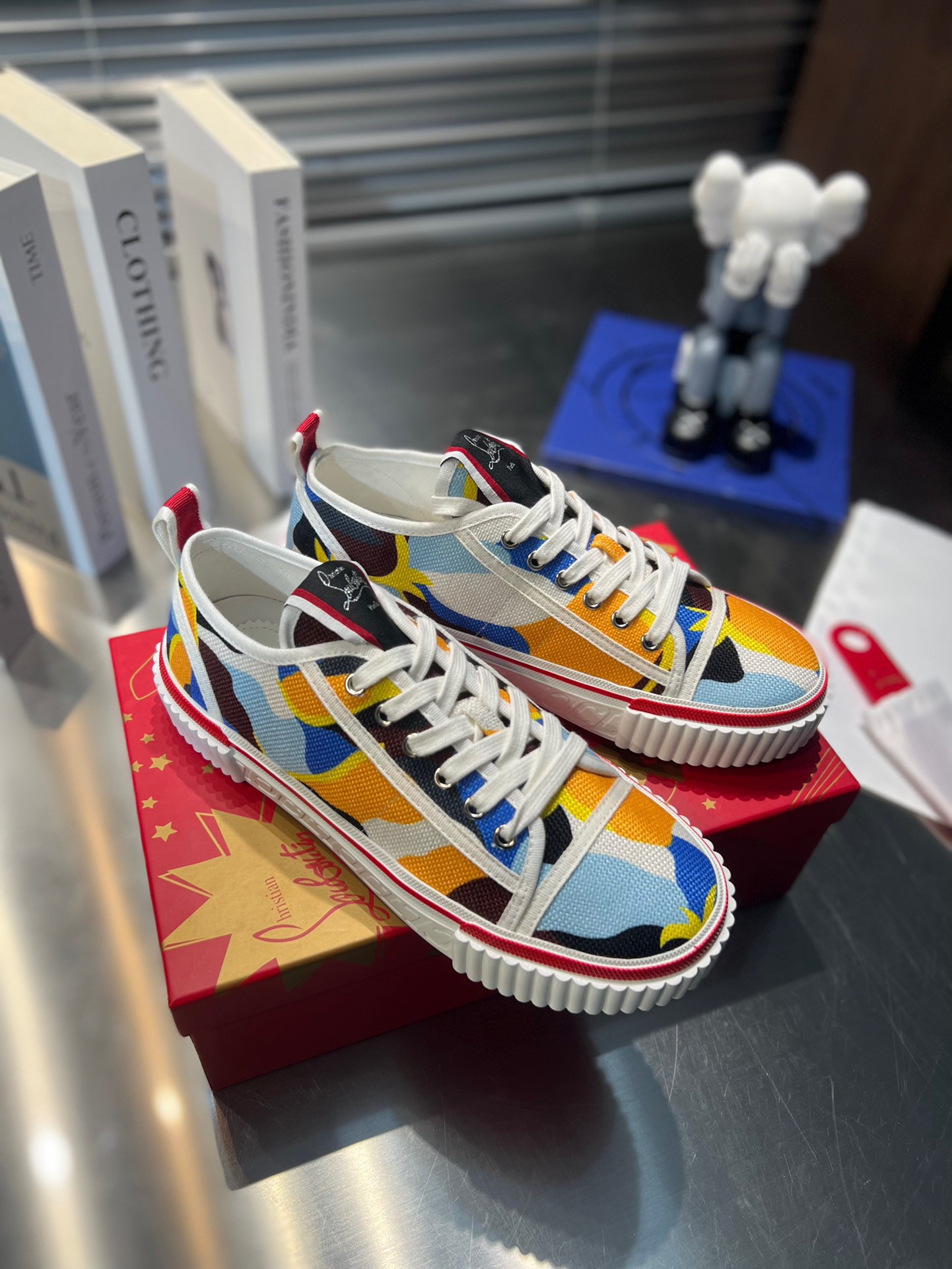 A retro take on the low-top sneaker, the Pedro Junior has a bold design and summery appeal. This iconic Maison Christian Louboutin model features a thick, ribbed rubber sole with Loubi red insert for a sporty, urban touch. The upper is worked in Toile Heliconia, with a multicolored abstract print, finished with a white trim. A signature Christian Louboutin label adorns the tongue for a touch of finesse.