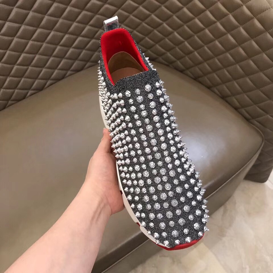 The Spiky Sock sneaker crafted as a sock will fit around the curve of the foot with lightness. Made of lamé neoprene and saturated with spikes, it is set on an XXL running and bouncing outsole. It has a pull-tab at the heel for ease of wear.
