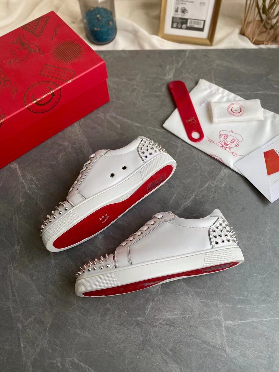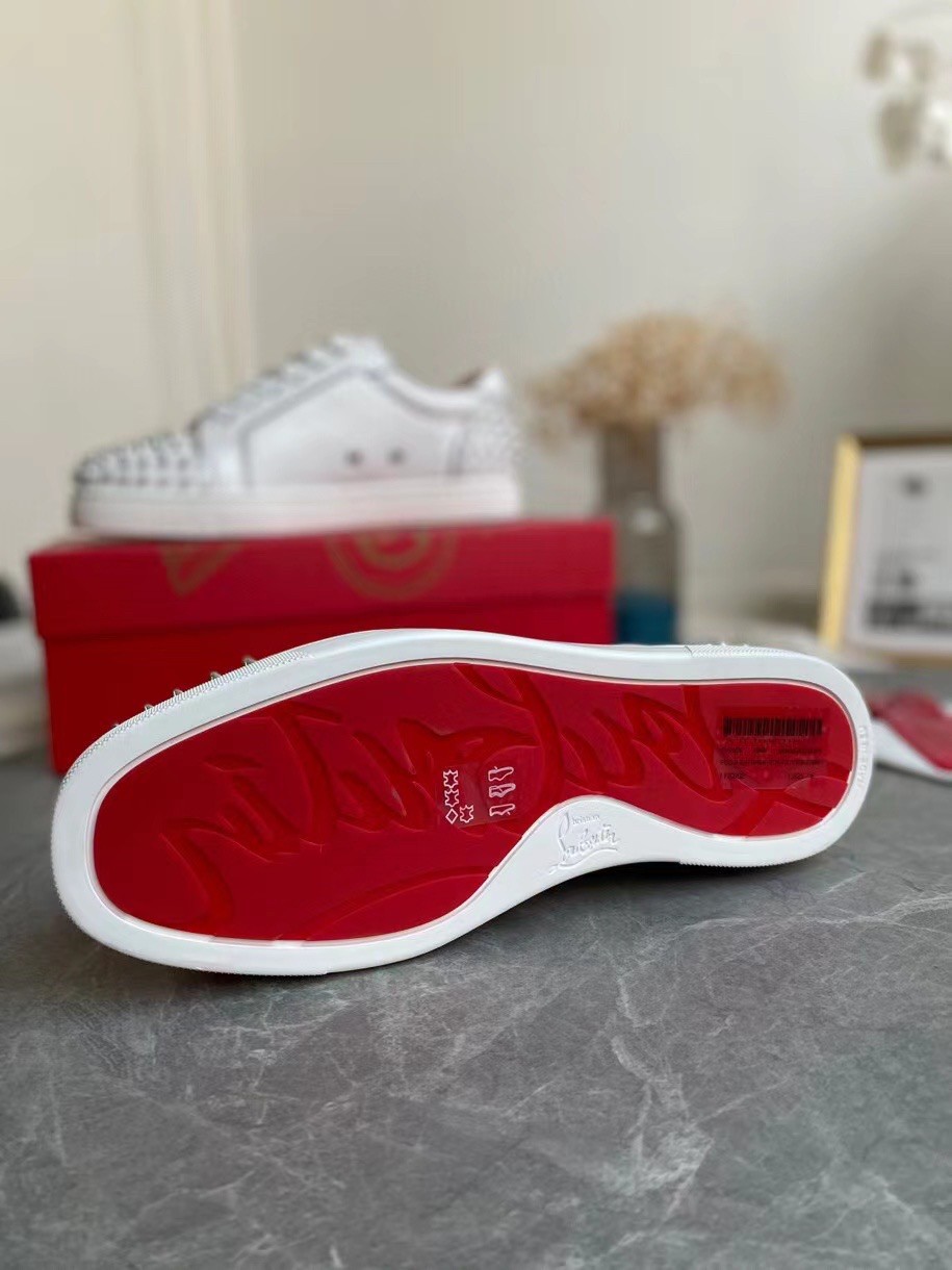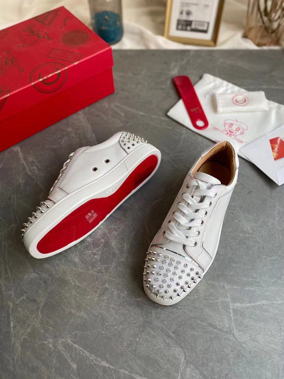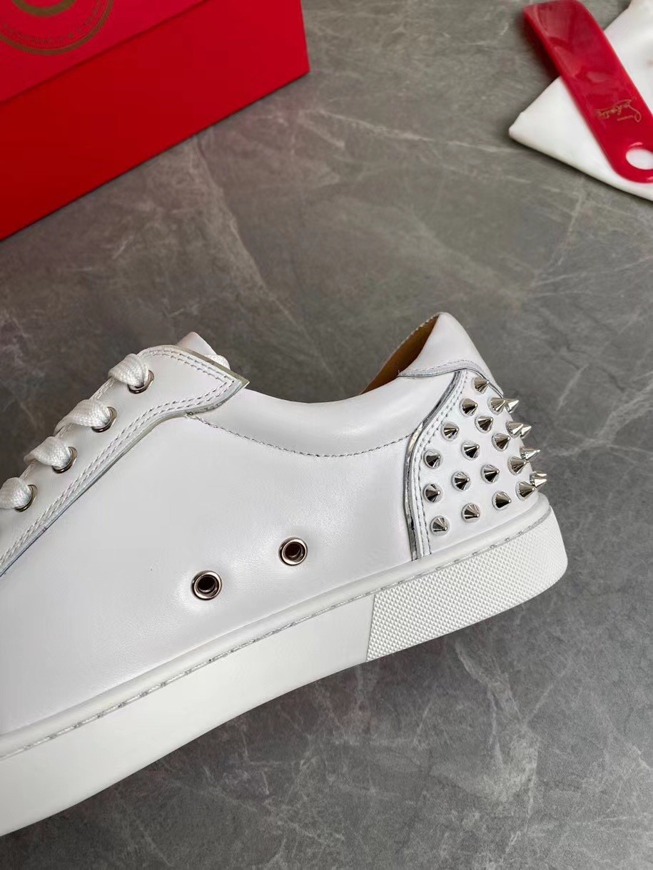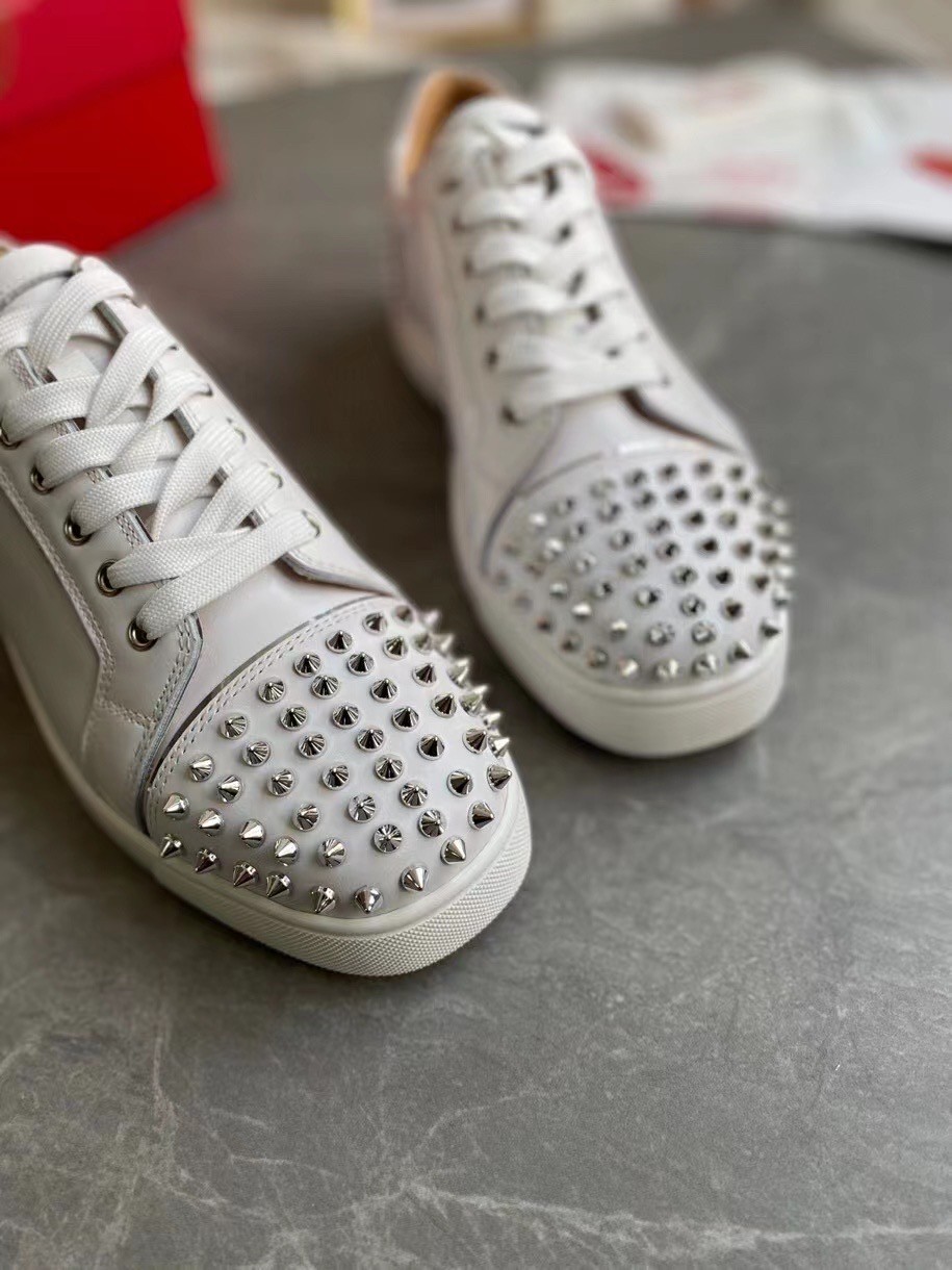 The Vieira 2 low top sneaker is the latest twist on the iconic Vieira low-top sneaker, brilliantly showcasing Maison Christian Louboutin’s skill at artfully mixing colors and fabrics to incredible effect. This season’s model combines pure soft calfskin leather with stunning Specchio silver a technical soft leather base with an intense silver sparkle, mimicking a leopard print. Signature glossy spikes adorn the toe and heel.