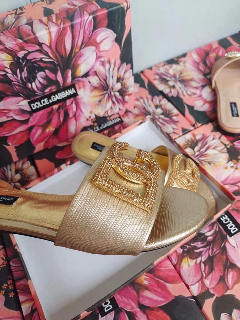 These Dolce & Gabbana’s new Bianca slides come in foiled iguana-print calfskin. Feminine and versatile, they feature the rhinestone-embellished DG logo.