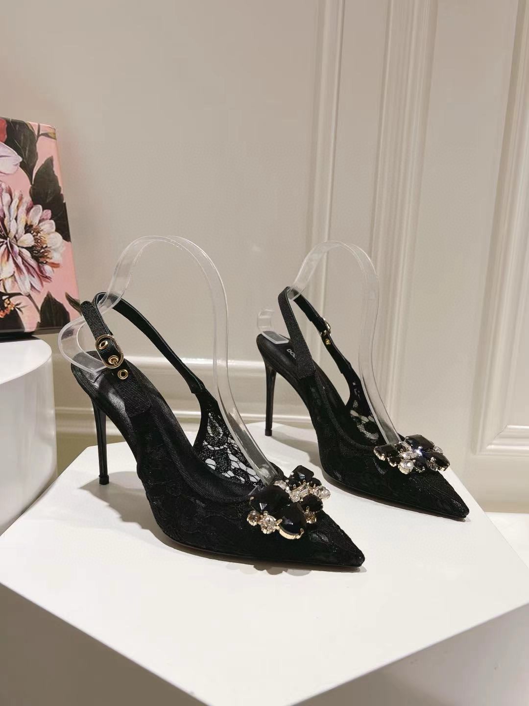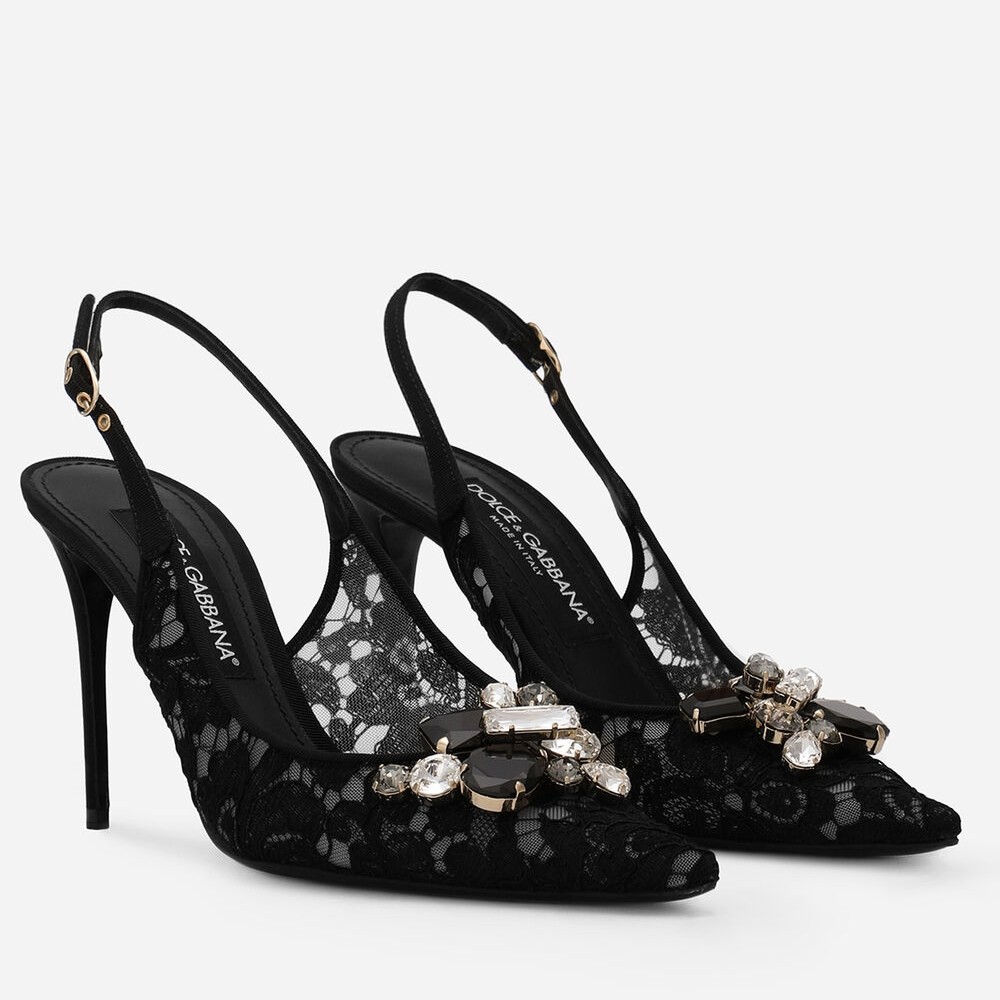 Featuring an iconic, timeless shape, these slingbacks from the Rainbow collection come in black lace. Feminine and elegant, they flaunt the iconic brooch made from colorful crystals that match the upper.