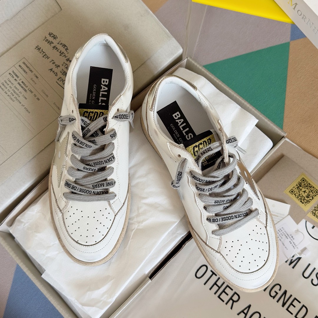 Dreaming of the Eighties. Golden Goose’s Ball Star sneakers have an American college vibe caught between a hoop shot and a skateboard ride. Like this model made of leather and featuring a gold star and heel tab.