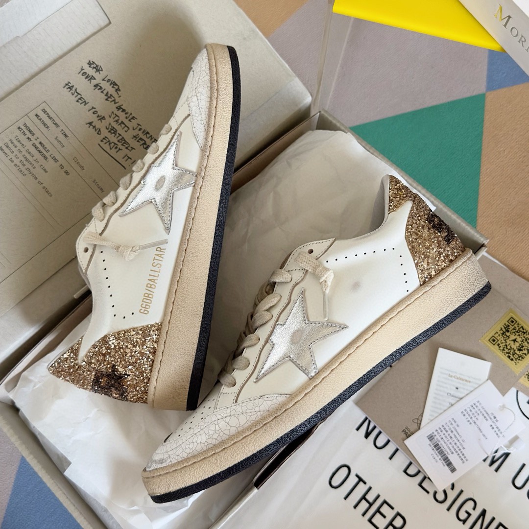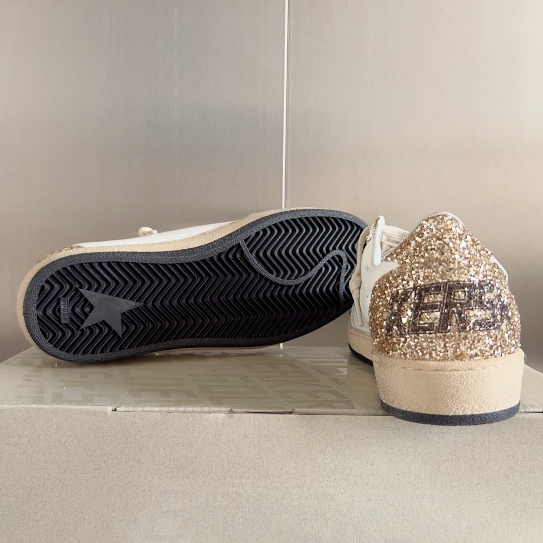Dreaming of the Eighties. Golden Goose’s Ball Star sneakers have an American college vibe caught between a hoop shot and a skateboard ride. This model with a white leather upper features a silver metallic leather star and a gold glitter heel tab. The white crackle leather toe and cream-colored laces add the finishing touch: beautiful things that never go out of fashion.