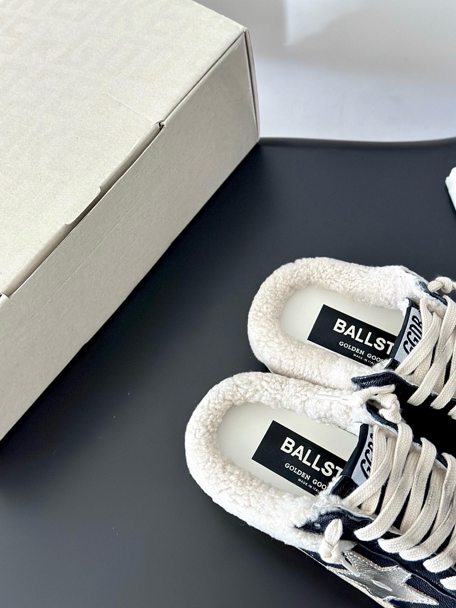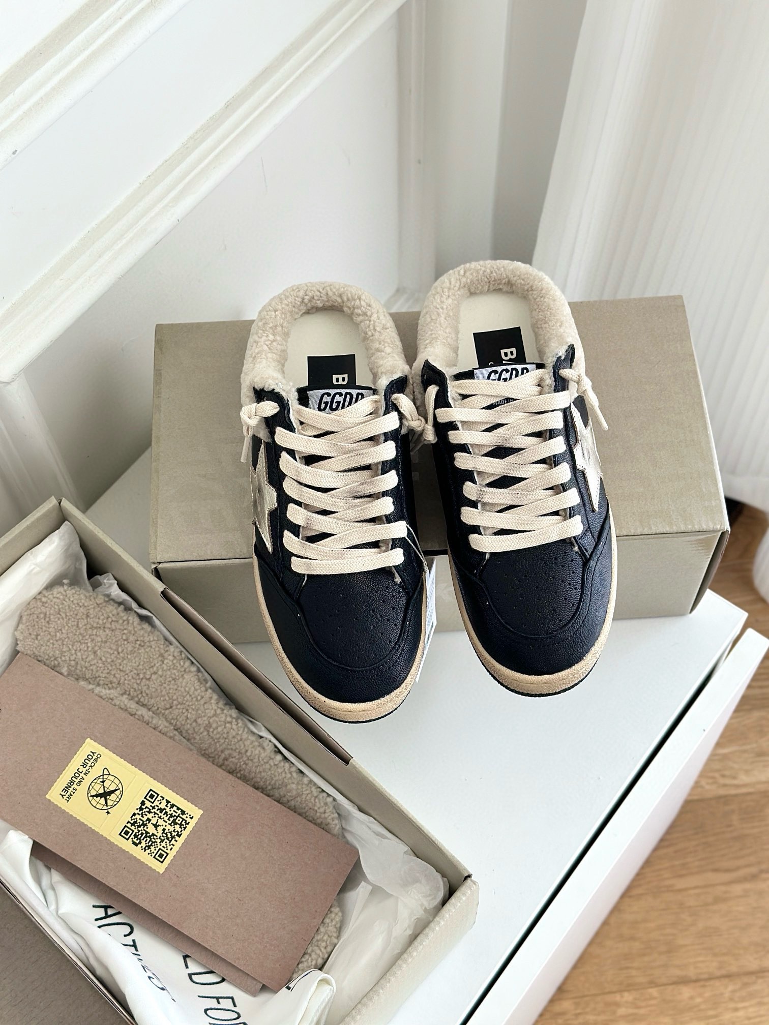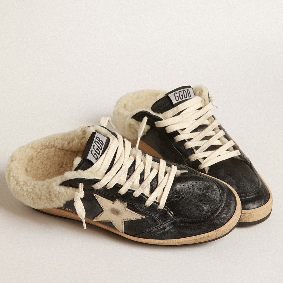 Dreaming of the Eighties. The GGDB’s Ball Star sneakers have an American college vibe caught between a hoop shot and a skateboard ride. Lined in soft beige shearling, this sabot-version model features a black nappa leather upper accentuated with a platinum metallic leather star. The cream laces add the finishing touch: beautiful things that never go out of fashion.
