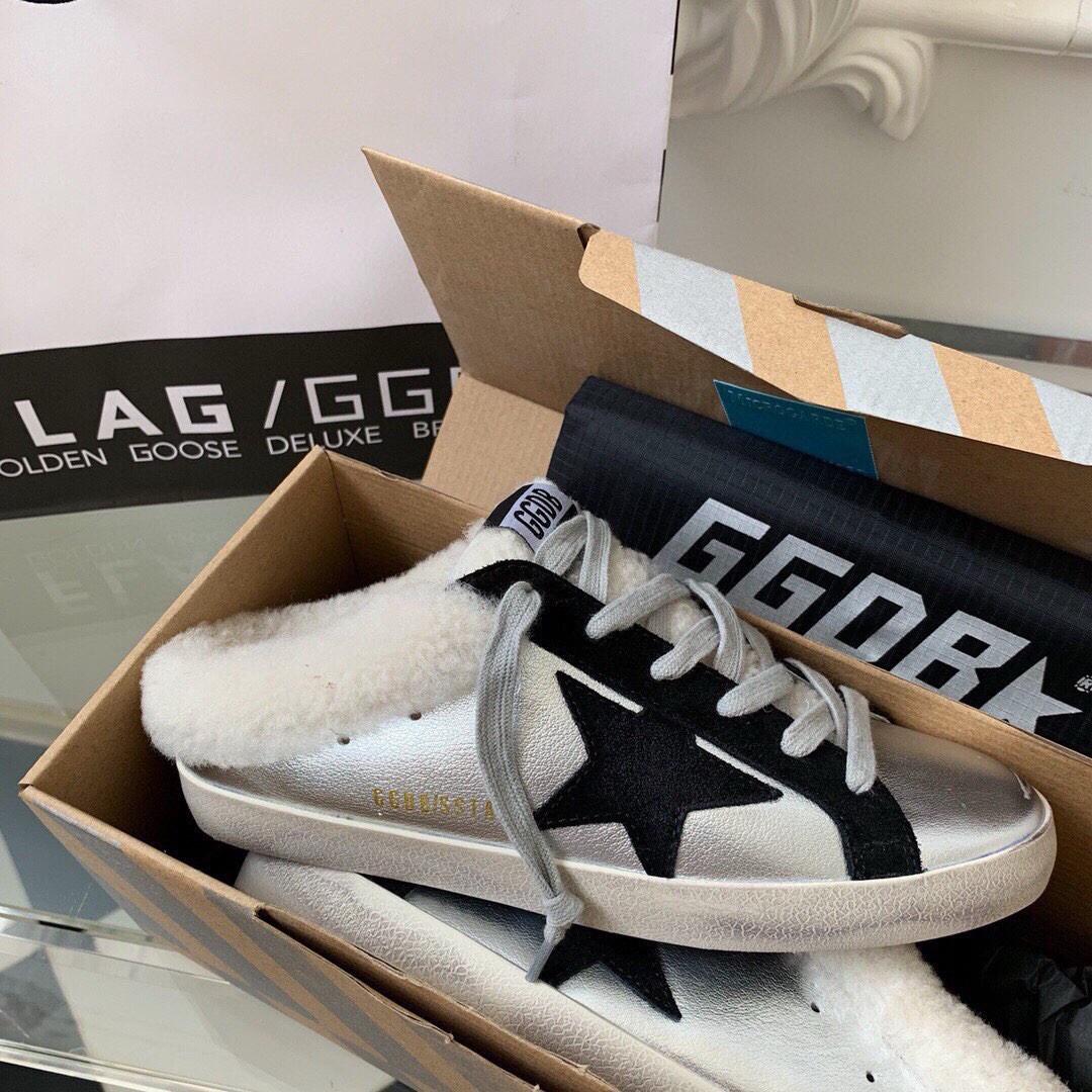 Golden Goose’s iconic sneakers in the new sabot version: lined with soft shearling, these Super-Star sneakers feature a silver laminated leather upper embellished with a black suede star and inserts. The beige shearling tongue and ice-gray laces complete the look.
