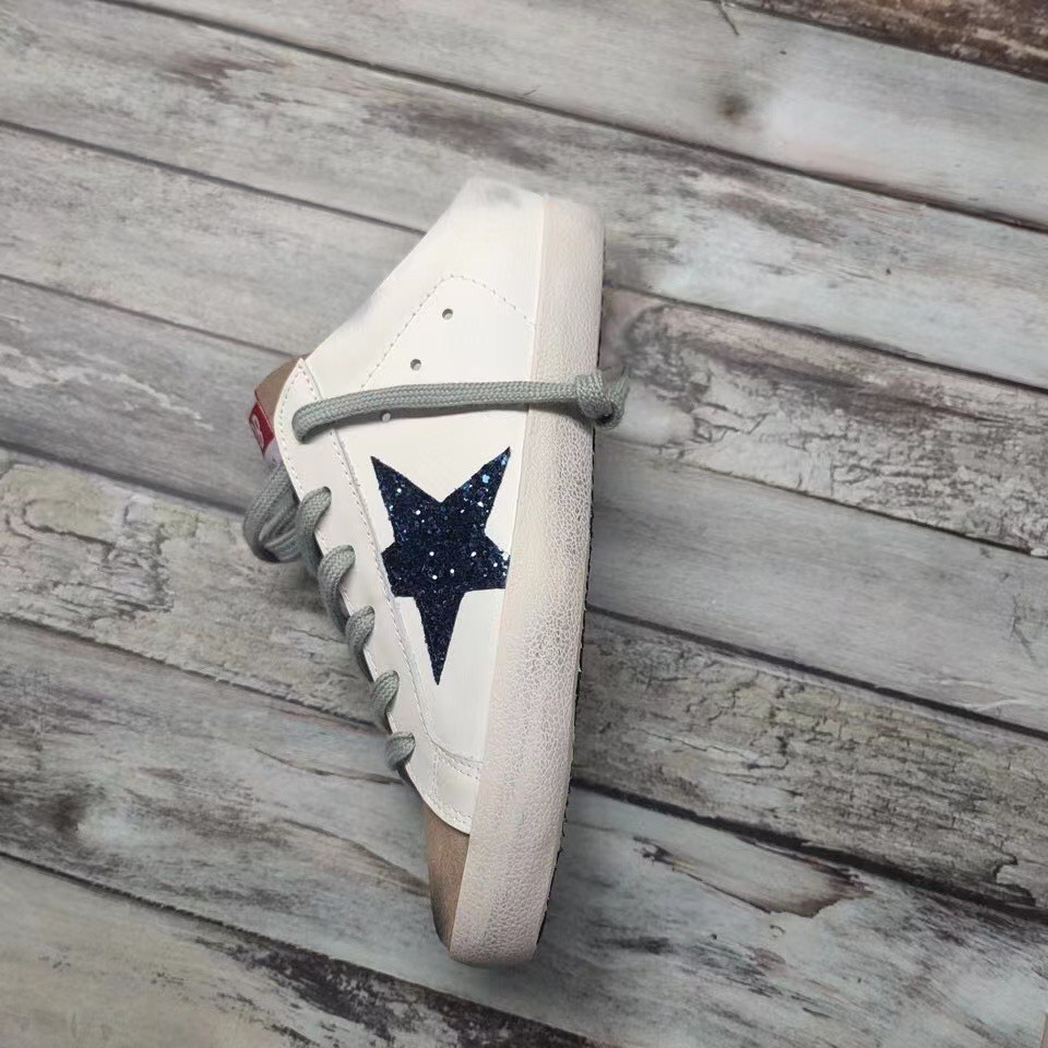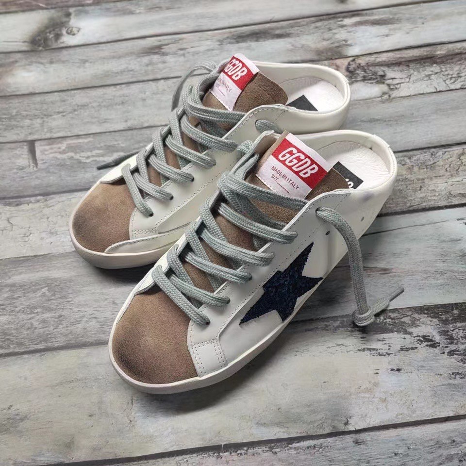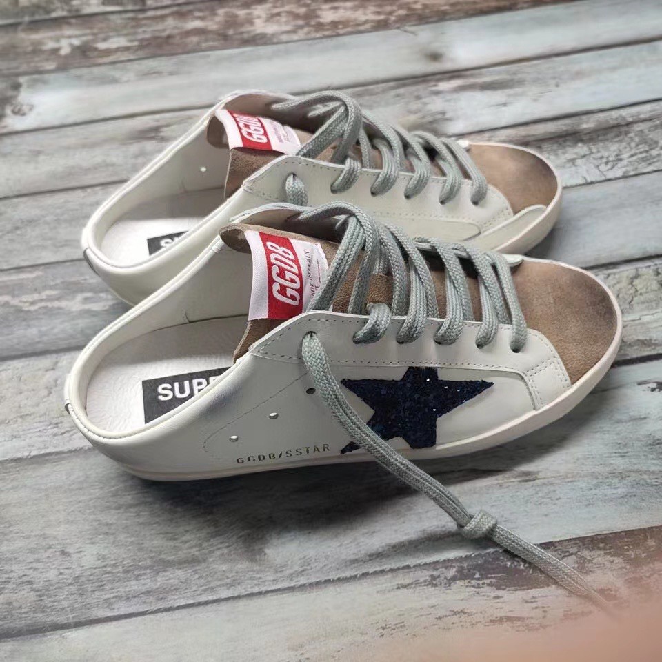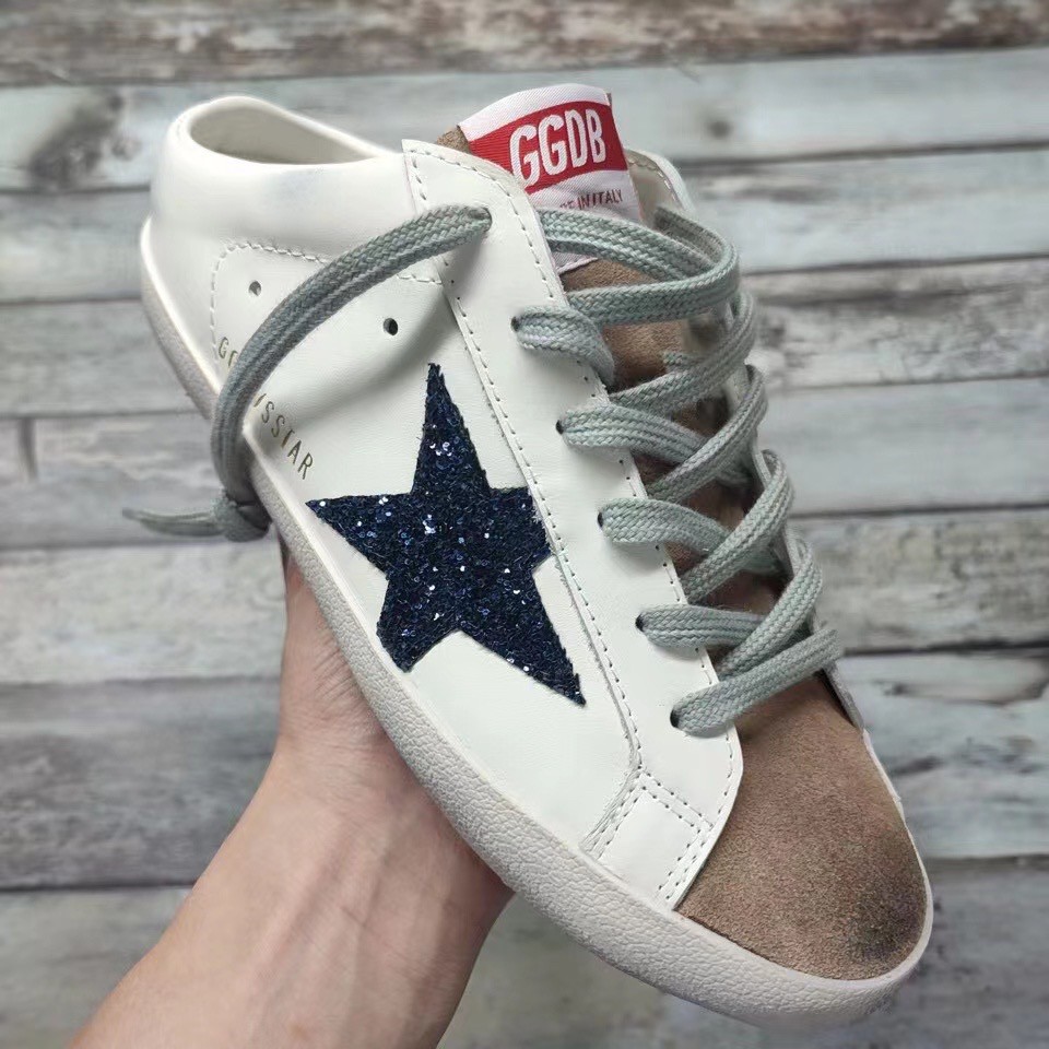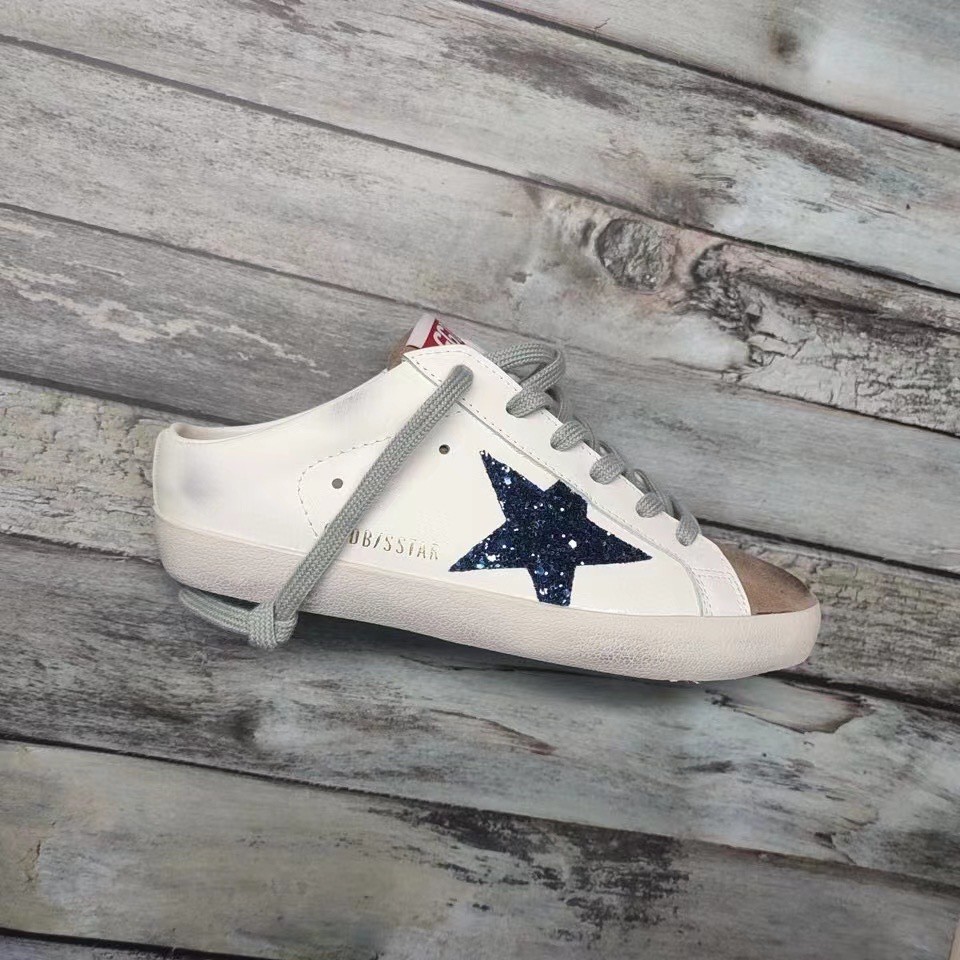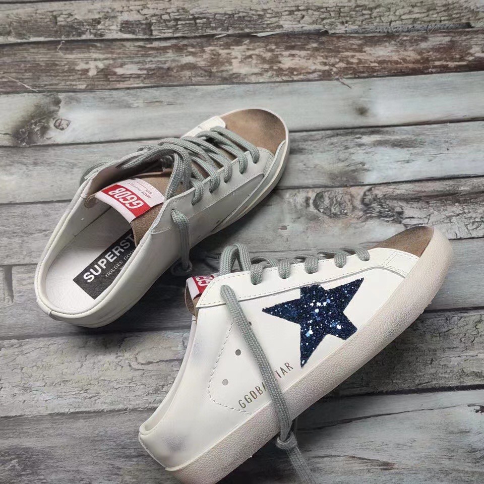 Golden Goose’s iconic sneakers in the new sabot version: these Super-Star feature a white leather upper embellished with a blue glitter star and dove-gray suede tongue. The ice-gray laces complete the look.