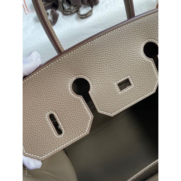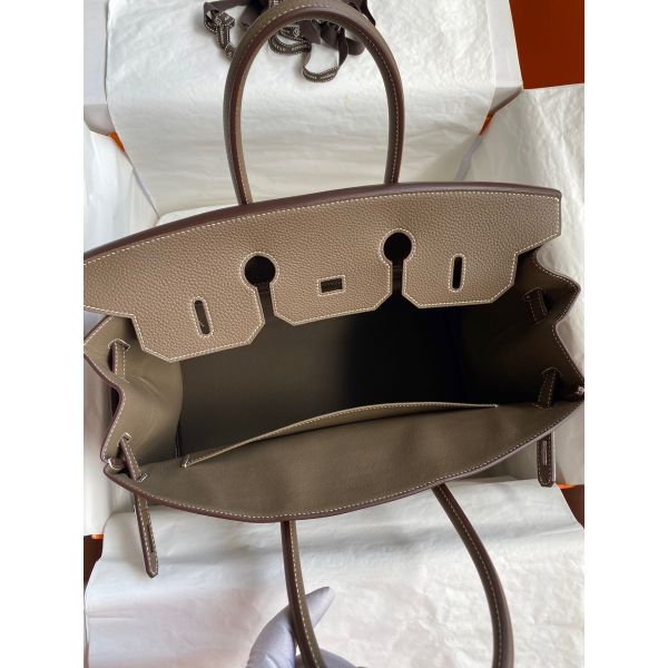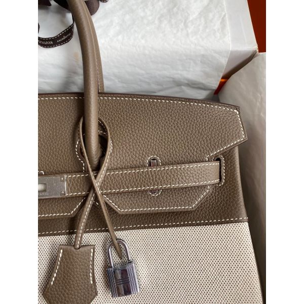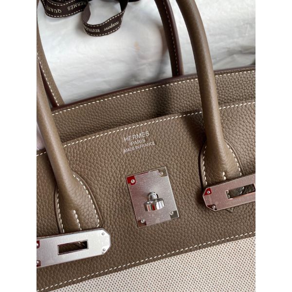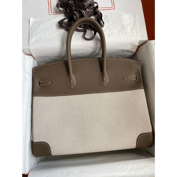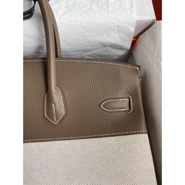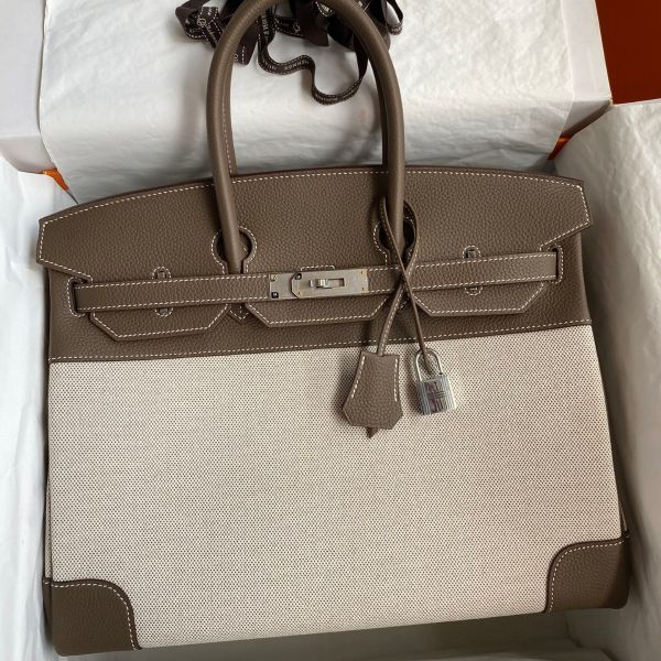 Hermes Birkin 35 Handmade Bag In Toile & Taupe Clemence Leather