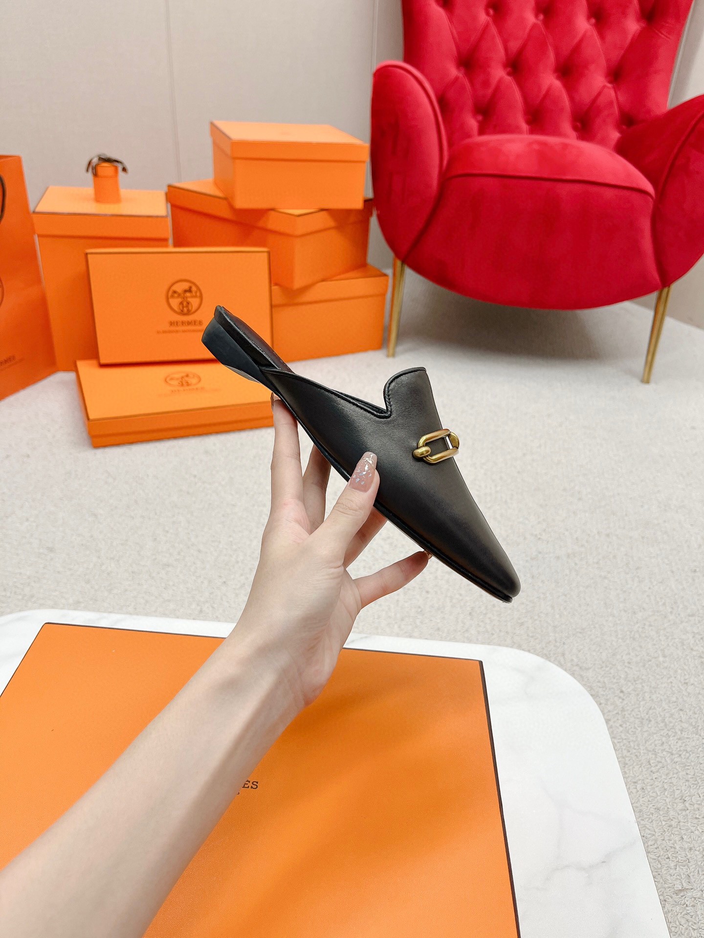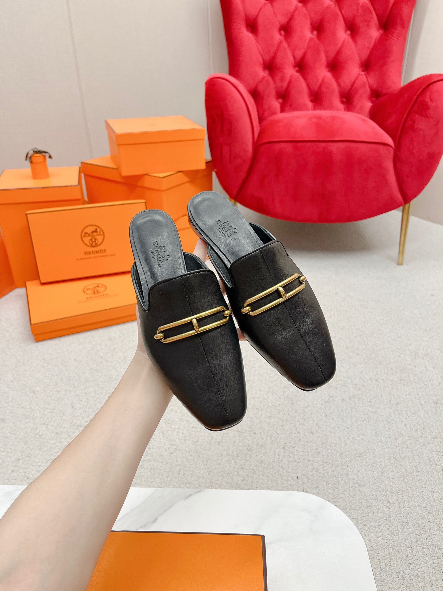 Hermes’s slippers have been crafted from smooth calfskin leather and topped with gold-plated Roulis hardware etched with house’s moniker. They have round toes and a slight heel for added lift. Wear them with with cropped tailoring.
