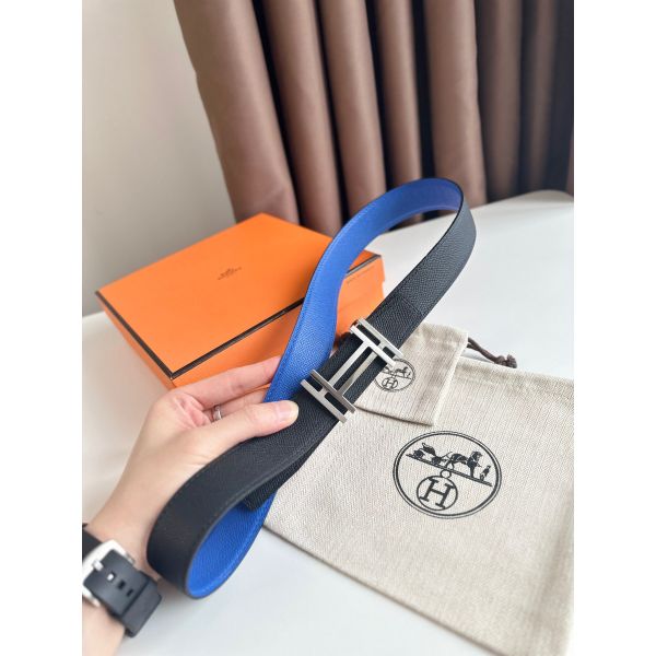 A classic add-on to your collection of belts, this Hermes piece has been crafted from Epsom calfskin. It is reversible with a black shade on one side and blue on the other. It is topped with an H au Carre buckle. This wardrobe essential piece will continually complement your style.