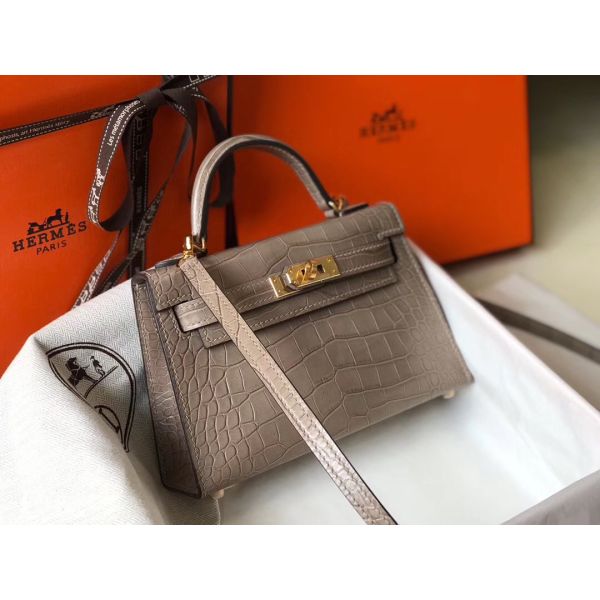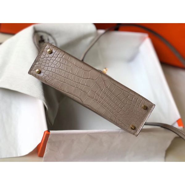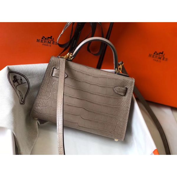 Hermes Kelly Mini II Handmade Bag In Grey Crocodile Embossed Leather