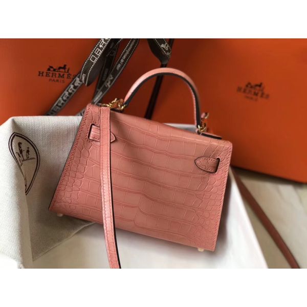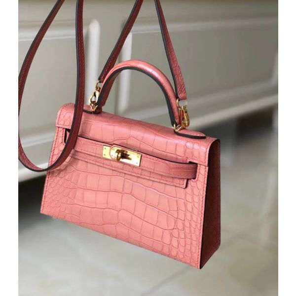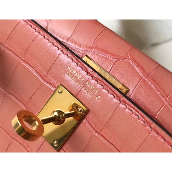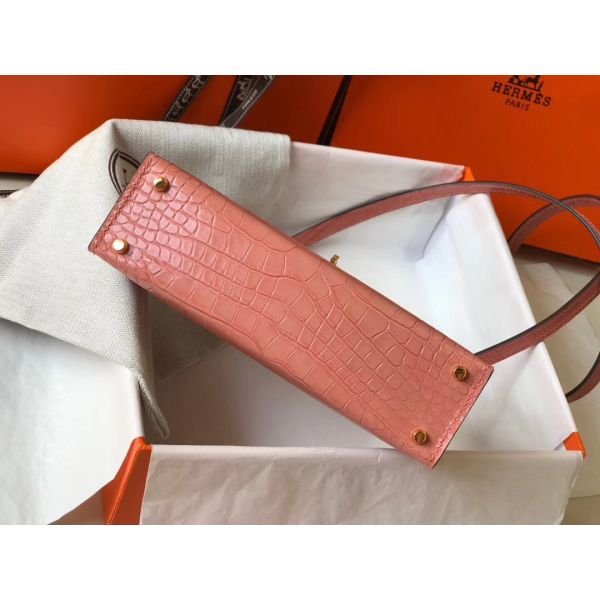 Hermes Kelly Mini II Handmade Bag In Pink Crocodile Embossed Leather