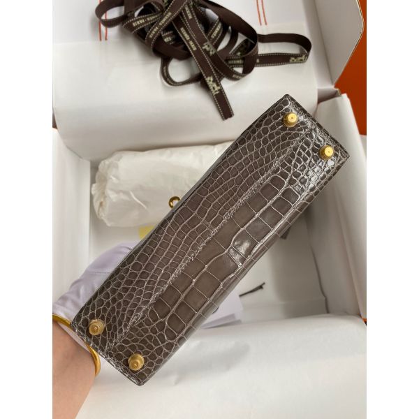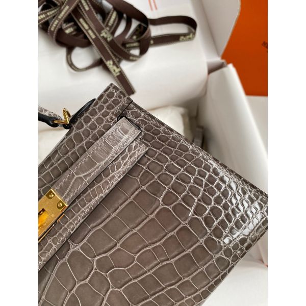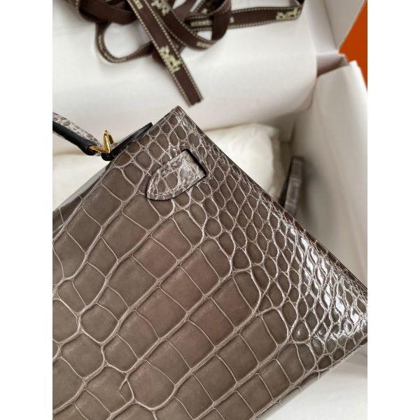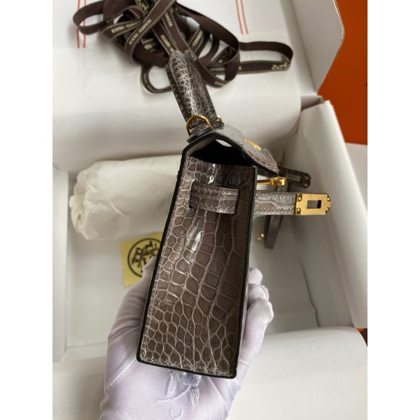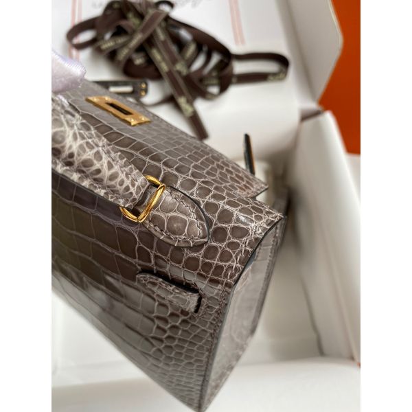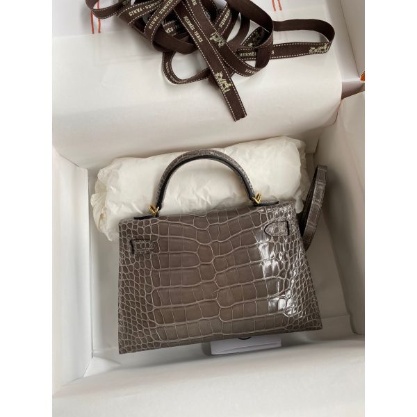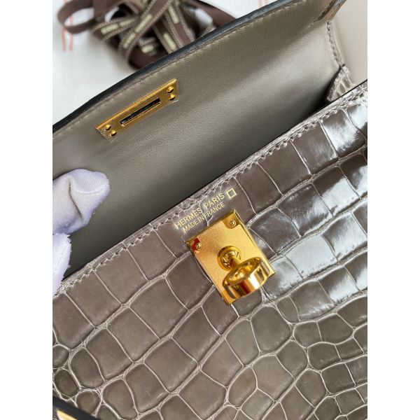 Hermes Kelly Mini II Sellier Handmade Bag in Gris Tourterelle Shiny Alligator Leather