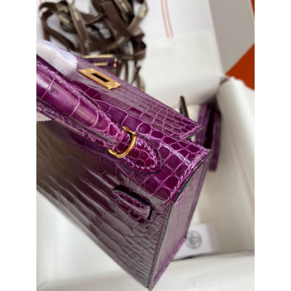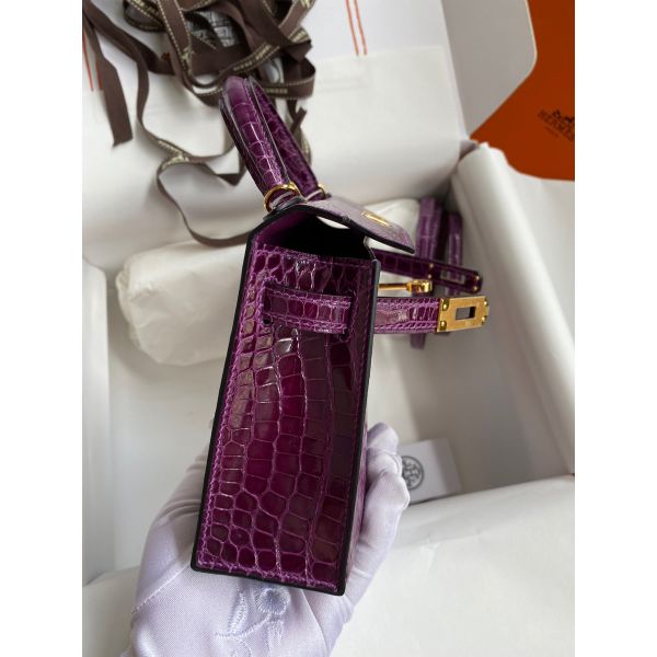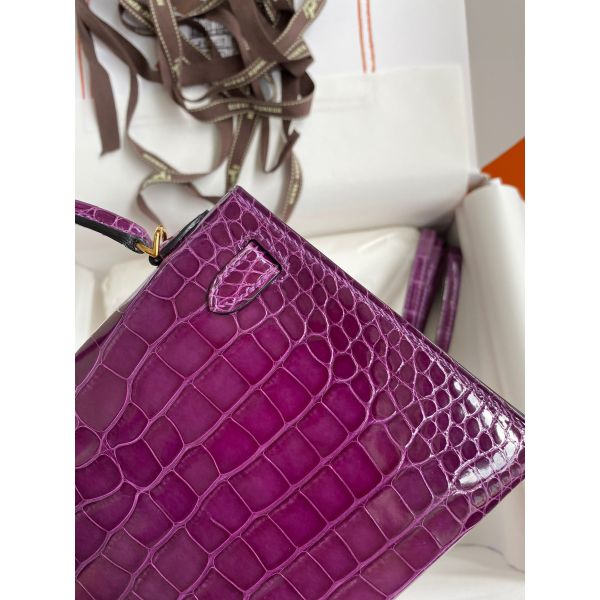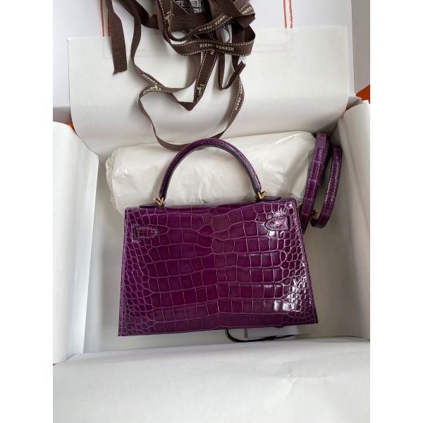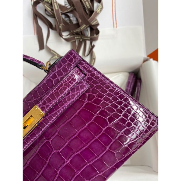 Hermes Kelly Mini II Sellier Handmade Bag In Purple Shiny Alligator Leather