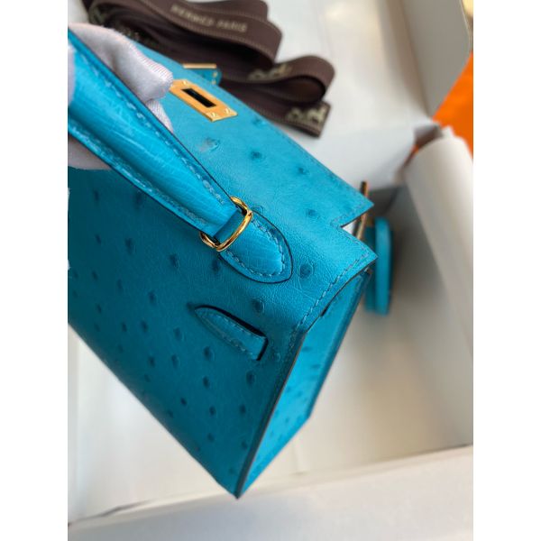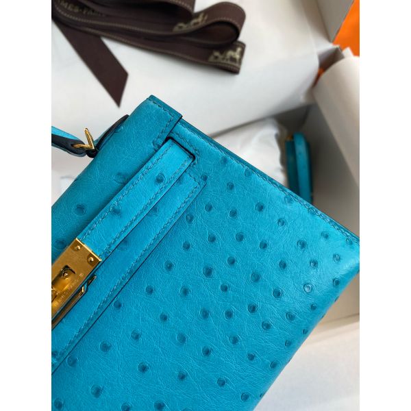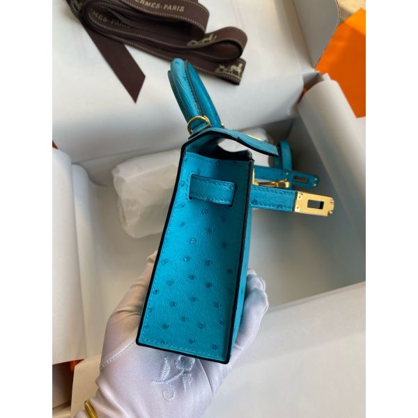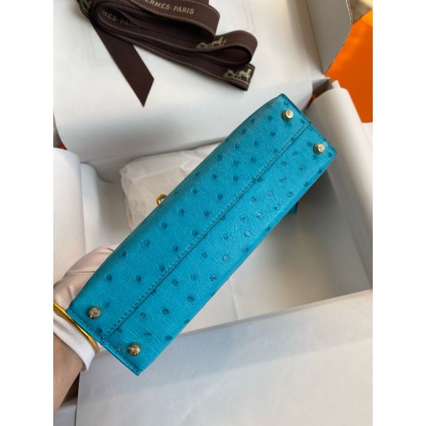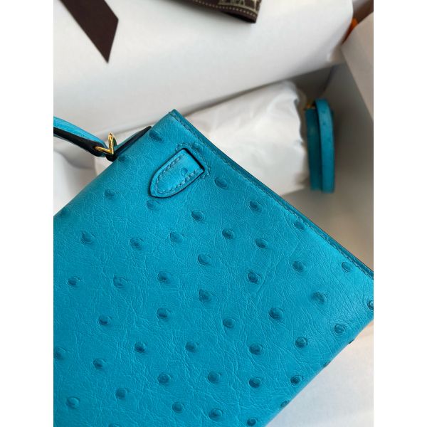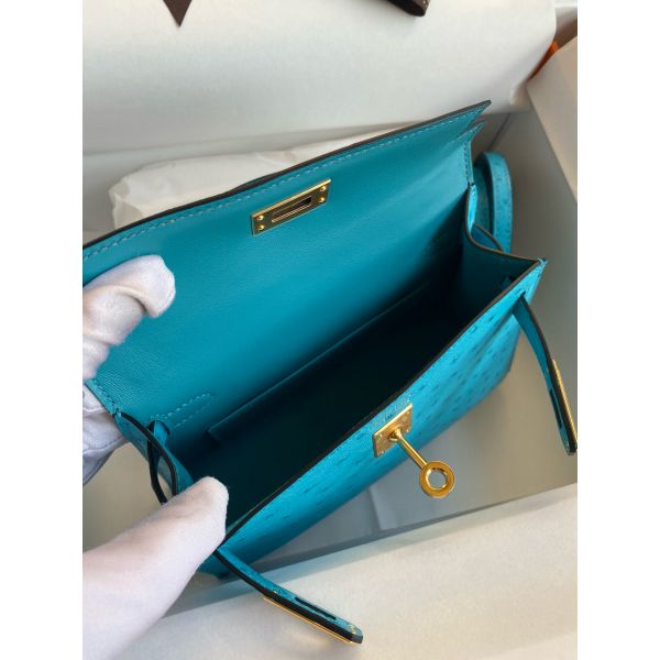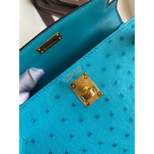Hermes Kelly Mini II Sellier Handmade Bag in Turquoise Blue Ostrich Leather