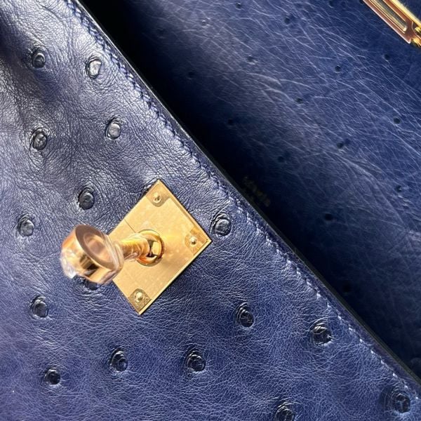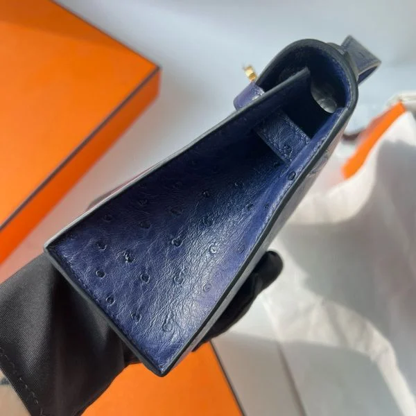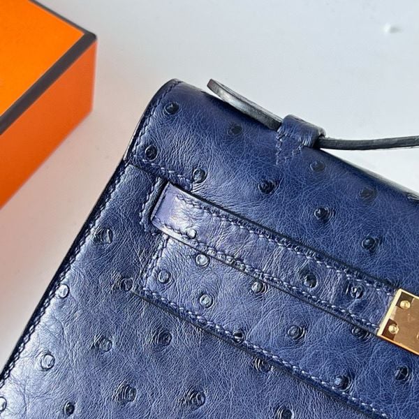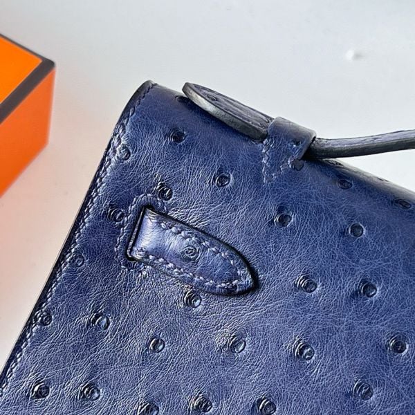 Hermes Kelly Pochette Handmade Bag in Blue de Malte Ostrich Leather