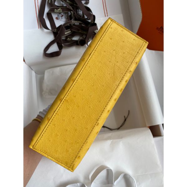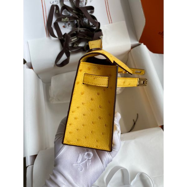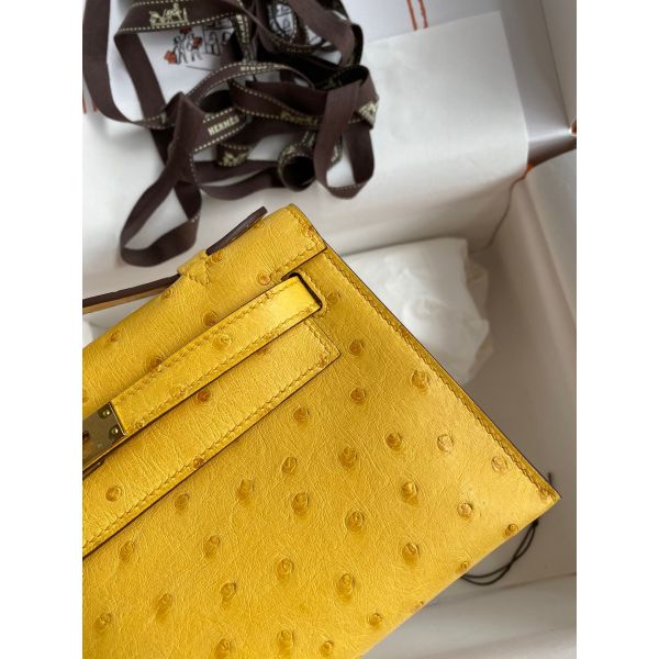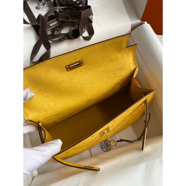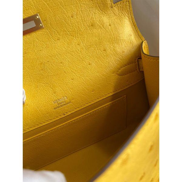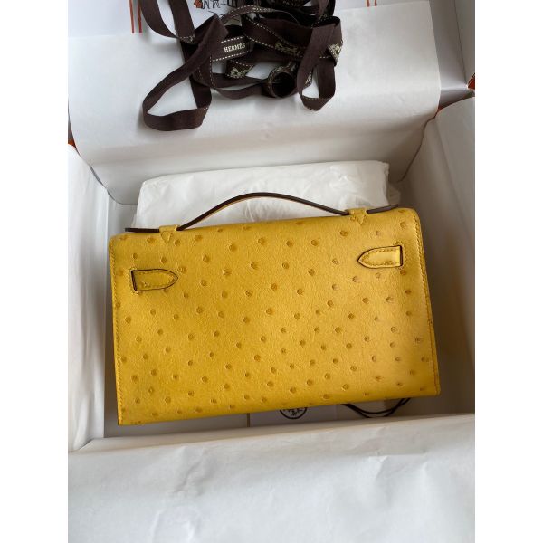 Hermes Kelly Pochette Handmade Bag In Jaune Ambre Ostrich Leather