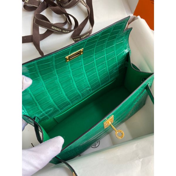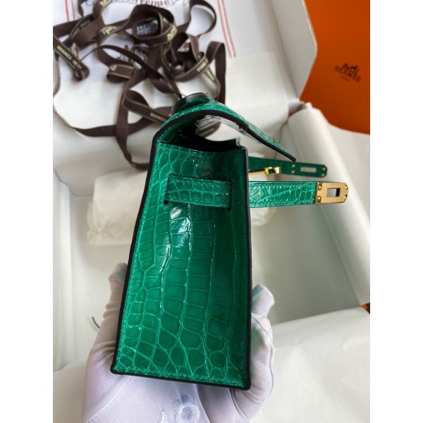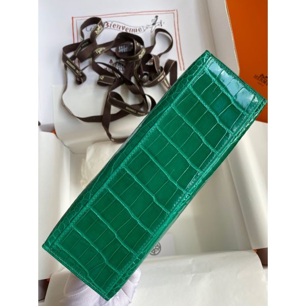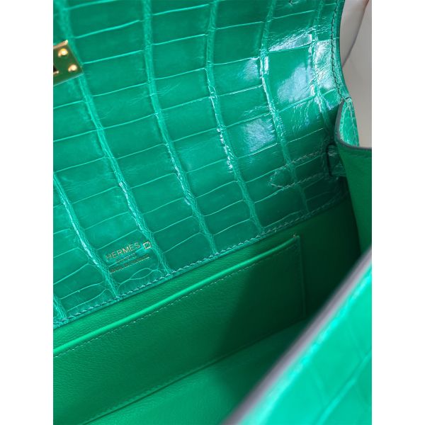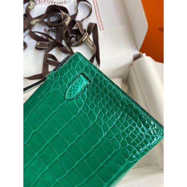 Hermes Kelly Pochette Handmade Bag In Vert Emerald Shiny Alligator Leather