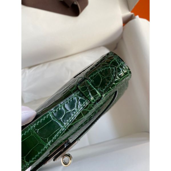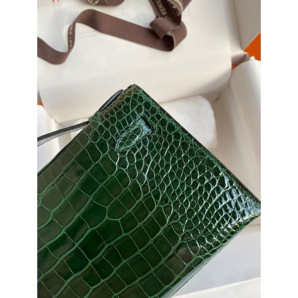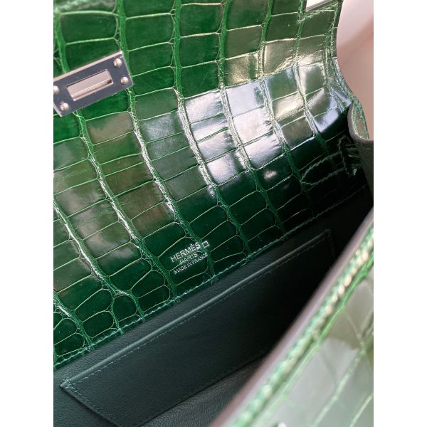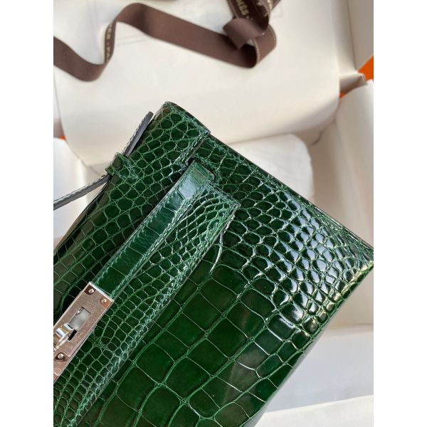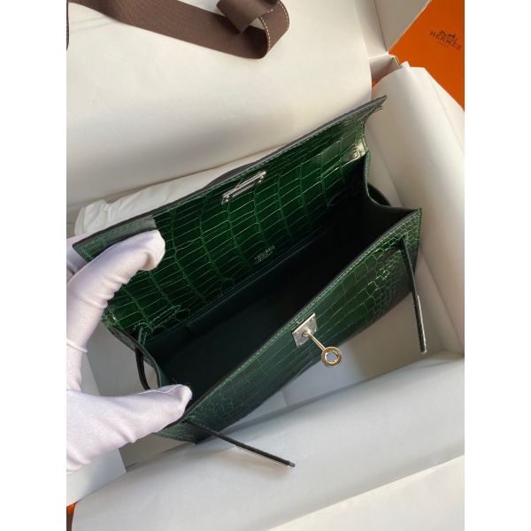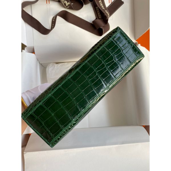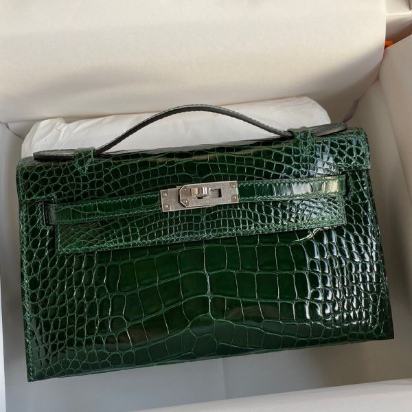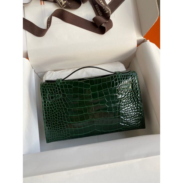 Hermes Kelly Pochette Handmade Bag In Vert Fonce Shiny Alligator Leather