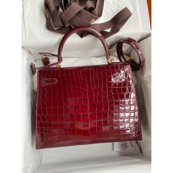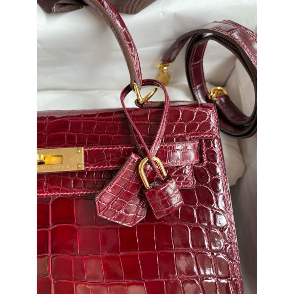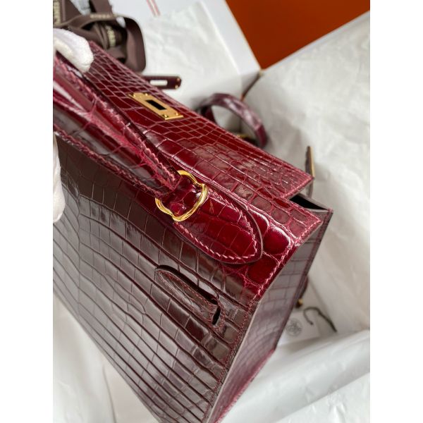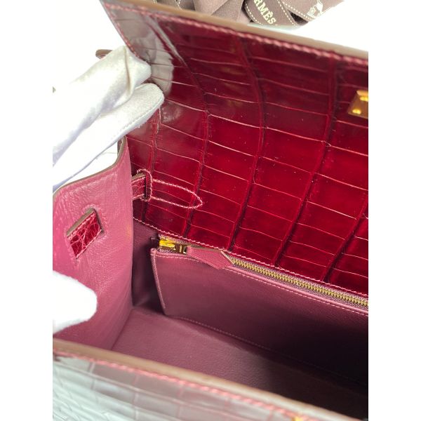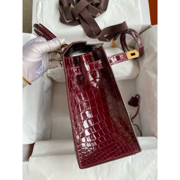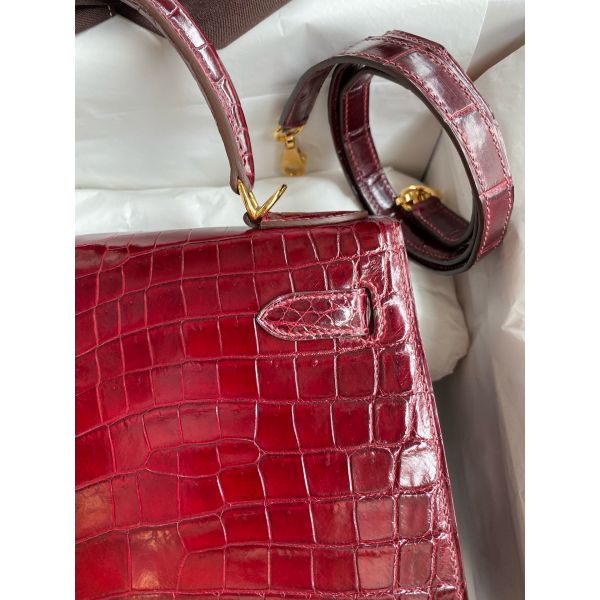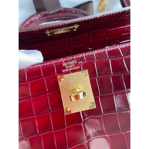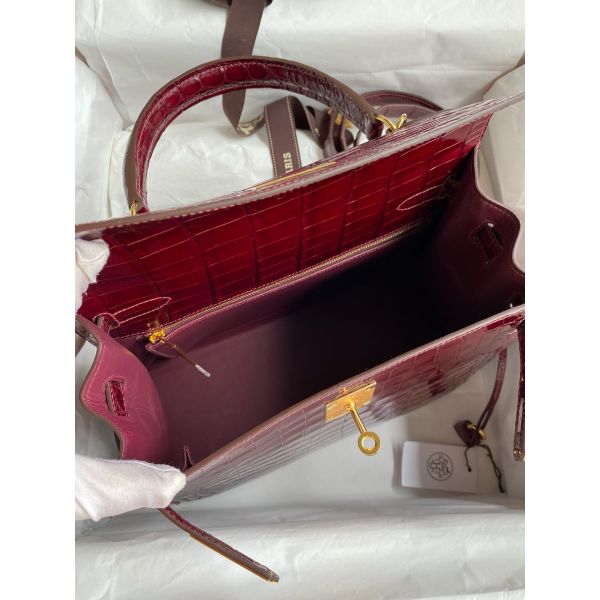 Hermes Kelly Sellier 28 Handmade Bag in Bordeaux Niloticus Crocodile Shiny Skin