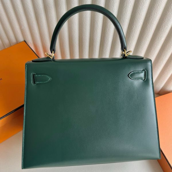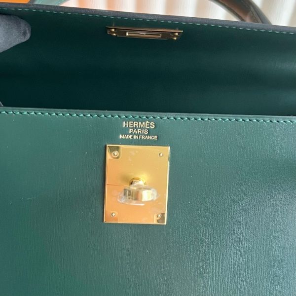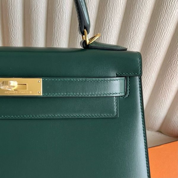 Hermes Kelly Sellier 28 Handmade Bag in Vert Fonce Box Calfskin