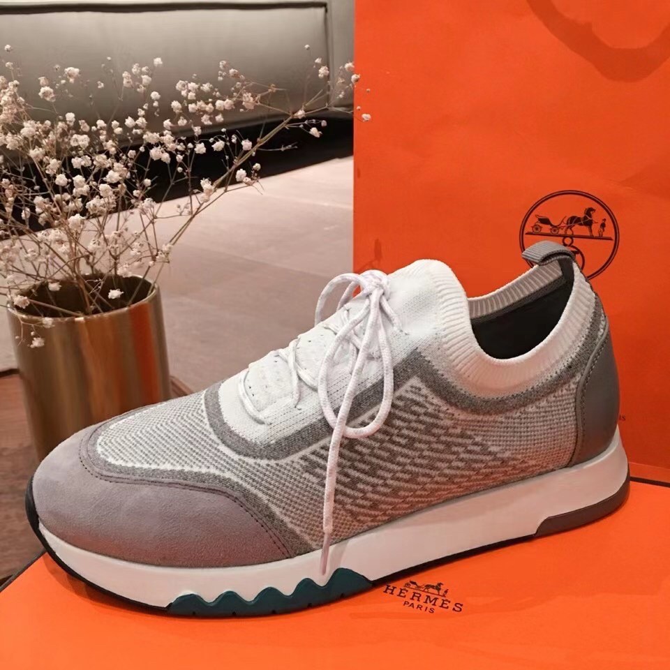 A reinterpretation of a classic style, The Hermes Addict Sneaker in bicolor knit with optical illusion, these pairs feature petrol zigzag rubber insert on the front and grey rubber insert on the back, white rubber midsole and white goatskin insole and lining.