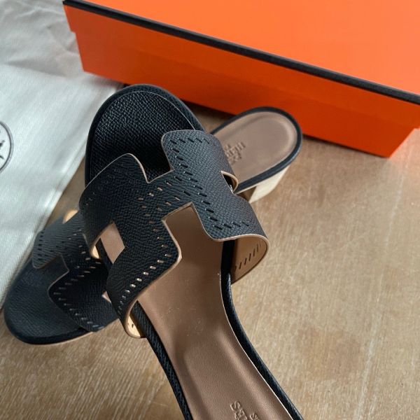 Hermes Oasis Sandals in Black Perforated Epsom Leather