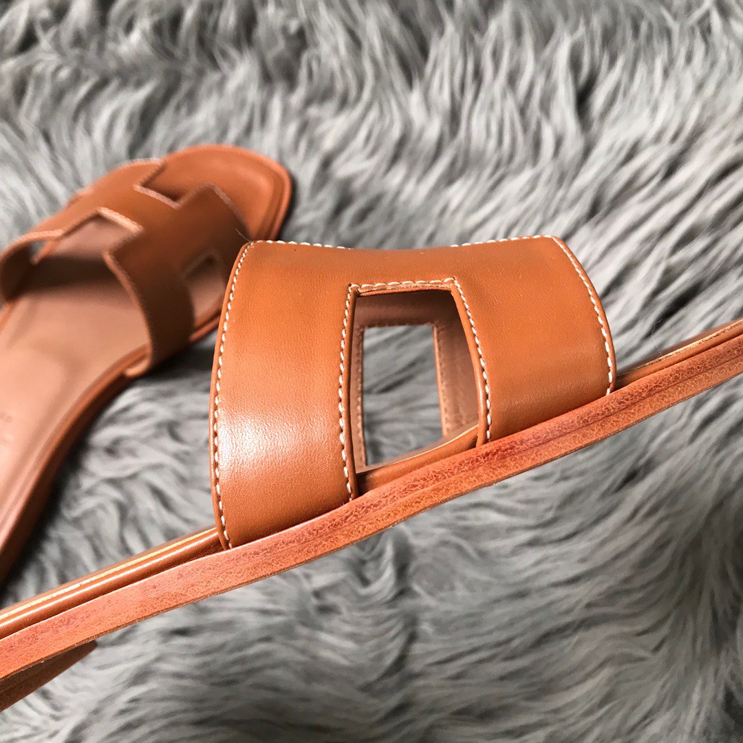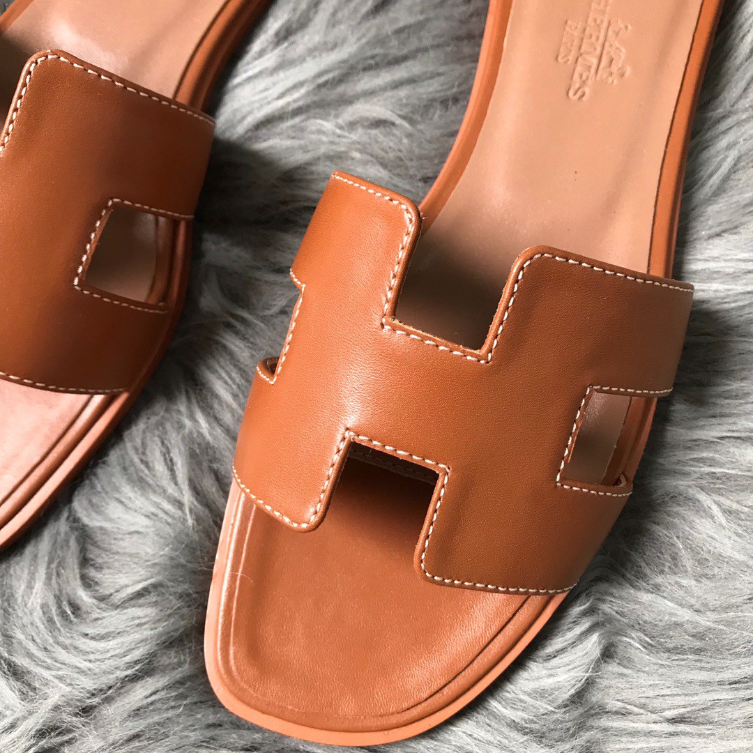 Hermes Oran Slide Sandals In Brown Swift Calfskin