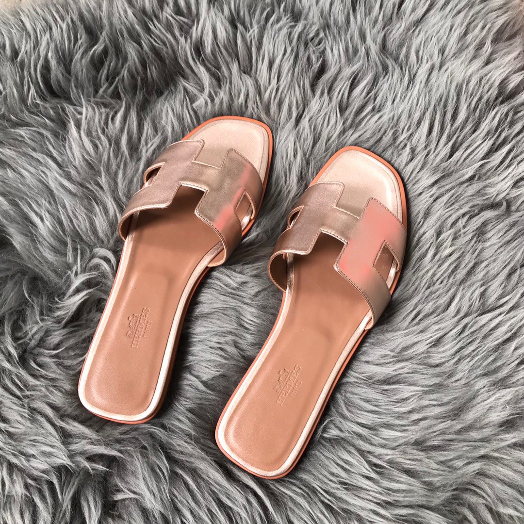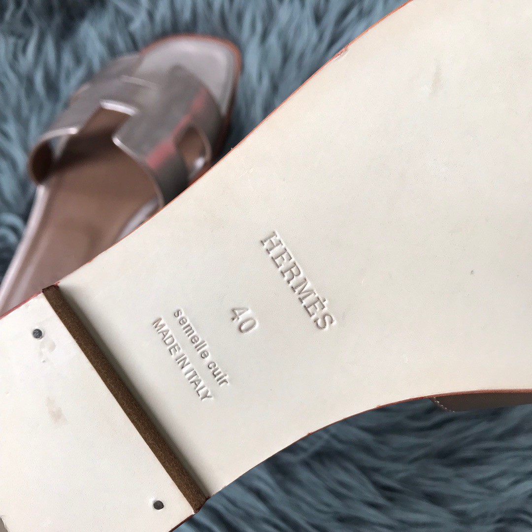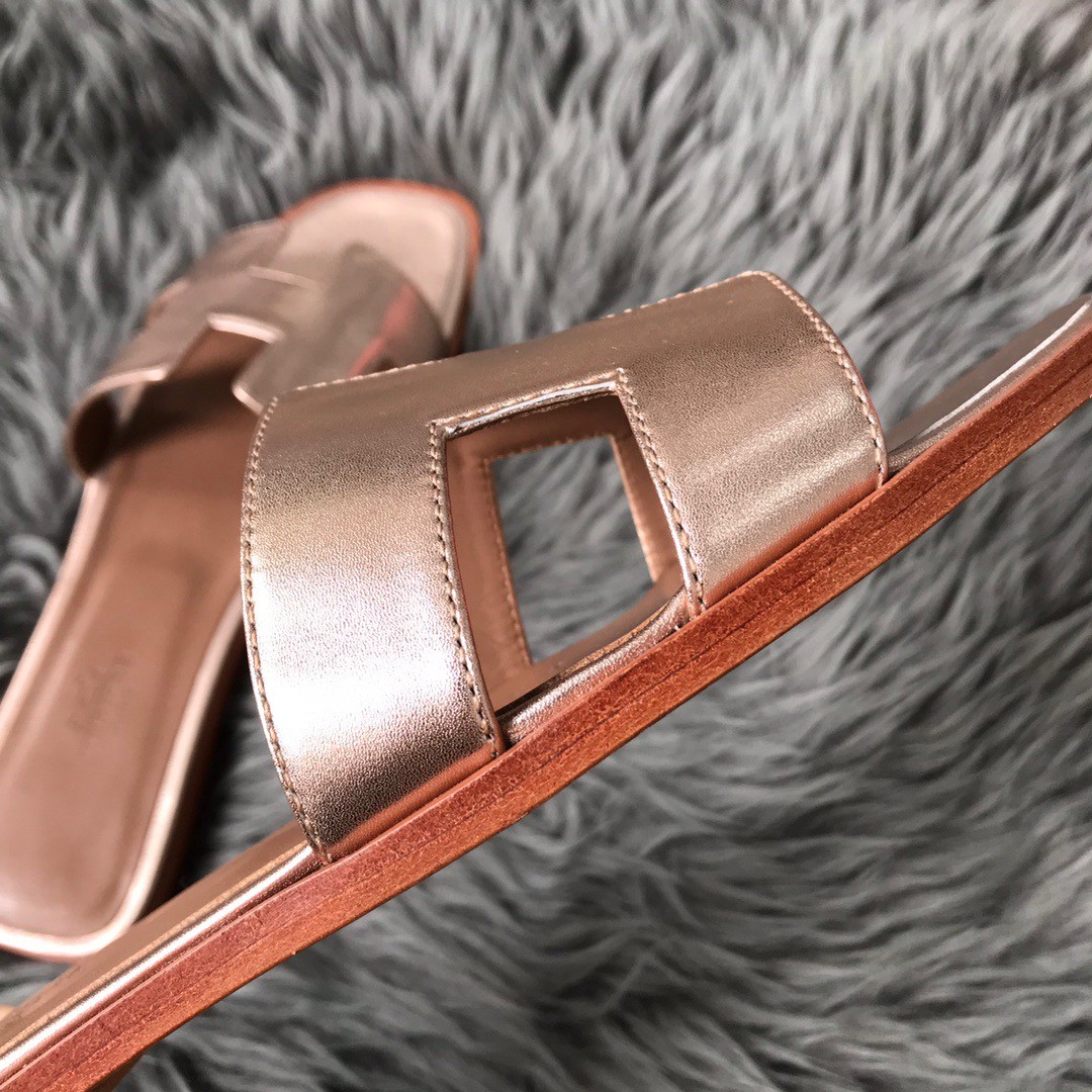 Hermes Oran Slide Sandals In Rose Gold Swift Calfskin