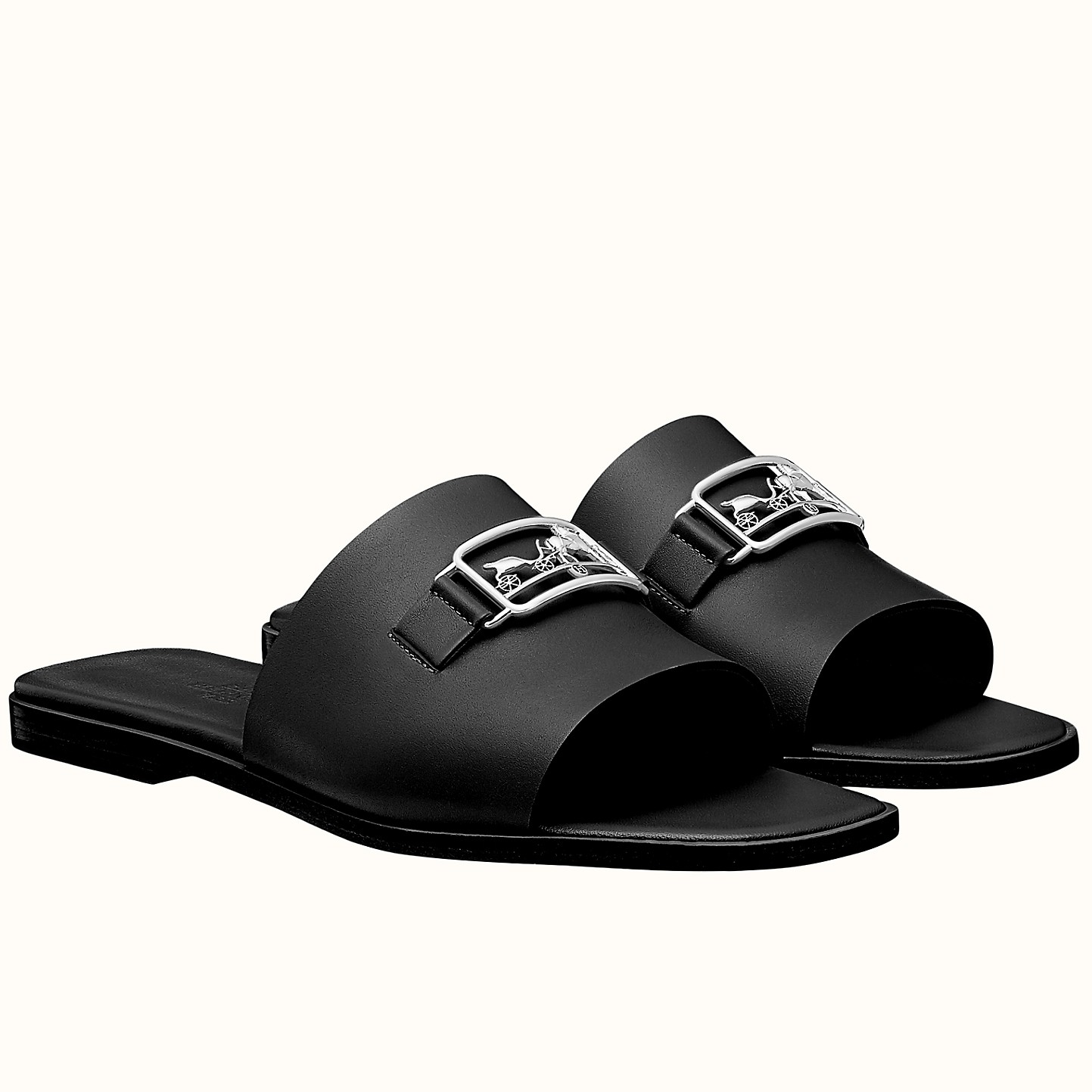 The Viaggio sandals contrast the sleek simplicity of its upper in calf leather with detailed openwork hardware. This model is characterized by its palladium plated buckle adds to the femininity of this design.