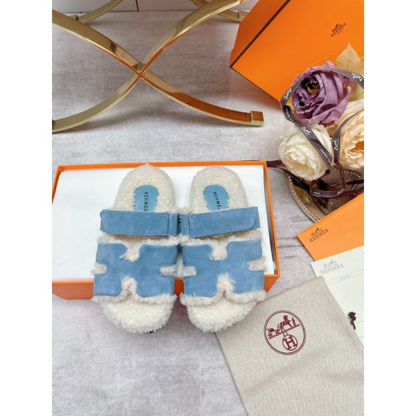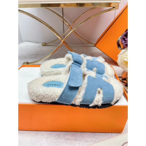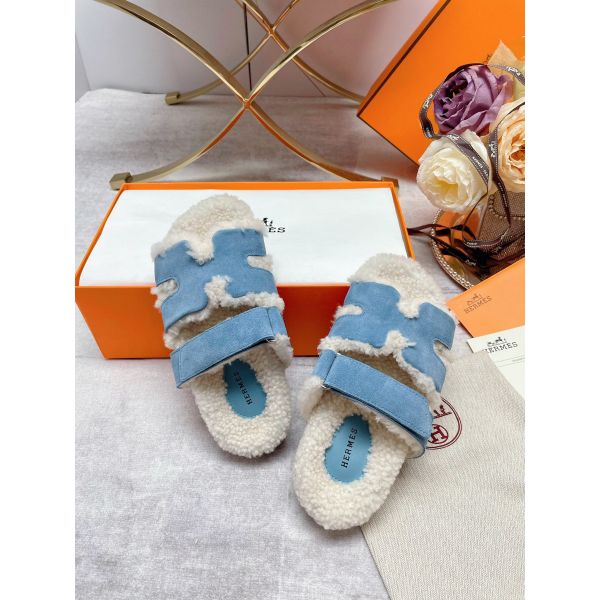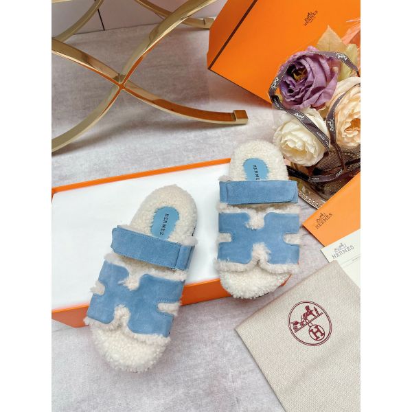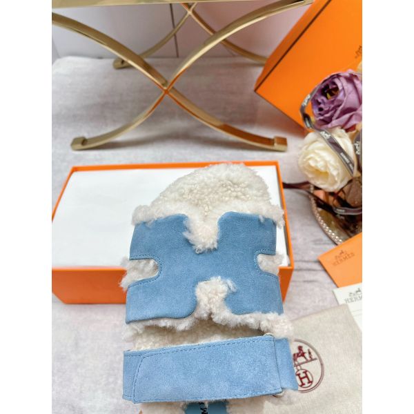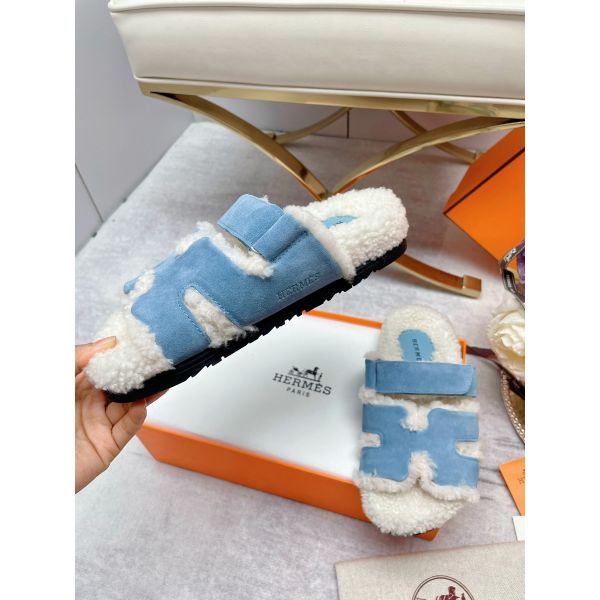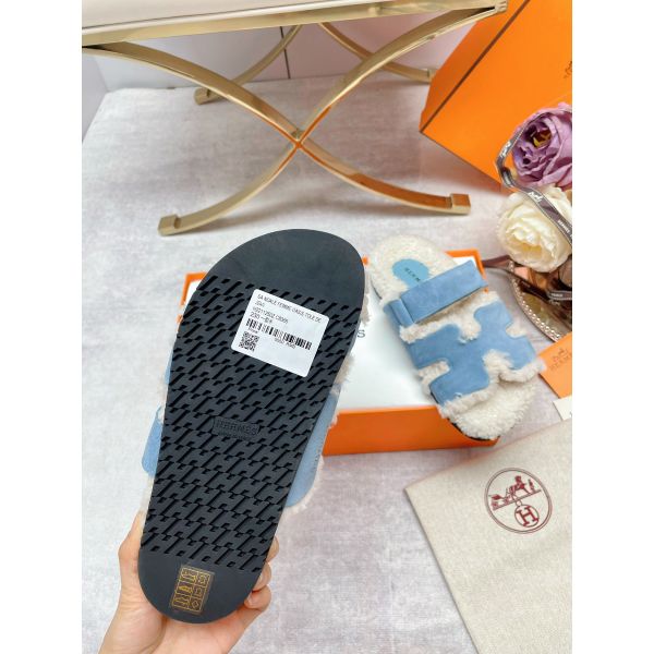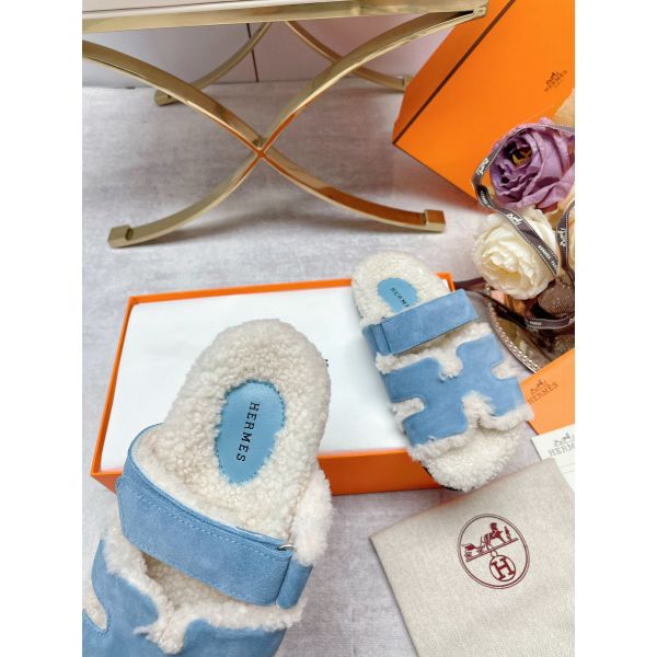 Hermes Women’s Chypre Sandals in Blue Suede with Shearling