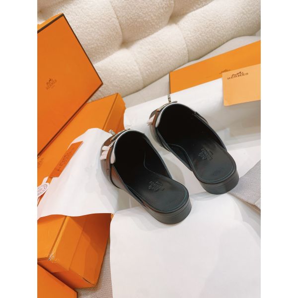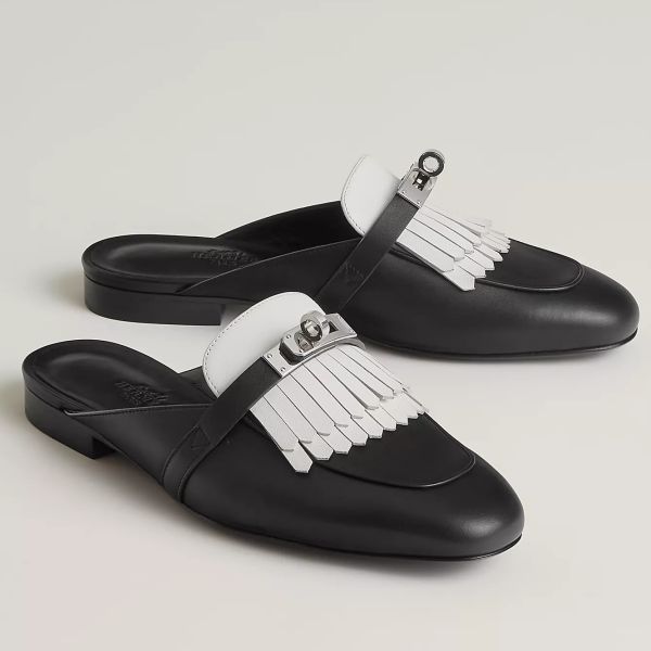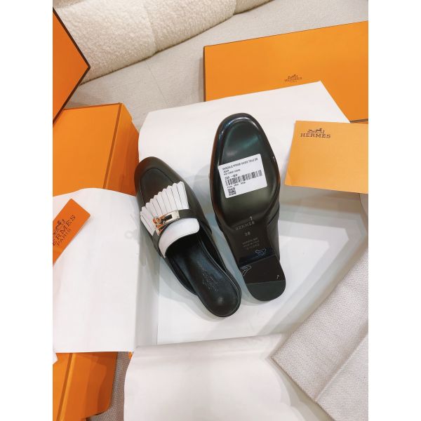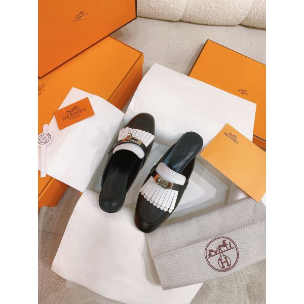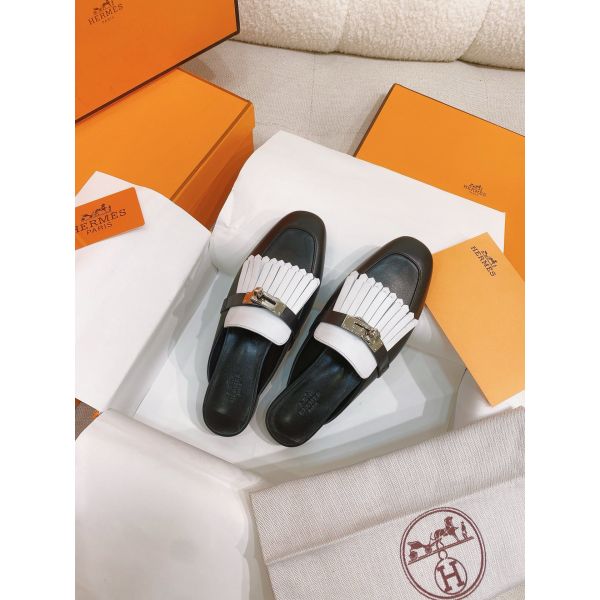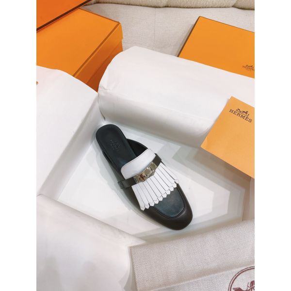 Hermes Women’s Oz Mules with Fringed in Black/White Leather
