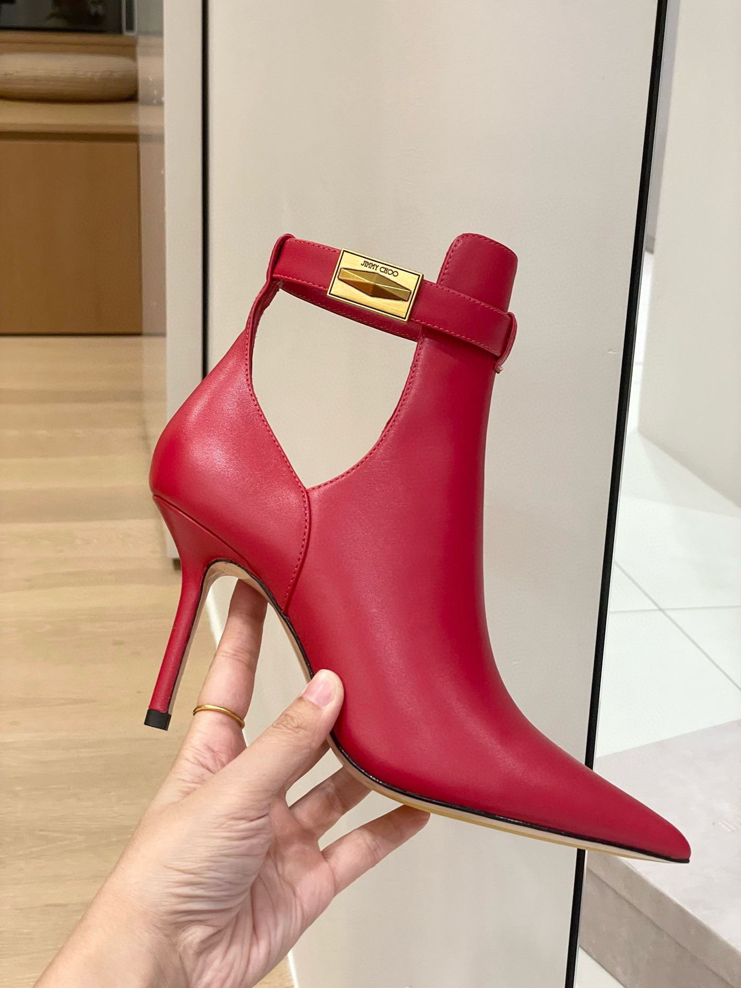 In luxe calf leather, the Jimmy Choo’s Nell ankle boots are designed to a classic pointed-toe silhouette with a slim heel. The cut-out design offers a modern edge and features gold-tone hardware signature to our Diamond collection. Wear to elevate looks with effortless sophistication.
