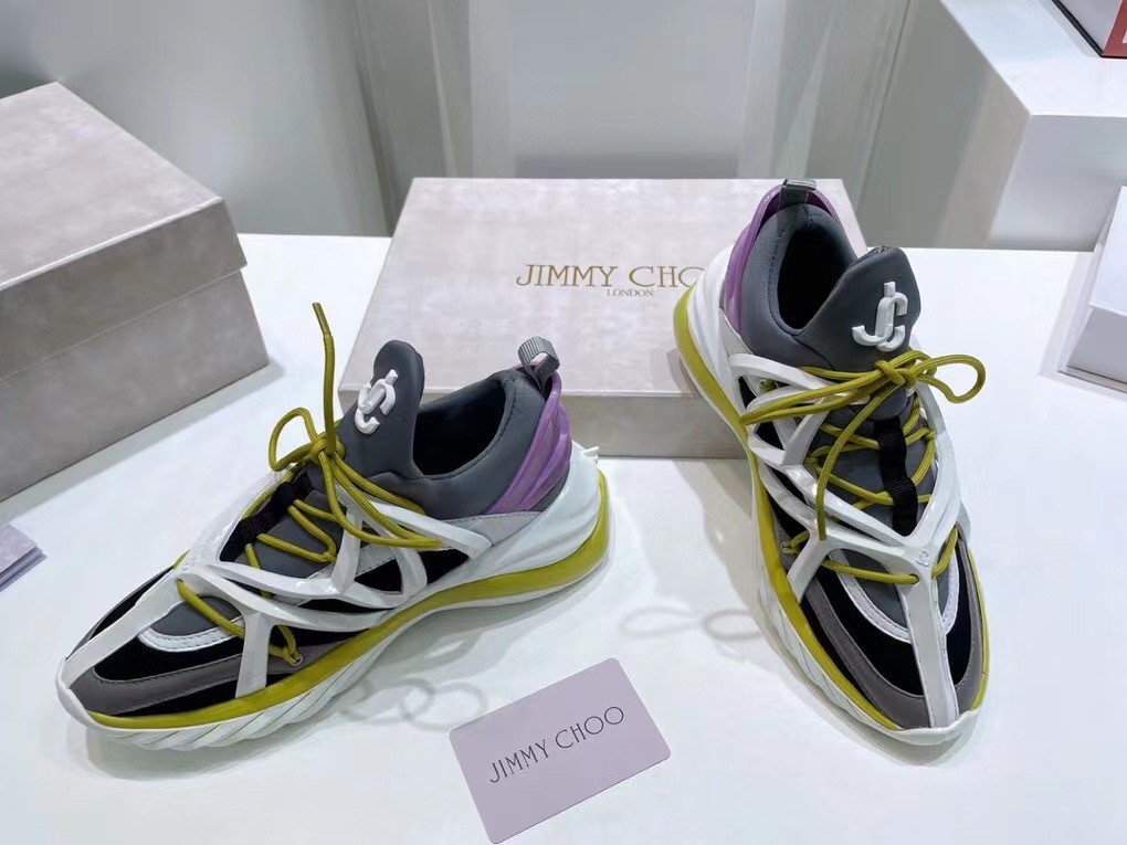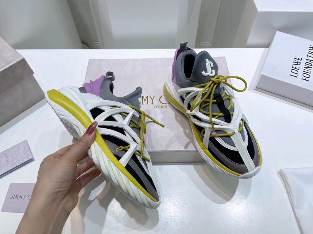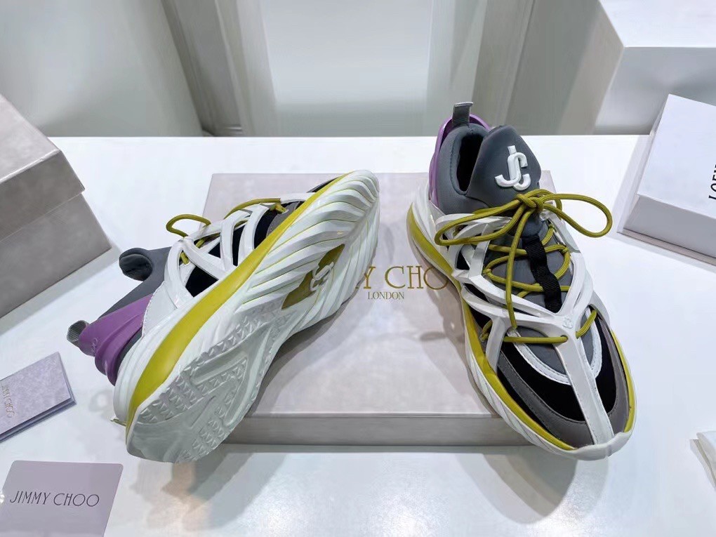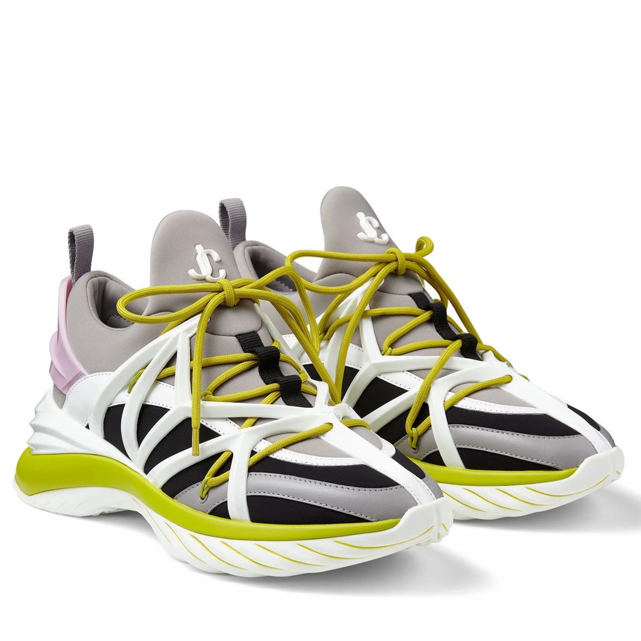 The daring and dynamic COSMOS trainer is crafted in a combination of marl grey, black and white neoprene and leather. Jimmy Choo’s powerful pair features a cage construction inspired by brand’s signature strappy sandals, as well as a pull tab for ease of fit. The white and lime green TPU sole offers a futuristic finish.