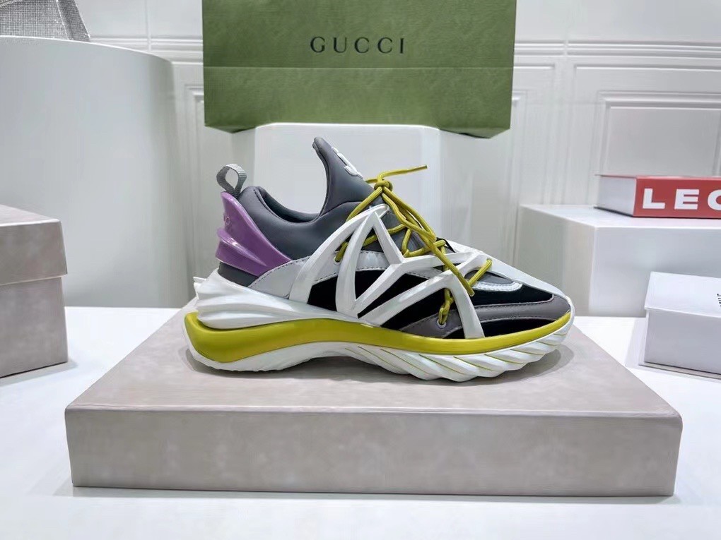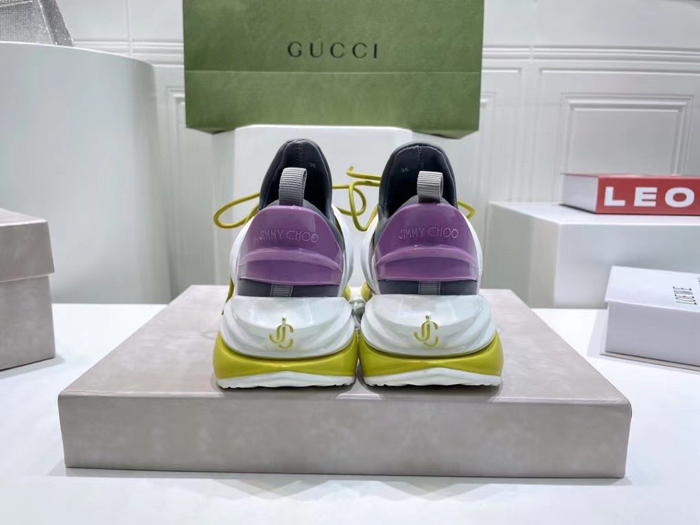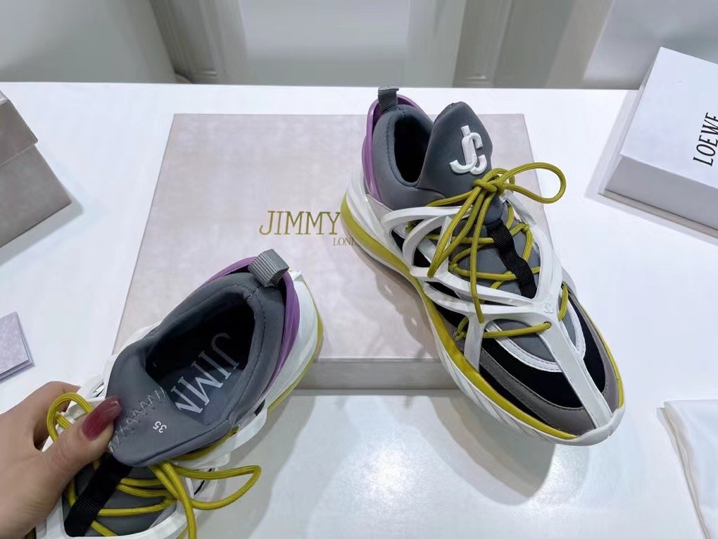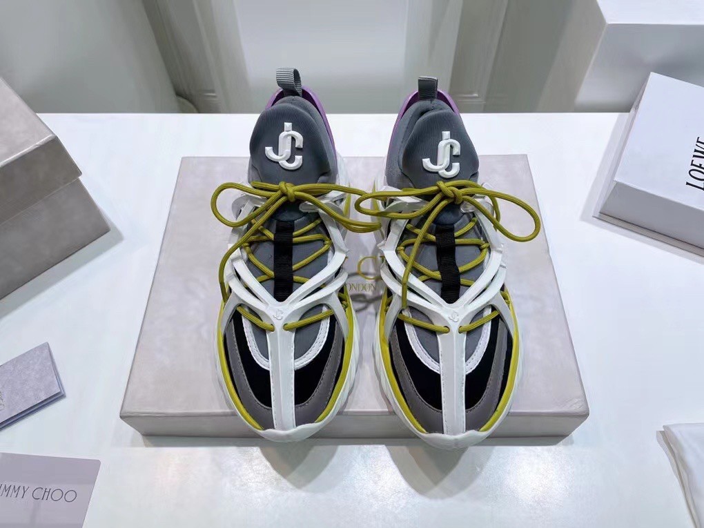 The daring and dynamic COSMOS trainer is crafted in a combination of marl grey, black and white neoprene and leather. Jimmy Choo’s powerful pair features a cage construction inspired by brand’s signature strappy sandals, as well as a pull tab for ease of fit. The white and lime green TPU sole offers a futuristic finish.