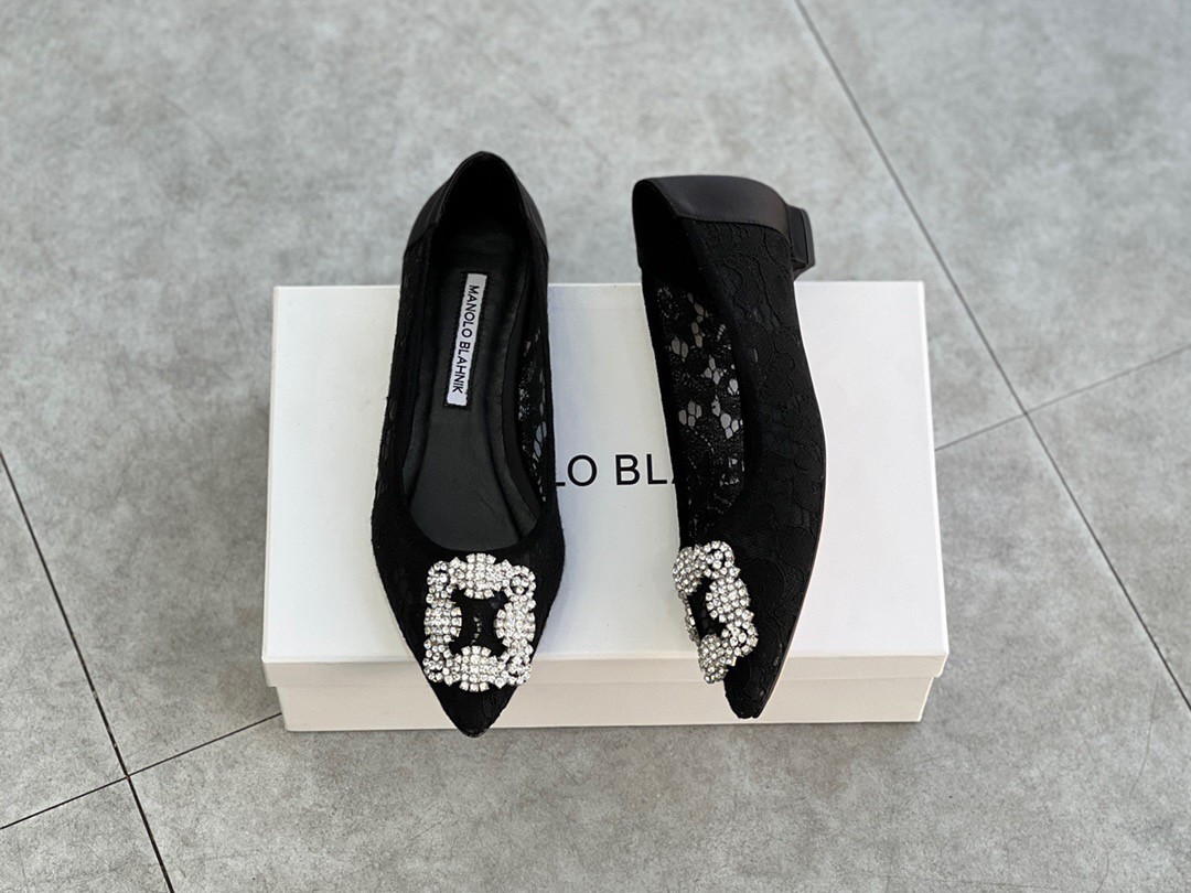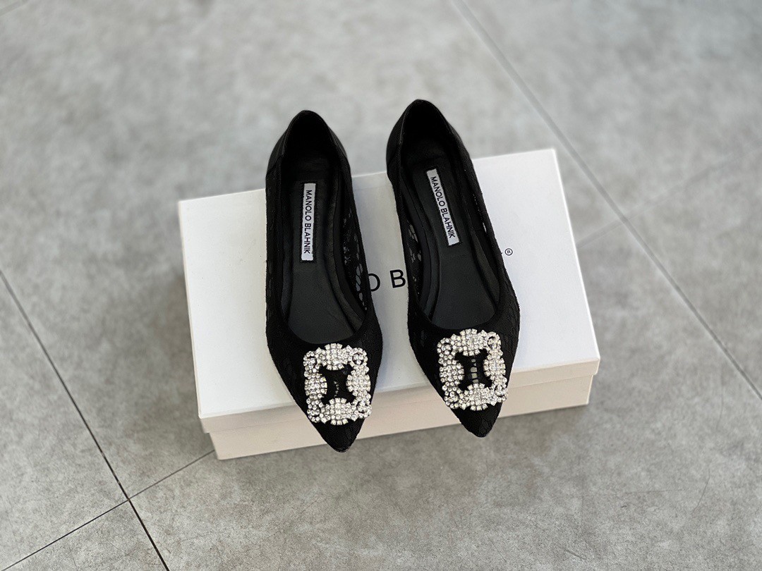 A design that redefines comfort and stunning style together, these Manolo Blahnik Hangisi ballet flats are truly attractive. These have been crafted in lace and feature a gorgeous silver-tone crystal-studded buckle detailing the pointed toes.