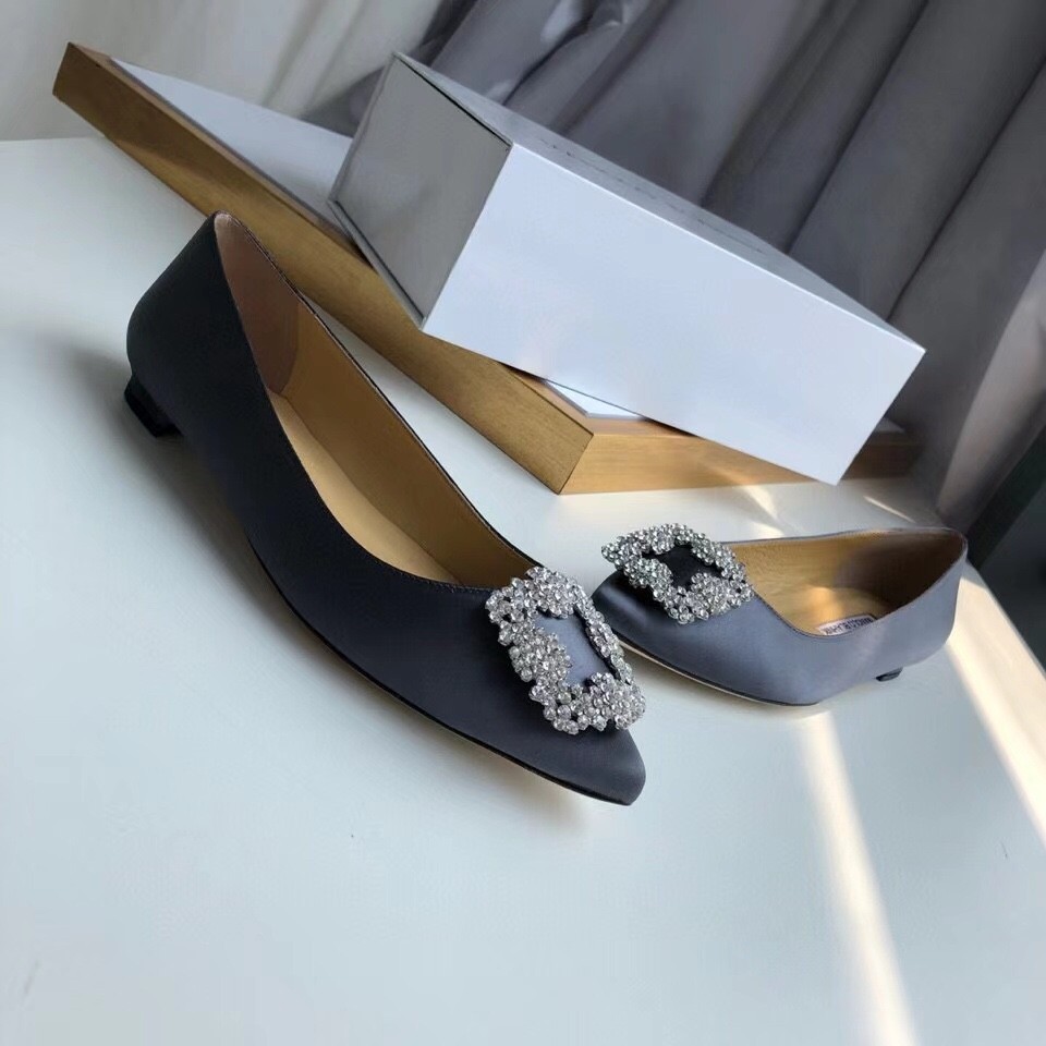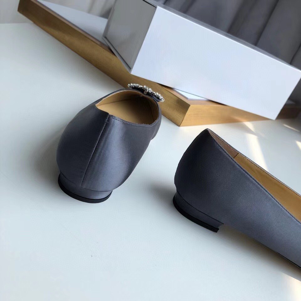 Manolo Blahnik Hangisi Flats In Navy Satin with Crystal Buckle