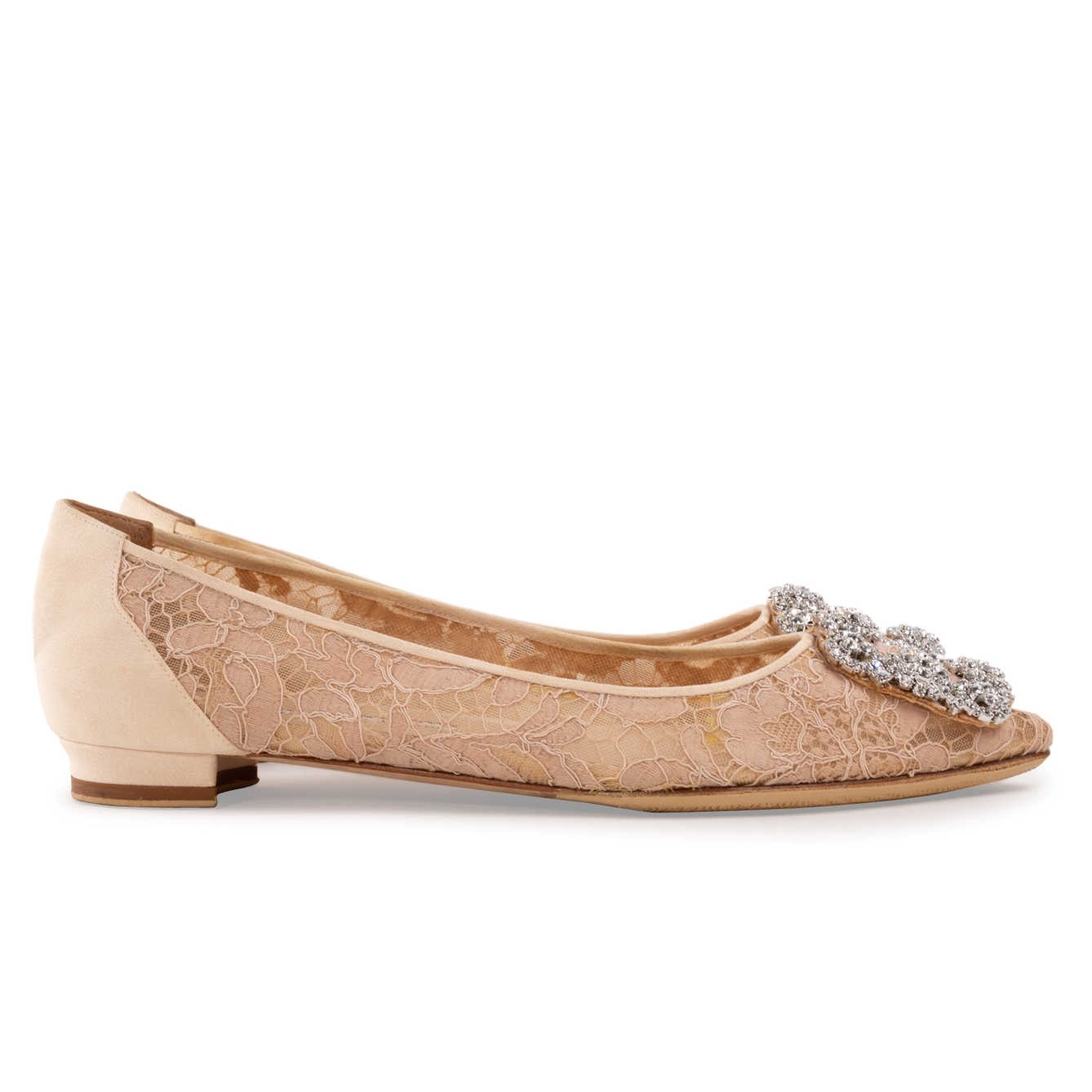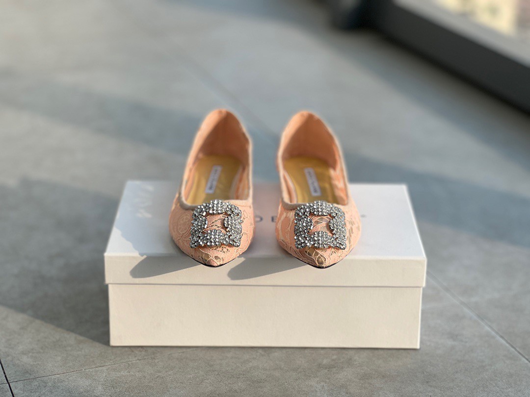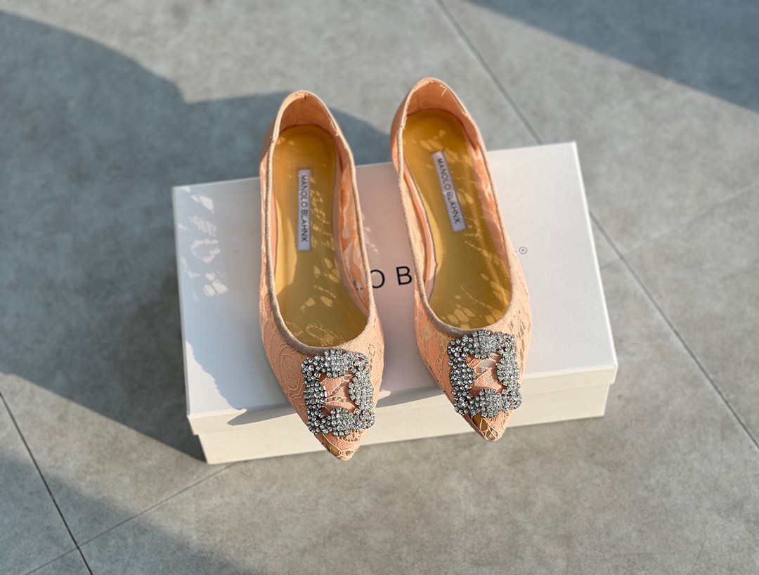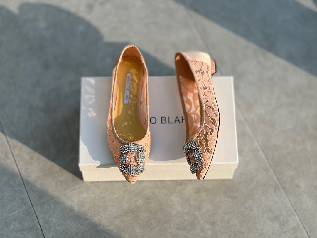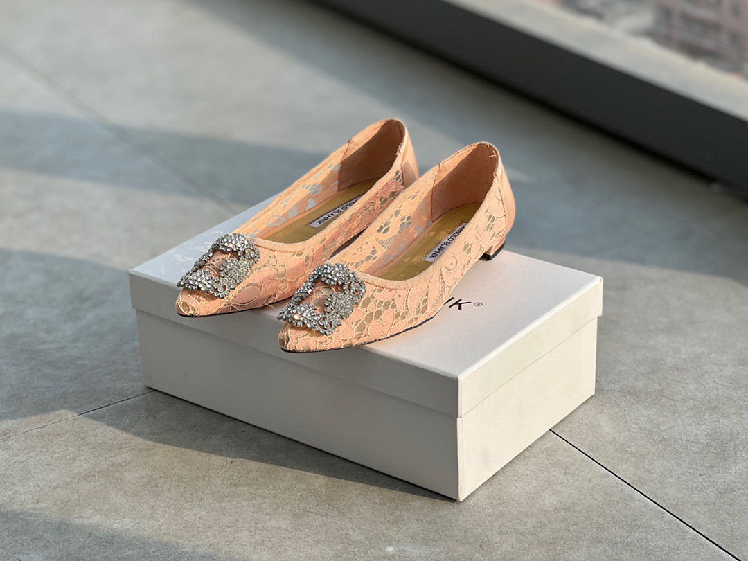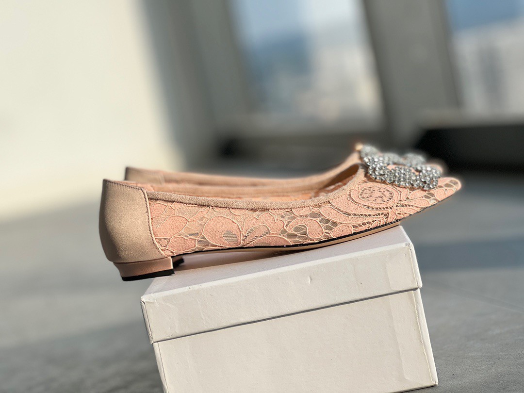 A design that redefines comfort and stunning style together, these Manolo Blahnik Hangisi ballet flats are truly attractive. These have been crafted in lace and feature a gorgeous silver-tone crystal-studded buckle detailing the pointed toes.