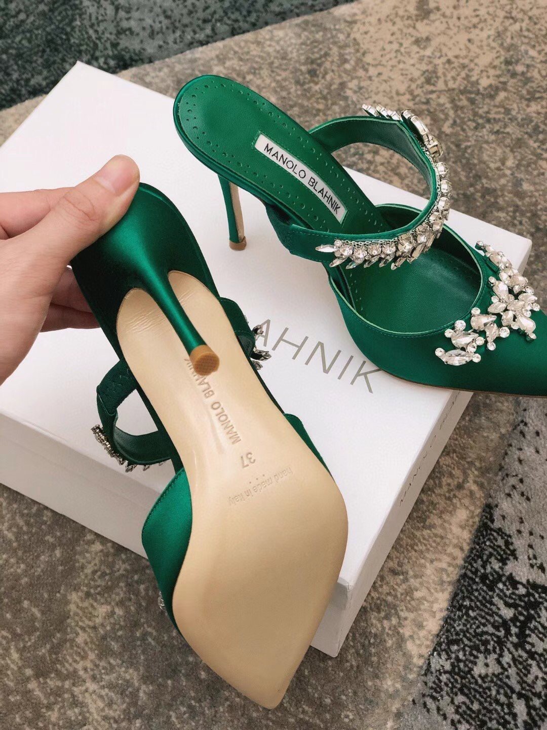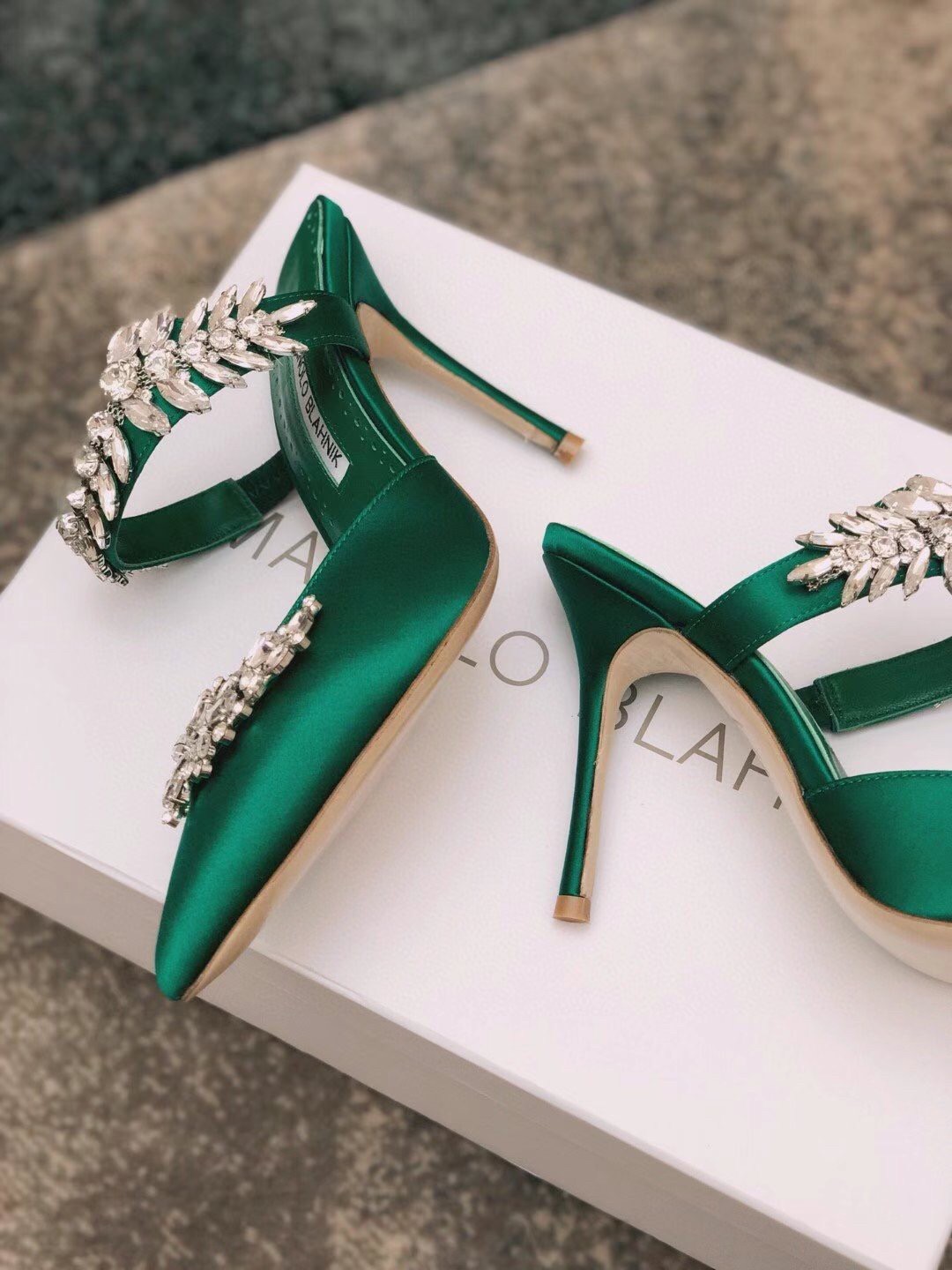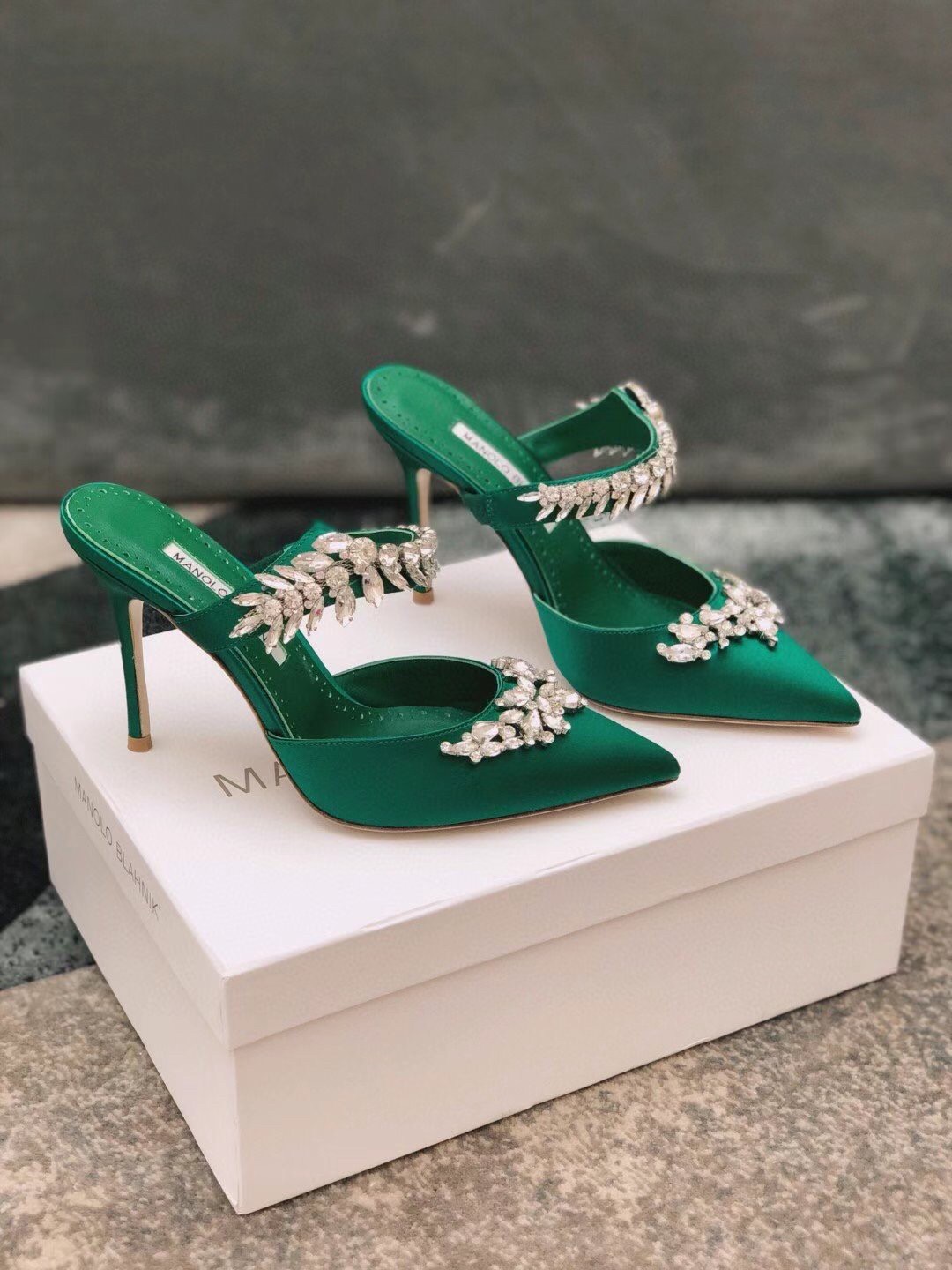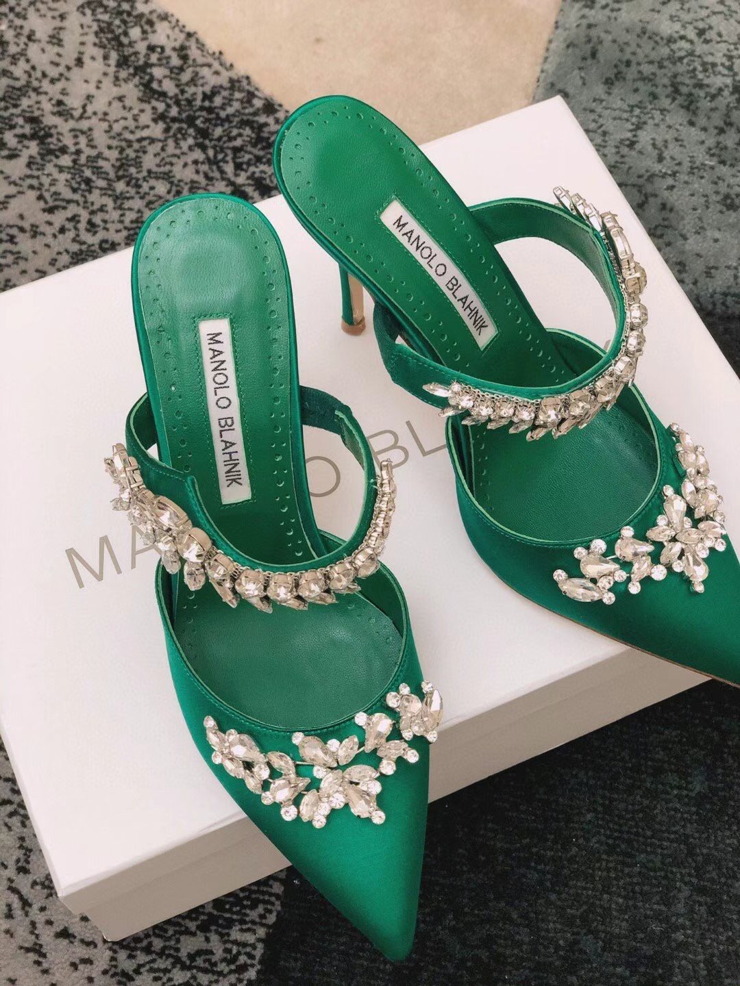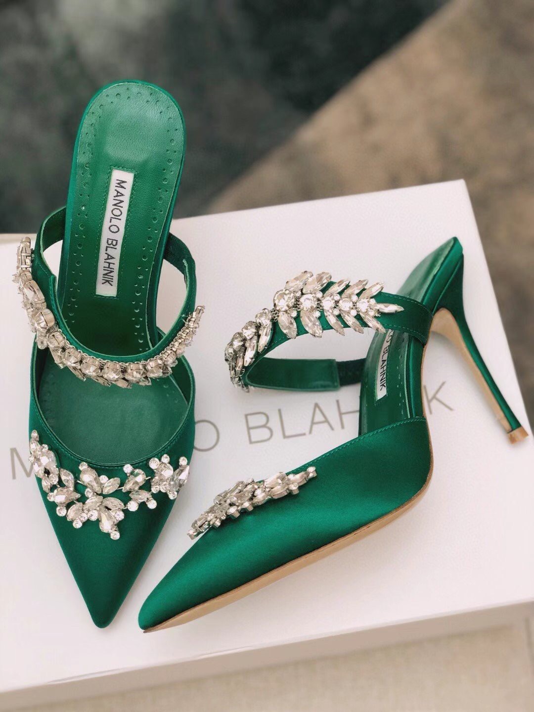 Manolo Blahnik Lurum Crystal 90mm Mules In Green Satin