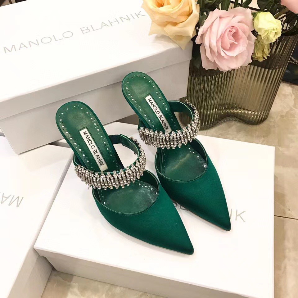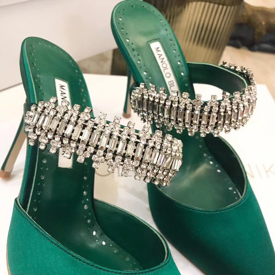 Manolo Blahnik Lutara Crystal 90mm Mules In Green Satin