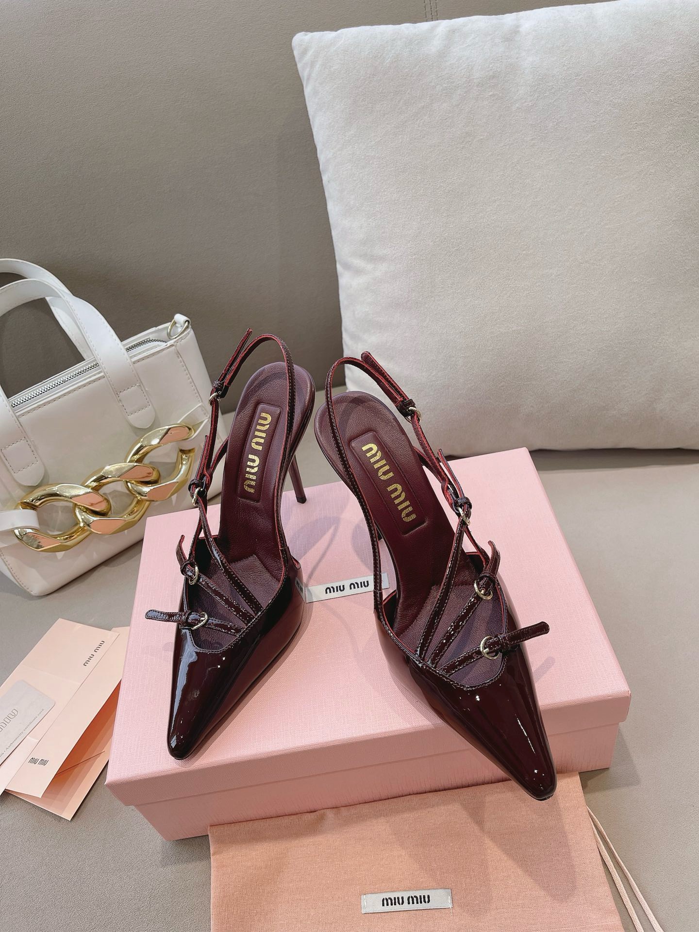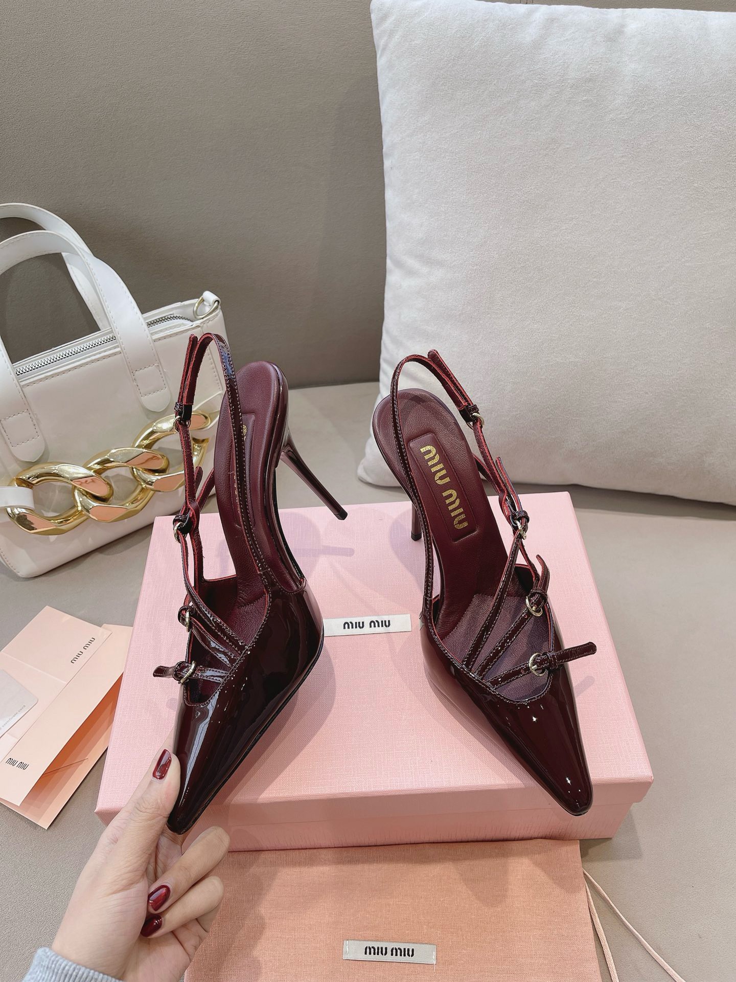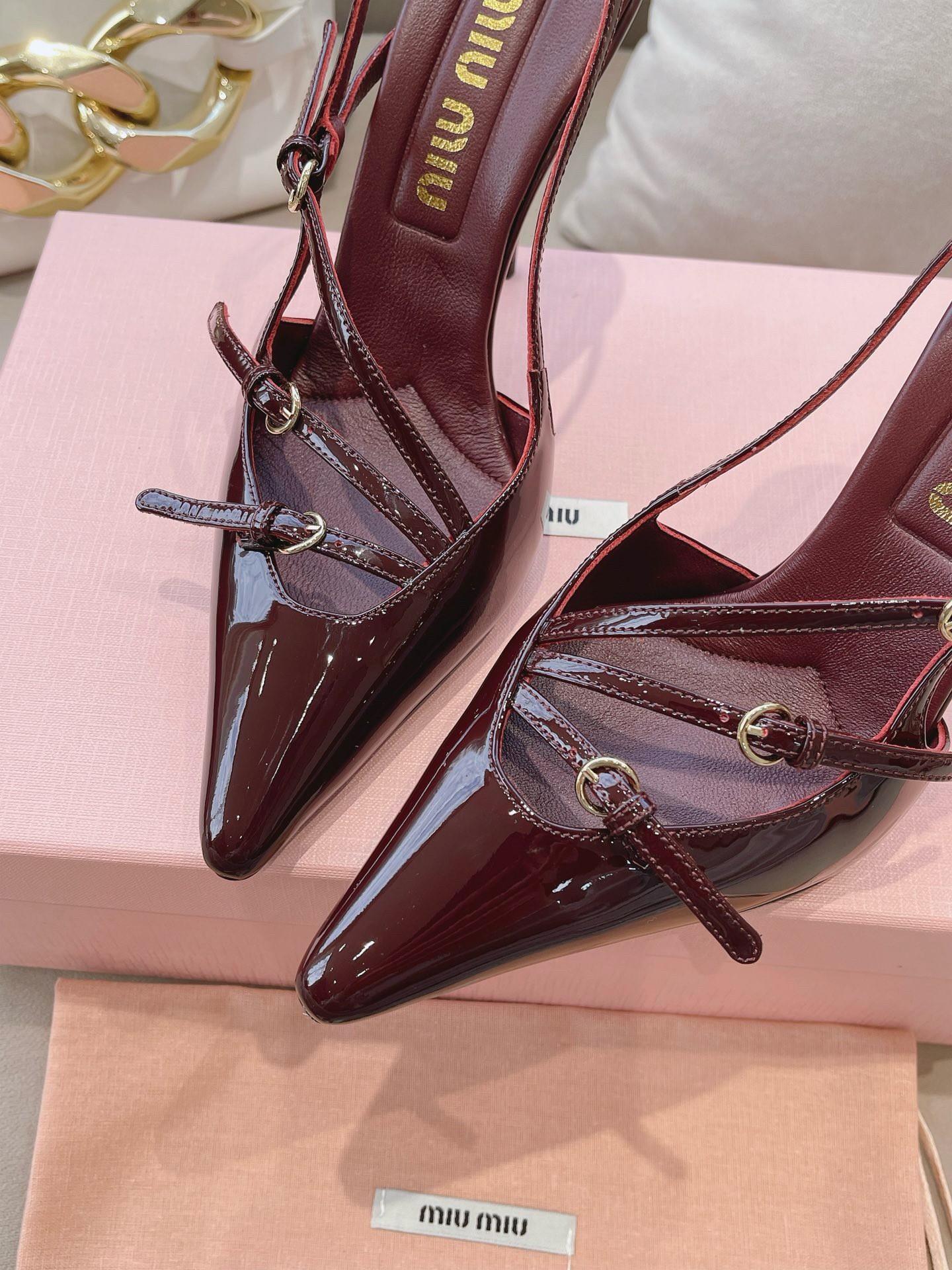 A classic style meets Miu Miu’s rebellious soul in these patent leather slingbacks. The buckles introduce a refined contrast and add an irreverent touch to the shoe, giving it a strong personality.