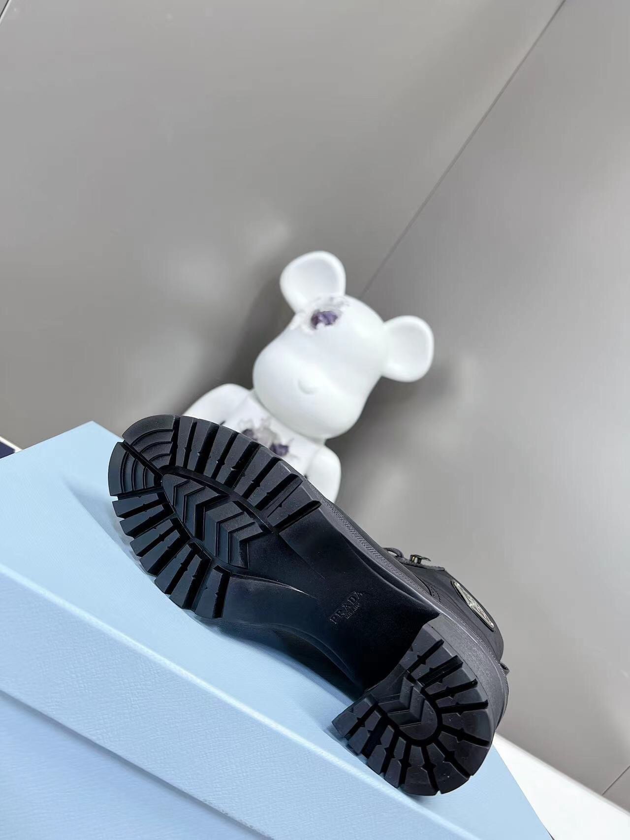 A strong, decisive character characterizes these brushed leather and nylon fabric lace-up booties. The two materials are combined in a mix that embodies Prada’s stylistic codes. The triangle logo embellishes this footwear, completed by the lug tread sole.