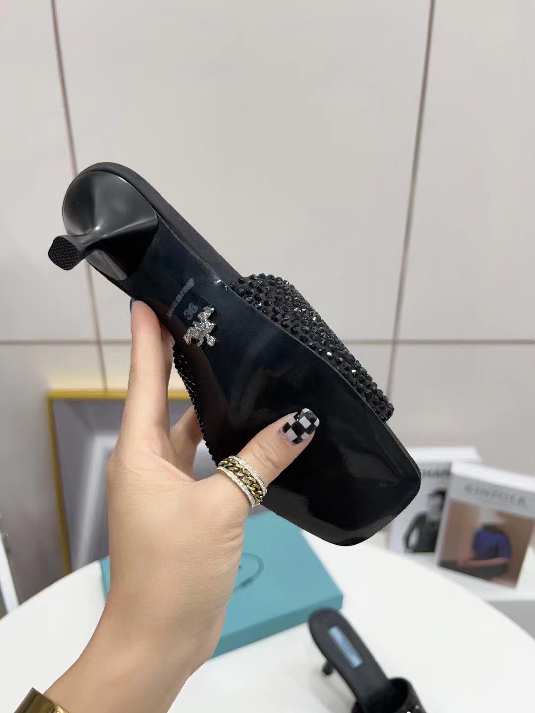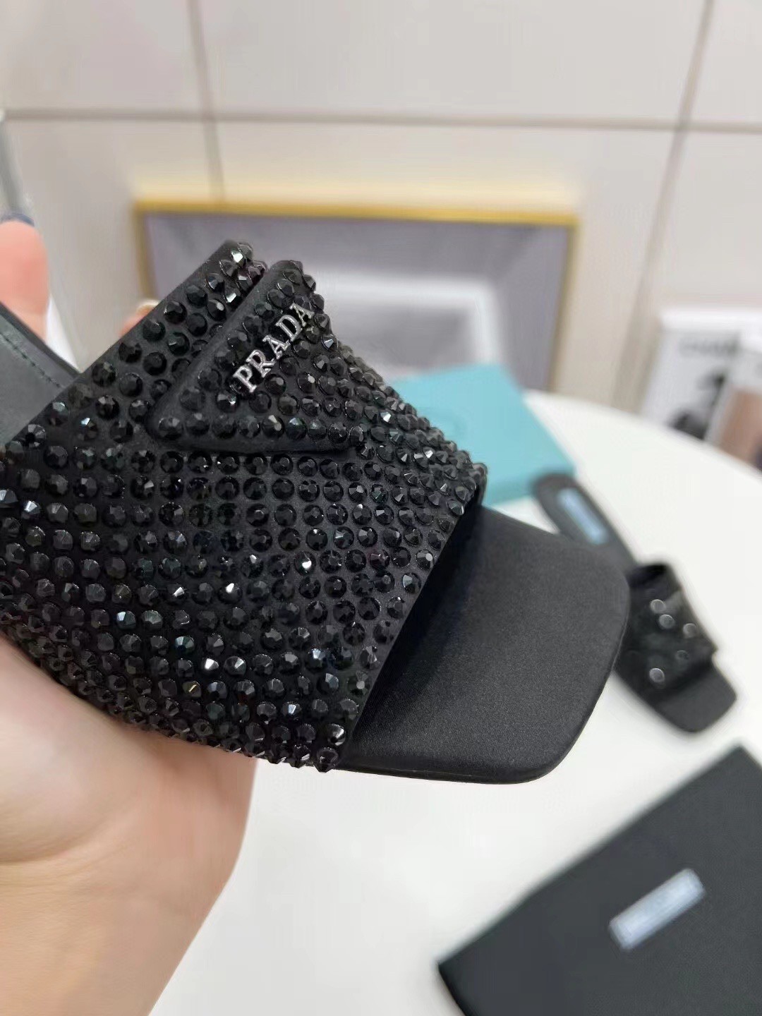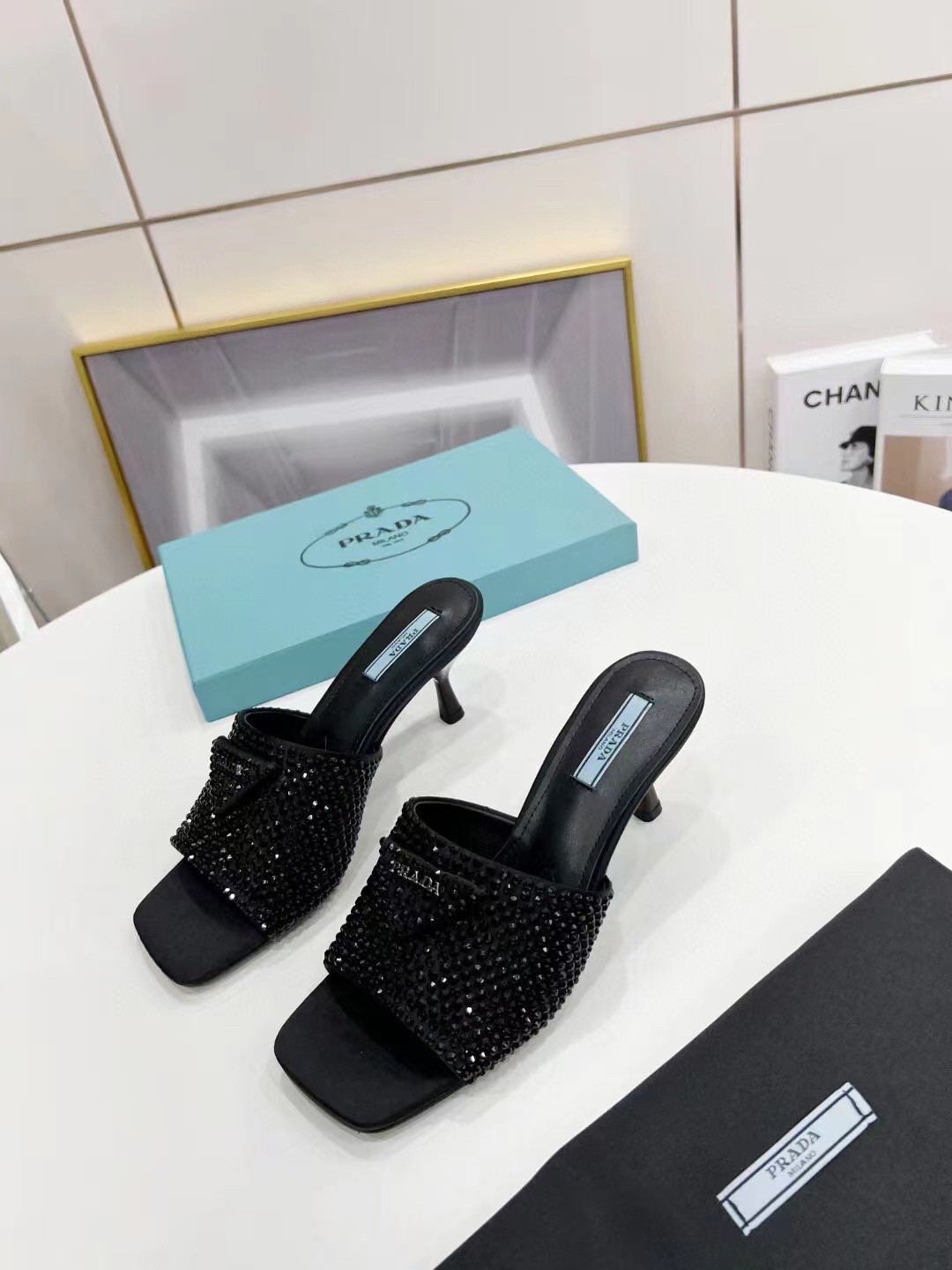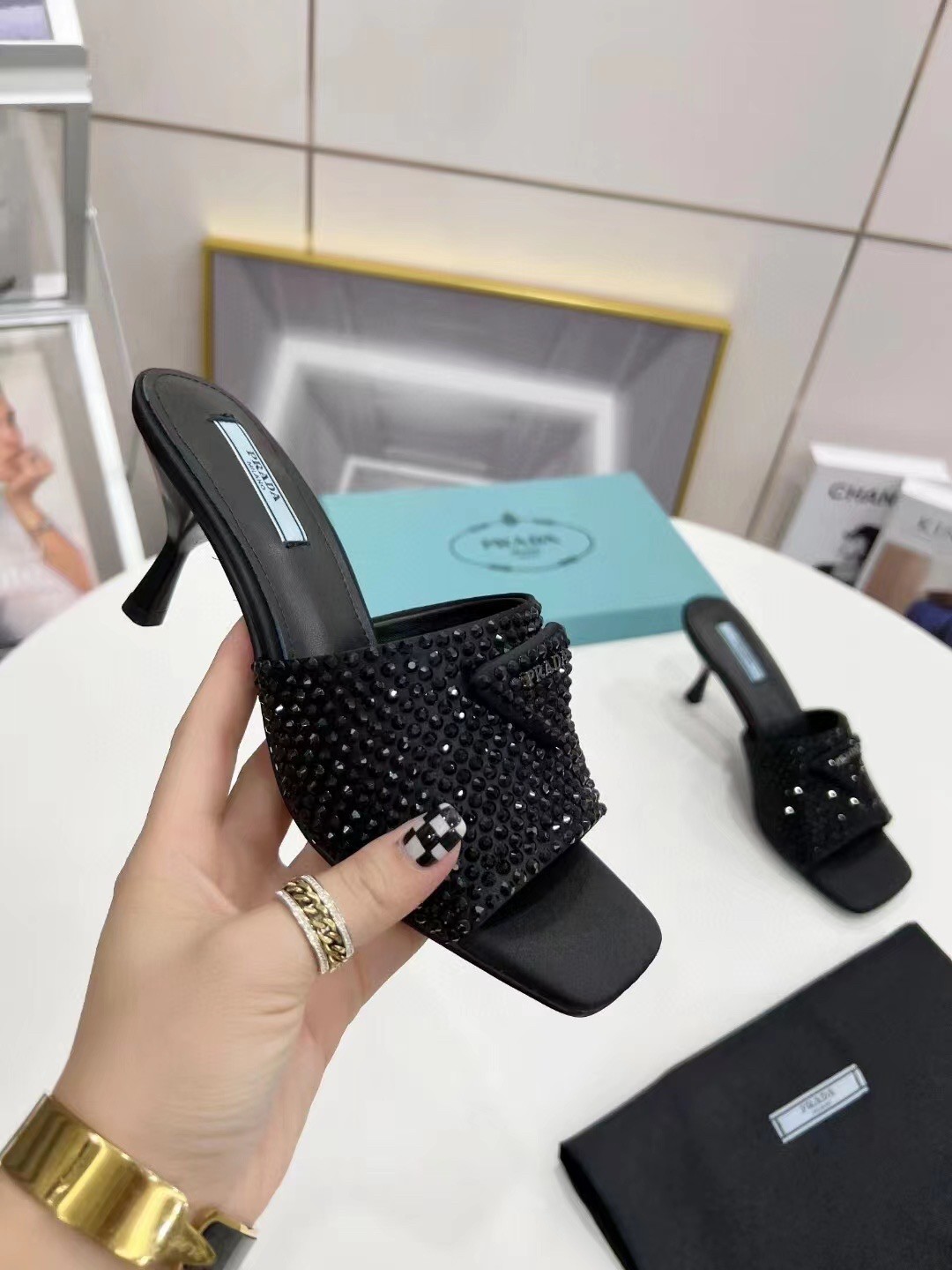 These captivating sandals from Prada will add an element of glamour to your evening looks. The mule design is placed on petite heels and the black crystal-embellished toe strap is accented with the label’s signature triangles.