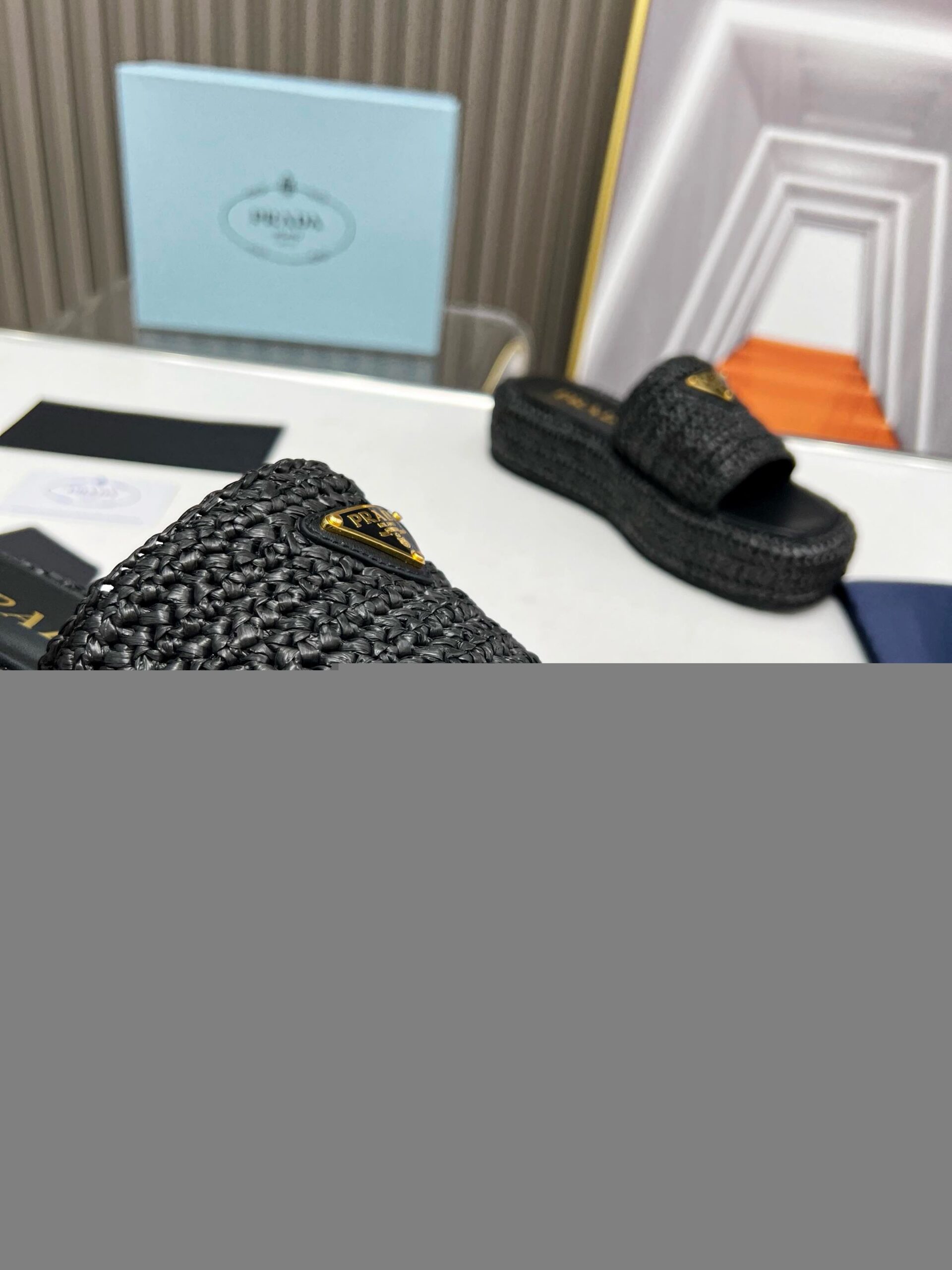 Prada Crochet Flatform Slides in Black Raffia-effect Yarn