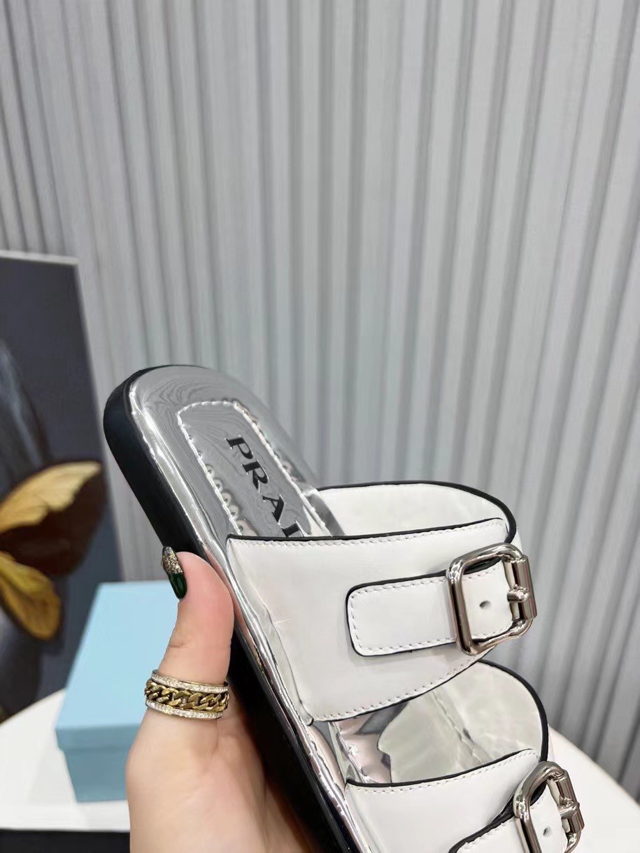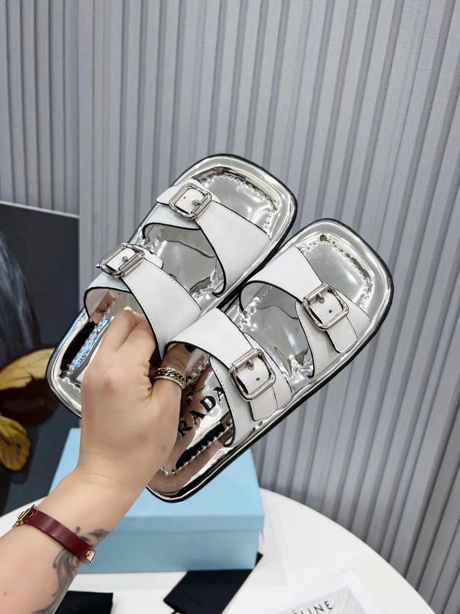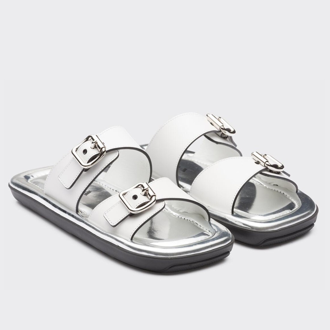This flat rectangular sandal drawing inspiration from ’70s shapes recalls an historic archive style and plays with graphic and geometric elements that have always characterized Prada imagery. The insole comes in silver metallic leather, adding an unusual contrast. The design with metal buckles is completed by the innovative, ultra-light EVA sole.