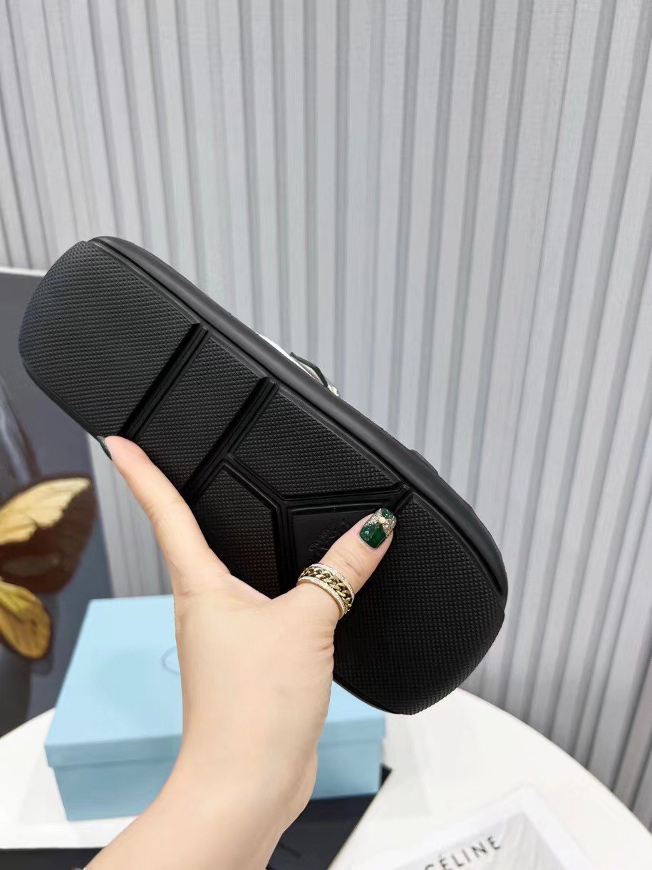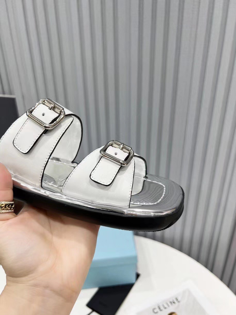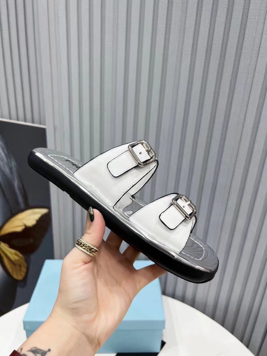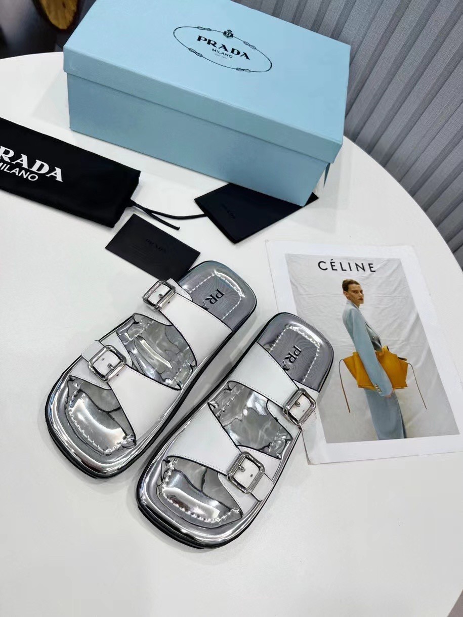 This flat rectangular sandal drawing inspiration from ’70s shapes recalls an historic archive style and plays with graphic and geometric elements that have always characterized Prada imagery. The insole comes in silver metallic leather, adding an unusual contrast. The design with metal buckles is completed by the innovative, ultra-light EVA sole.