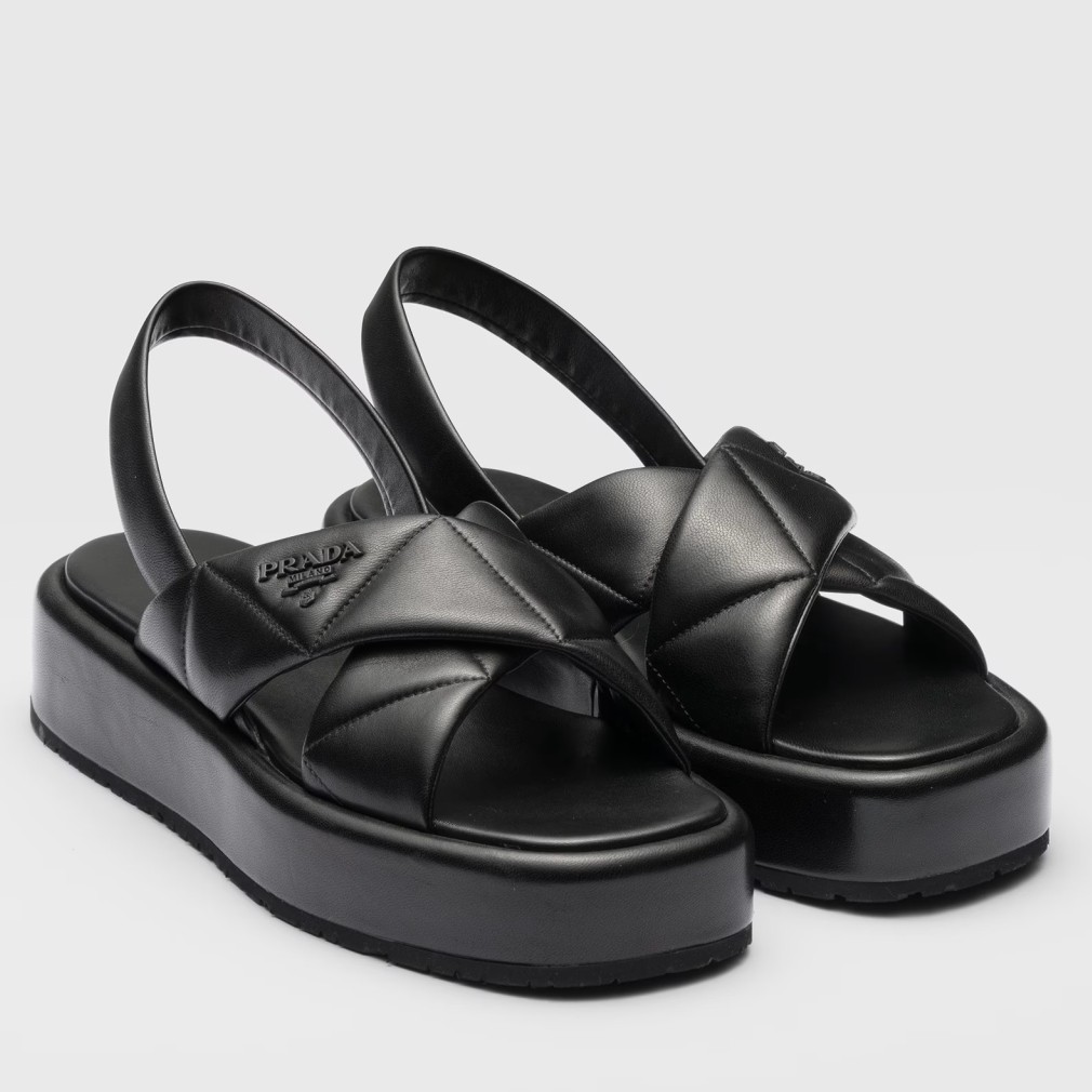 Volume, soft lines and references to the 90s define these sandals on a leather-covered flatform sole. The iconic Prada triangle is echoed in the quilted motif of the soft nappa leather of these sandals accented by the lettering logo.